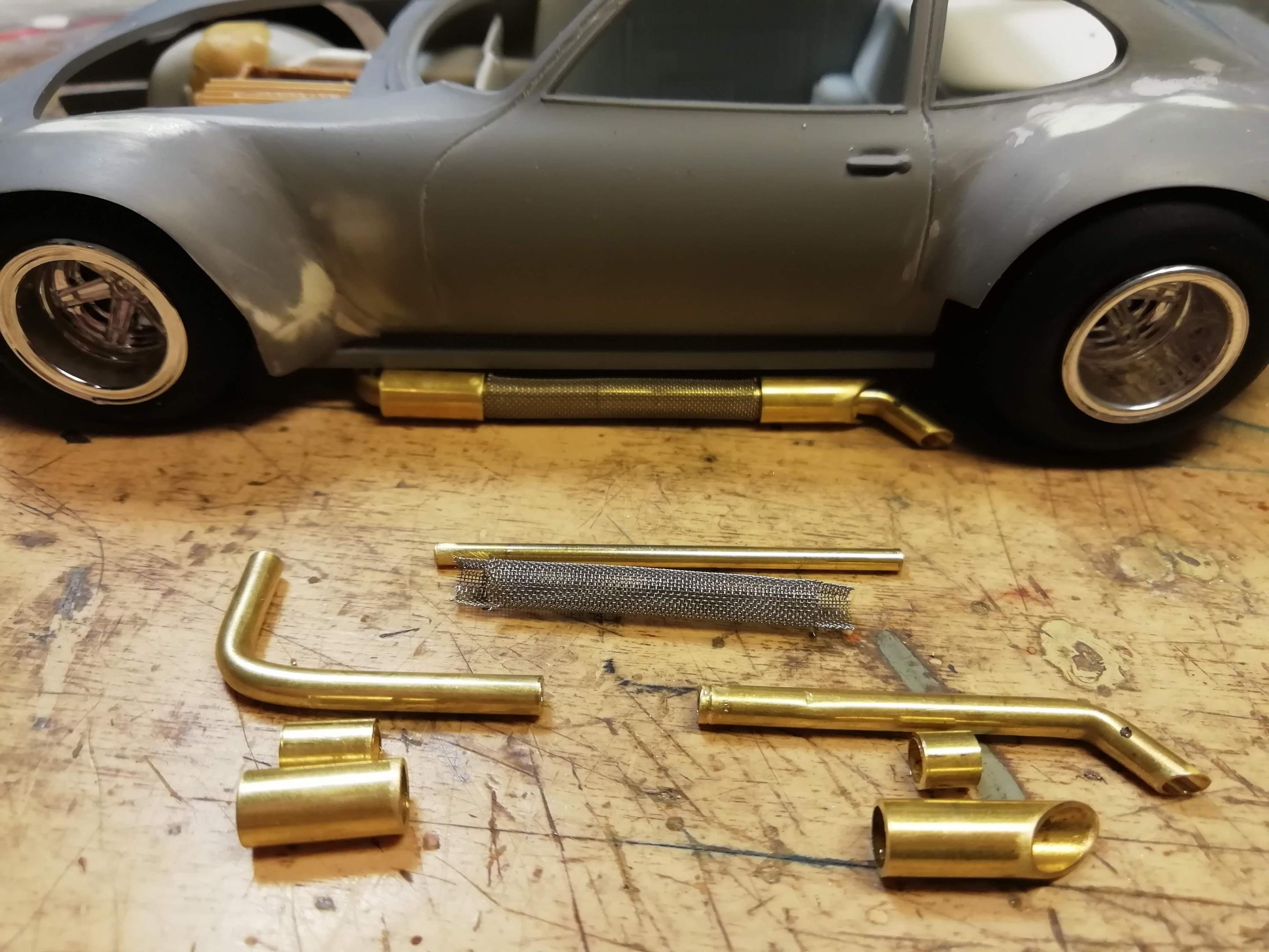 Couple of weeks ago, I saw this Dodge sporting nice oval shaped exhaust pipes. It got me thinkering, how can I make similar and realistic ones to scale models. Since I wanted pipes to be pipes, I tried heating radio antenna, and making it oval shaped. Kinda easy process, but hard to make two similar ones. Also hard to make longer section. Also you have to make the transition to normal exhaust pipe size. Of course, if you only need piping section to underneath the car, you can shape some round rod to oval rod. Then I remembered, that I had made some experiments of exhaust tips before. -Cutting round tube to half and widening it. Hard to make super smooth. I think this is the way Nascar boom tubes are made. Could be wrong. -Pie cutting tube and making it pointing down. -Using radio antenna with pipe bender. It has too small wall thickness, so it wants to crumble. If stopped at the right moment, it could be snapped into two pieces. I can create two identical ovalish shapes. -Heated and drilled exhaust tip from parts sprue. Hard to make wall thickness realistic, and you could see the inside being not hollow. There is also sometimes oval exhaust tips in kits. I like to use real pipe on my exhausts, because it adds realism. It is also one of my favourite parts when modifying cars. I hate some of the kits, when exhaust is molded shut. You could drill those ends open, but I find it difficult. Centering the hole, getting wall thickness right. Those things. When the tips are not round, it gets even harder. Carving an oval hole. Not going to be clean. Almost every time I change at least the round tips, to hollow ones. I like using radio antennas and electric wire crimps. You could even use crimps with the plastic things on, to have some interestign shapes. Crimps could also be used as intake funnels. -What kind of methods have you used when building interesting exhaust pipes/tips/heatshieds? -Have you tried to make Nascar boom tubes?
