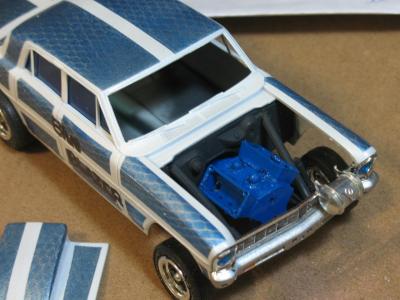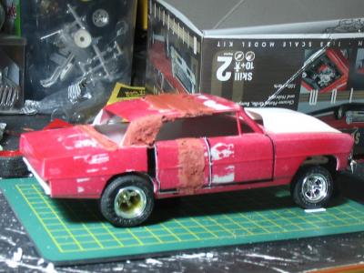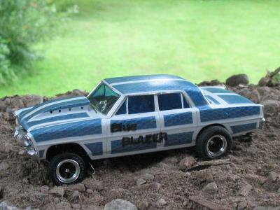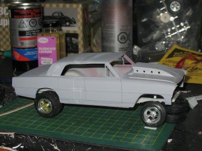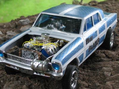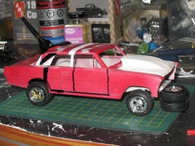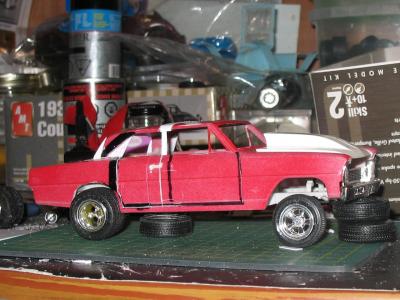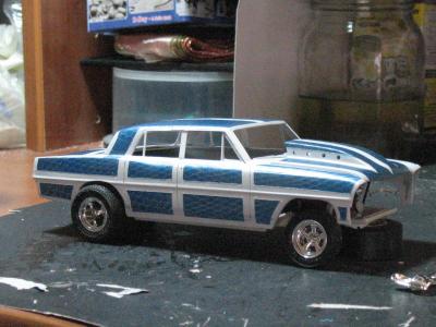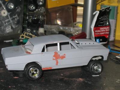 I bought this kit a few years back, someone had started it by kinda painting the body. I decided to make a four door gasser out of it. Had to stretch the roof a 1/4 inch and adding plastic to the C- Pillar. Resin hood, and added a thin piece of plastic just behind the rear window, and added a B- Pillar.
