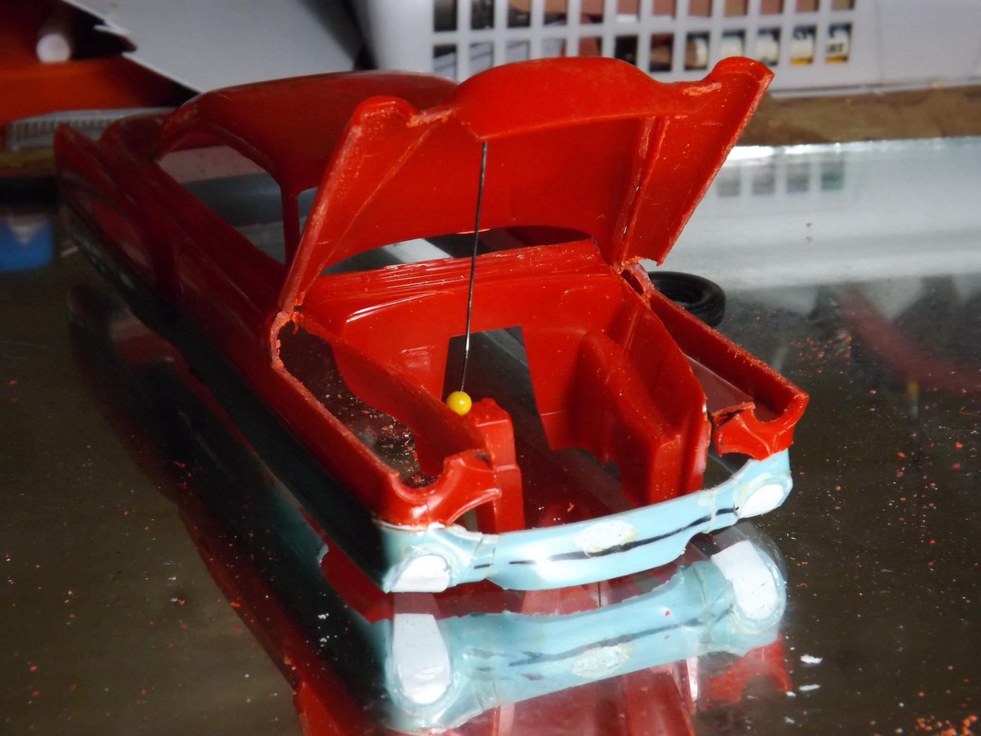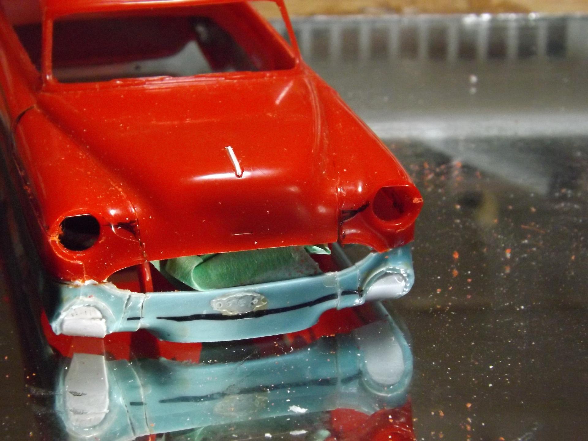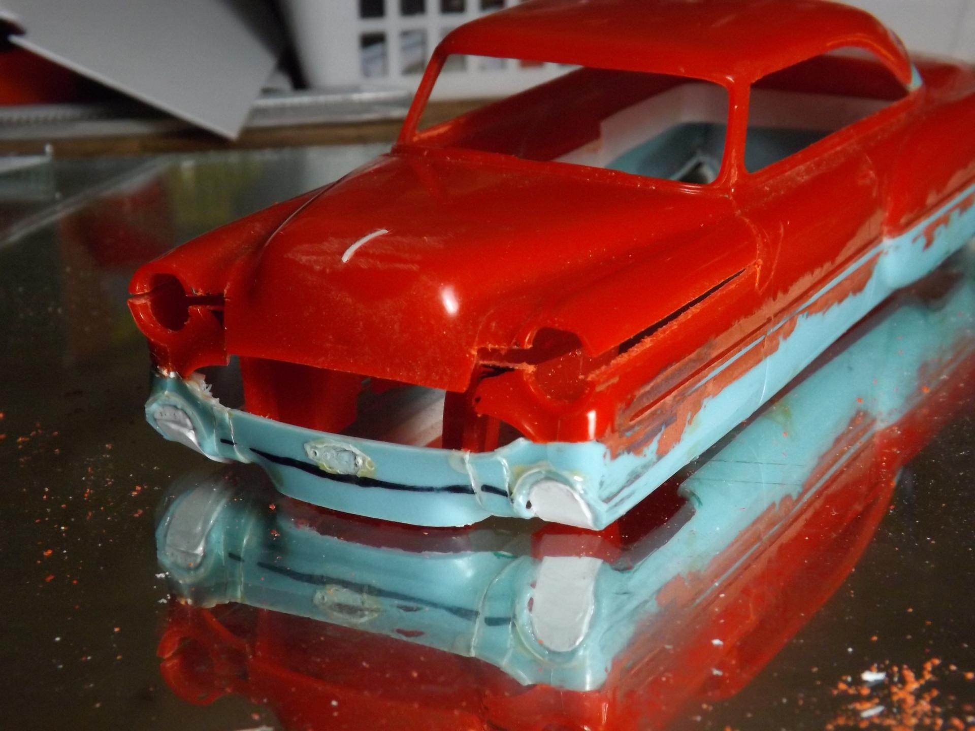 I started this custom around a year ago but didn't know where to go next with it, so I put it back in the box and last week I pulled it out and started it again. I wish I had taken pictures from the beginning but it is what it is. Now this is where I am now, I had two 53 Chevy's one blue one was a glue bomb and the other was a sealed kit. I started last year by cutting them both at the belt line and gluing the two top half's together. Yesterday I started to do some more cutting after I glued the hood to the fenders and the cut the tops off. A lot of other little things have been done, so have a look and tell me what you think. I will continue to take pictures on the progress.