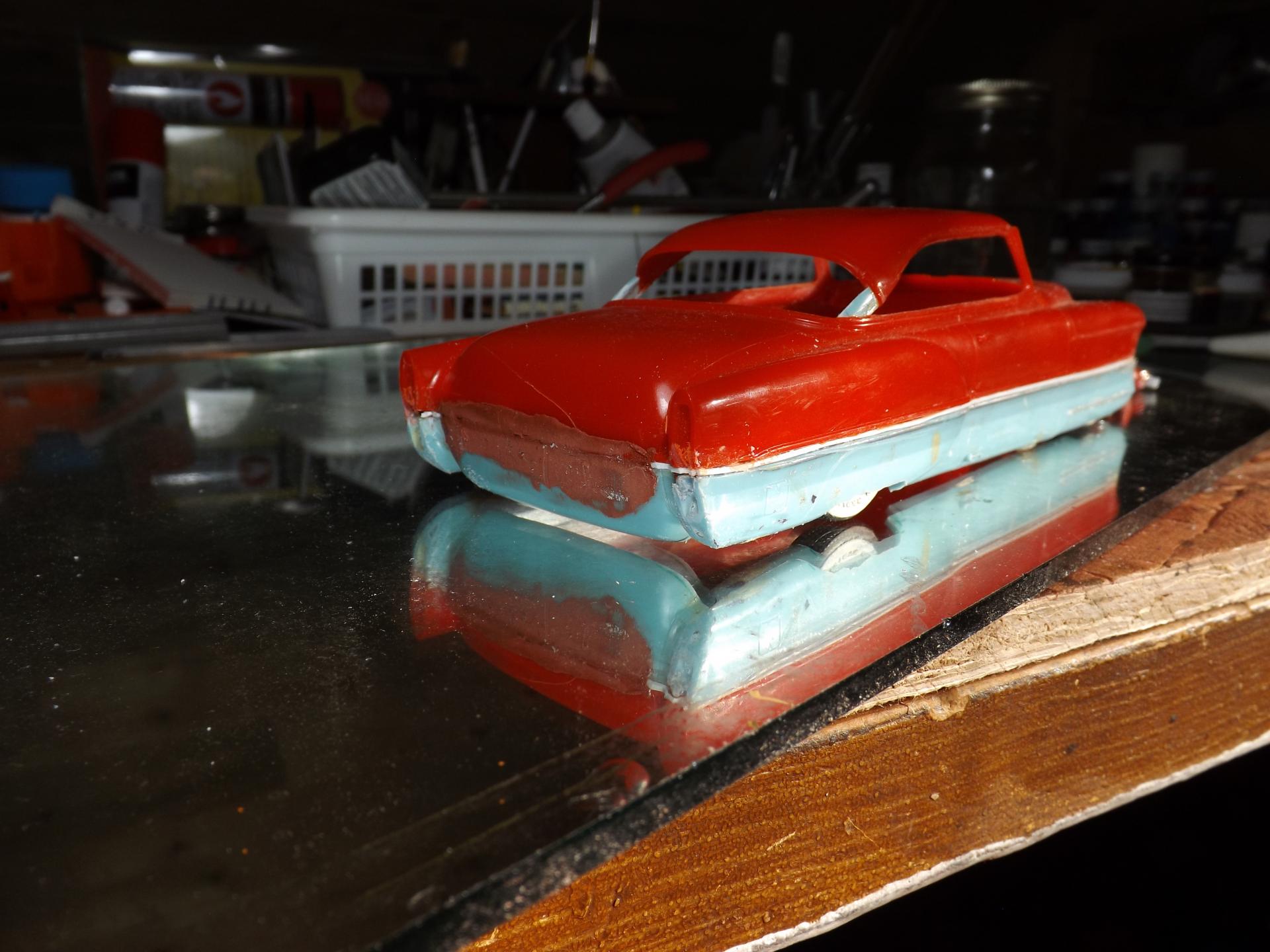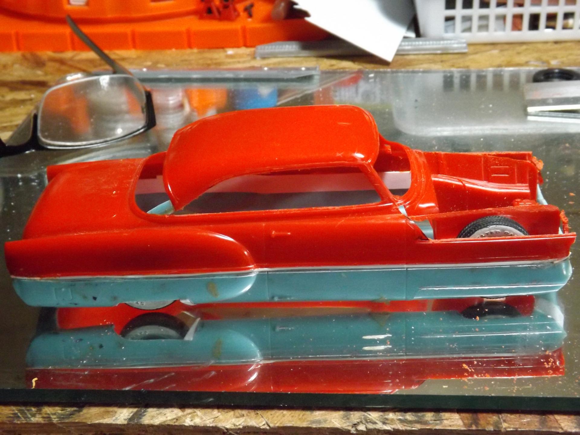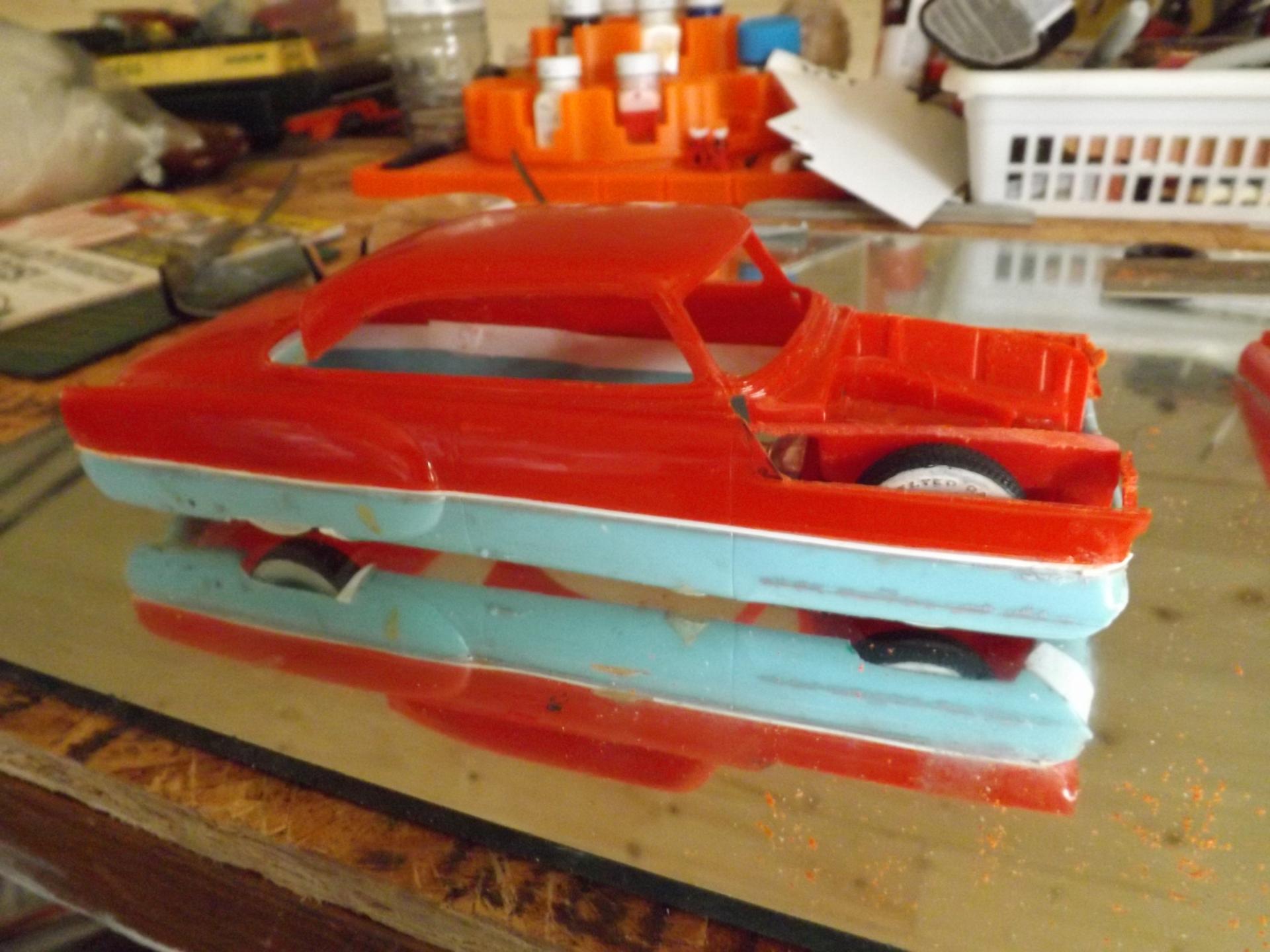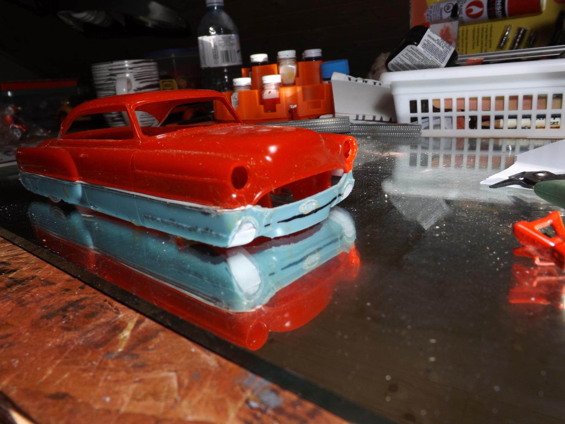 I started this custom around a year ago but didn't know where to go next with it, so I put it back in the box and last week I pulled it out and started it again. I wish I had taken pictures from the beginning but it is what it is. Now this is where I am now, I had two 53 Chevy's one blue one was a glue bomb and the other was a sealed kit. I started last year by cutting them both at the belt line and gluing the two top half's together. Yesterday I started to do some more cutting after I glued the hood to the fenders and the cut the tops off. A lot of other little things have been done, so have a look and tell me what you think. I will continue to take pictures on the progress.
