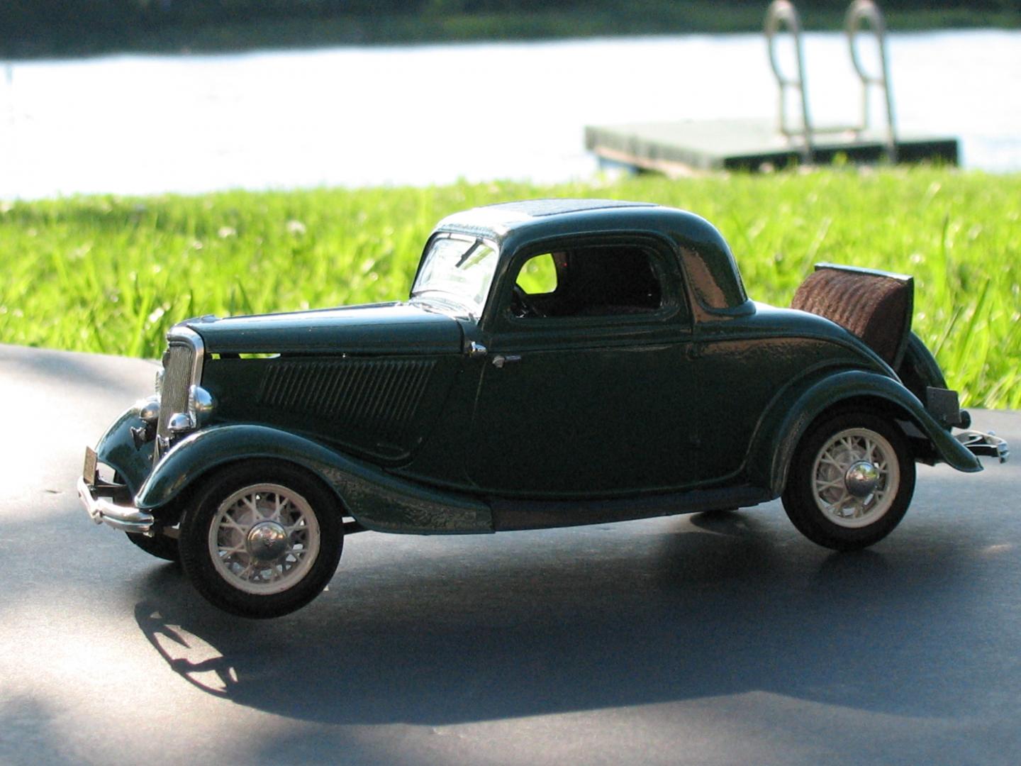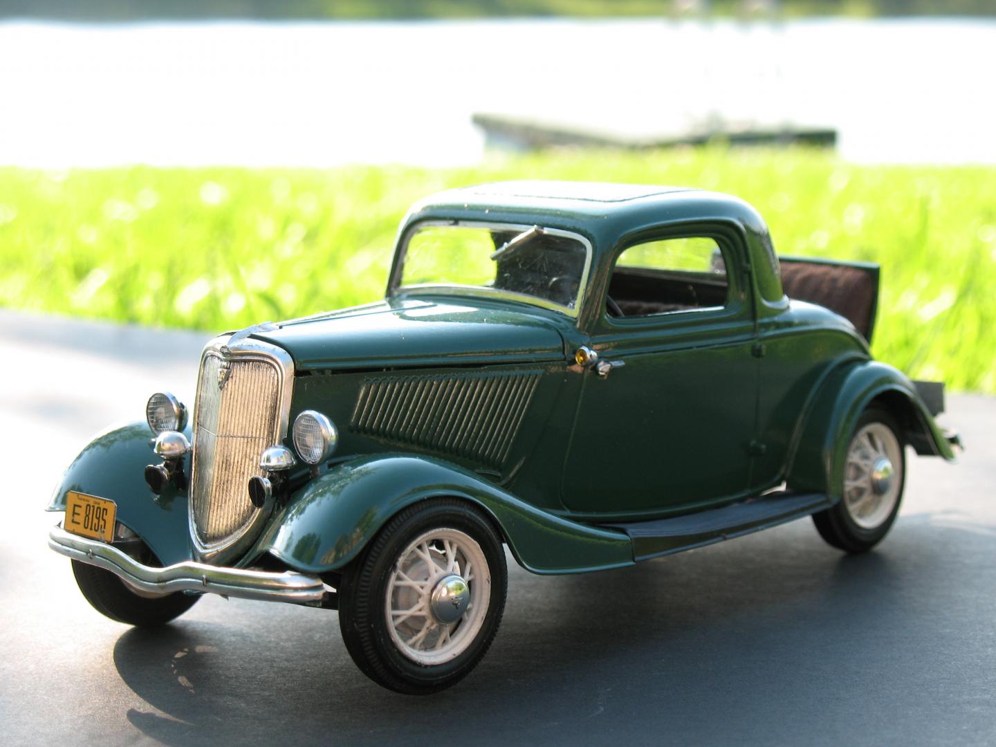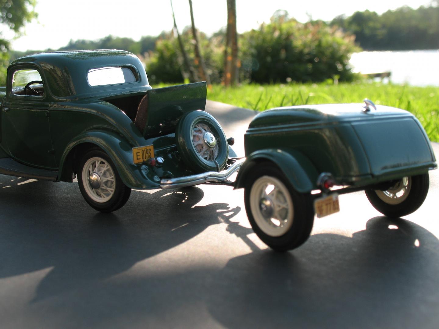 8. Original release Monogram 1934 Ford 3 window coupe, I bought this kit last year at the Syracuse Nationals at the small model show and sale it was in a plastic bag in pieces. There are before and after pictures. I have always wanted to build this kit as stock, I have built it in the 70's and 80's even 90's but this was my favorate build of all even the ZZ Top version. I built as stock as possible I added detailing interior, wood look dash and engine detail I also added the trailer from the 37 Ford Conv kit but 34 wheels. So take a look and tell me what you think, thanks for looking.