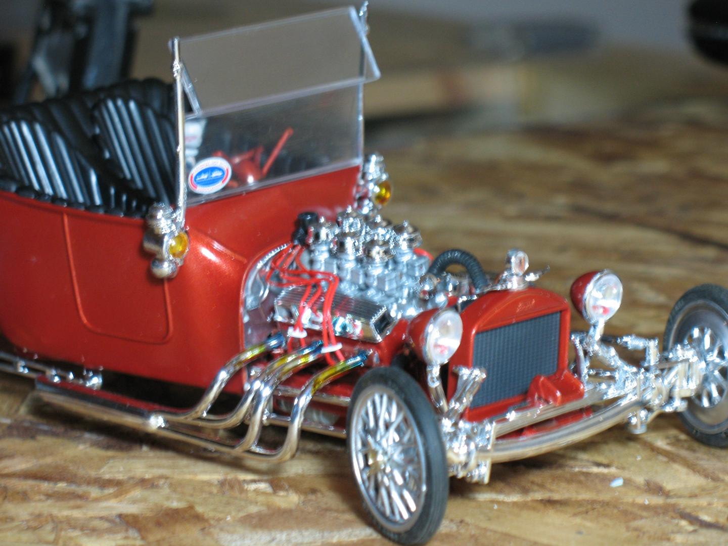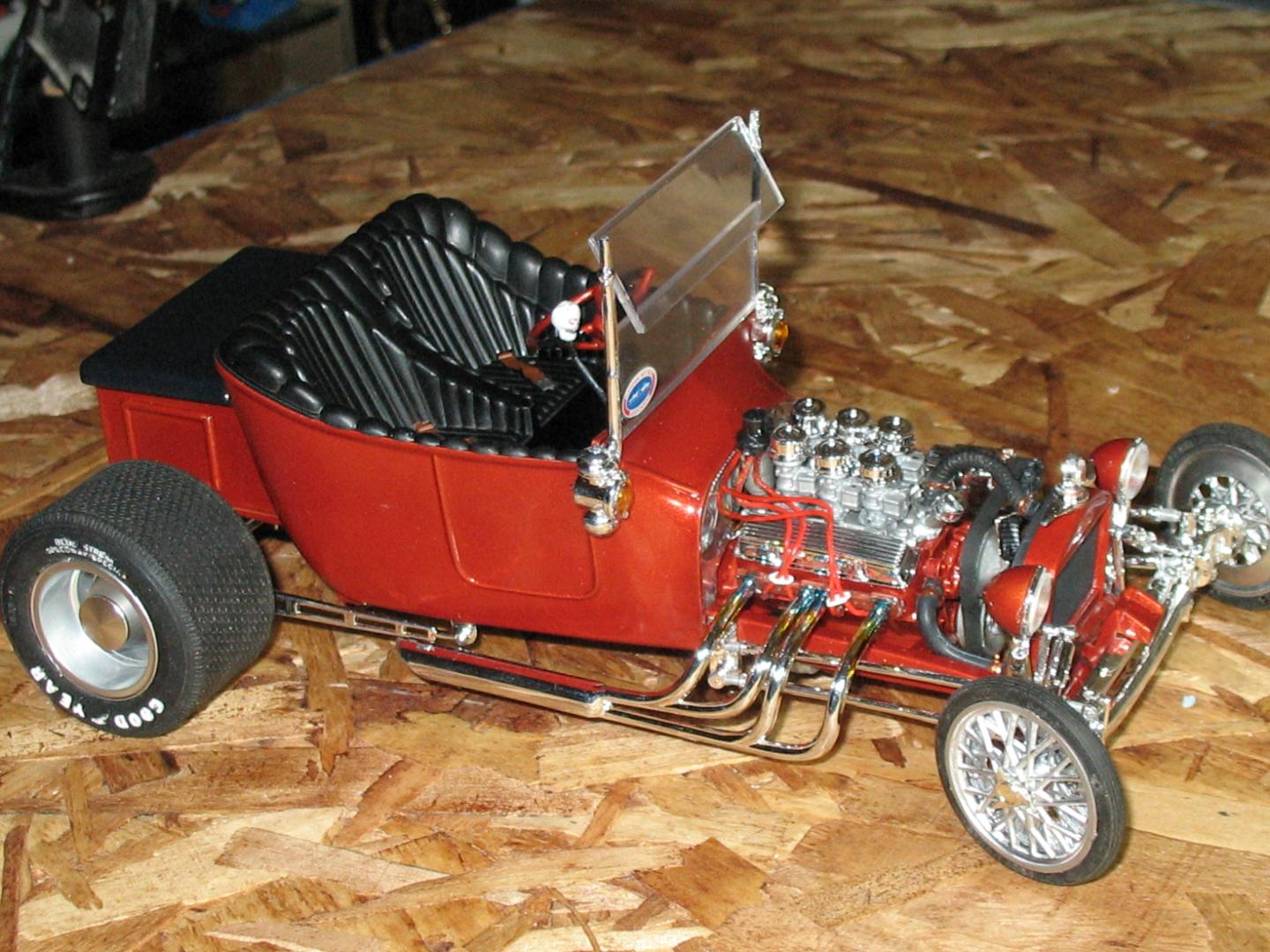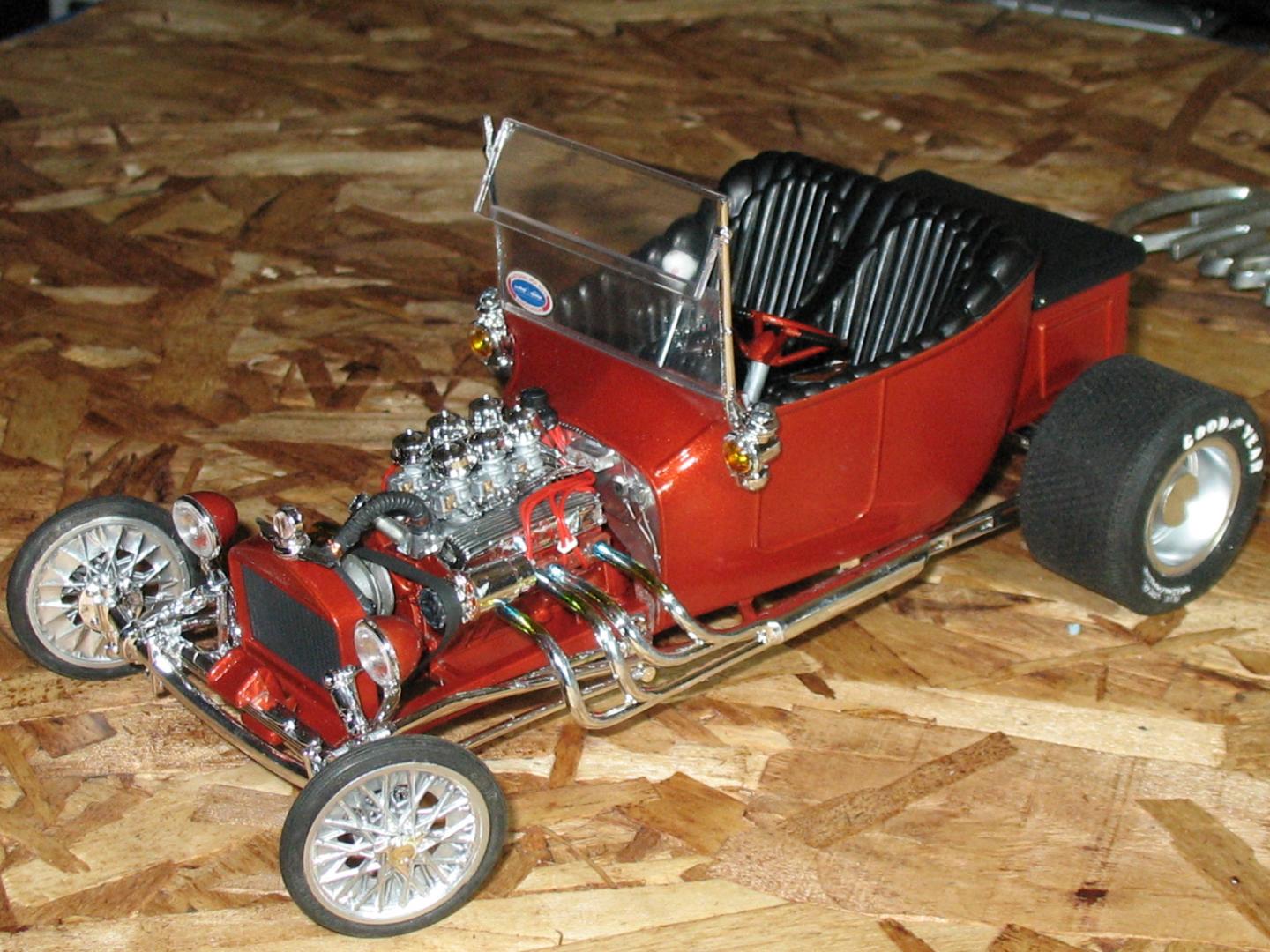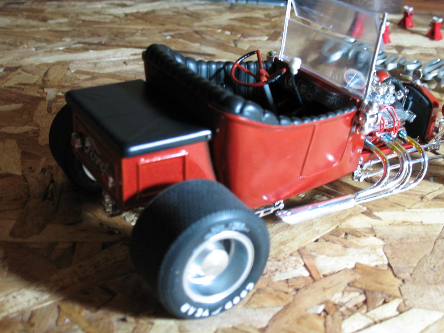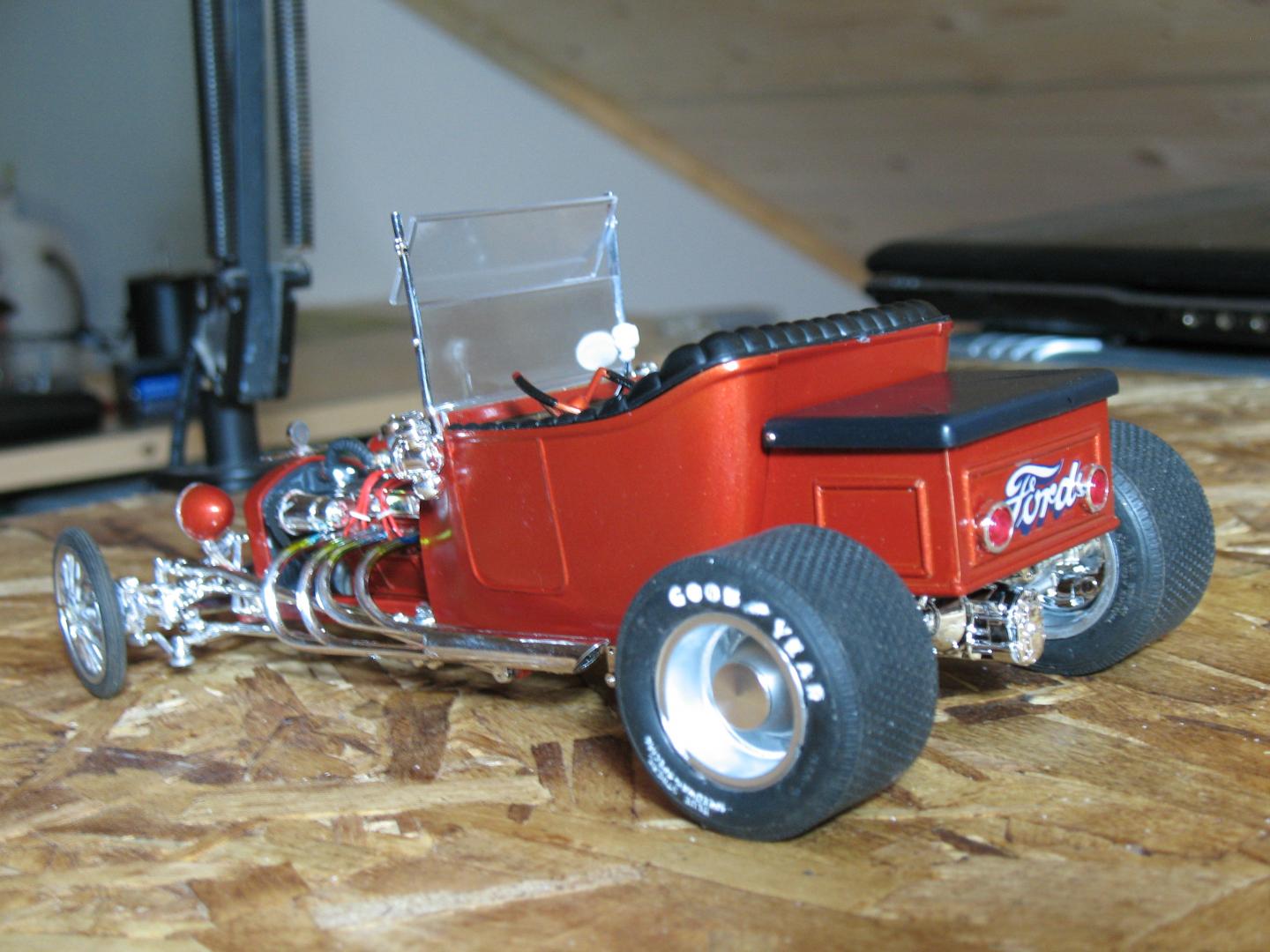 This is the way I thought this 1/16 scale kit should look, I enjoyed building it some parts were a little finicky but it is a very old mold. I made scratch the pickup bed and covered it with the cover cut down from the 1/25 34 Ford pickup bed cover. I also used a skull on the sifter from a Hot Wheels, the wheels are parts box Dragster on the front and Charger on the back the centers of the rear wheels are from Dollar Store tire valve covers. I tried to put the roof on but it was so out of shape could not be used I even steamed it also tried to chop it down but it was to warped. I picked this one up in the states 2 years ago and glad I did, I like the way it turned out. Mostly out of the box.