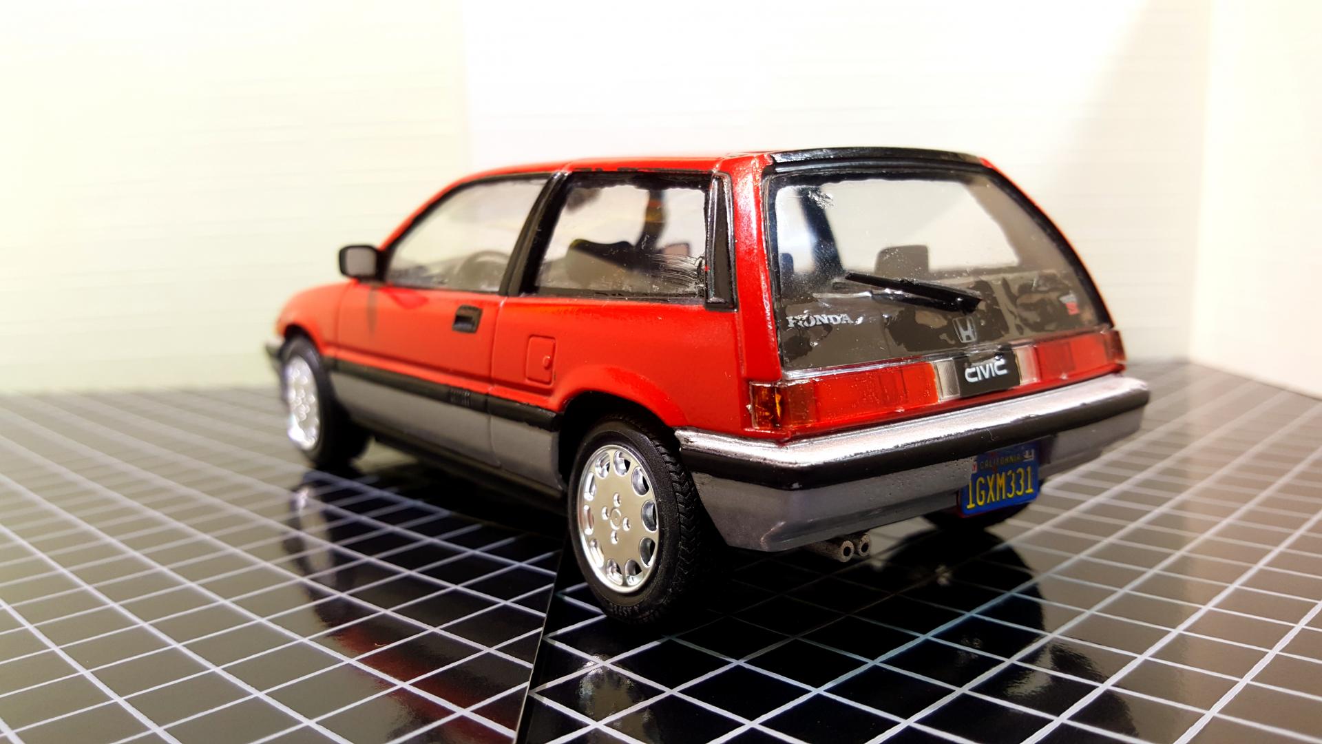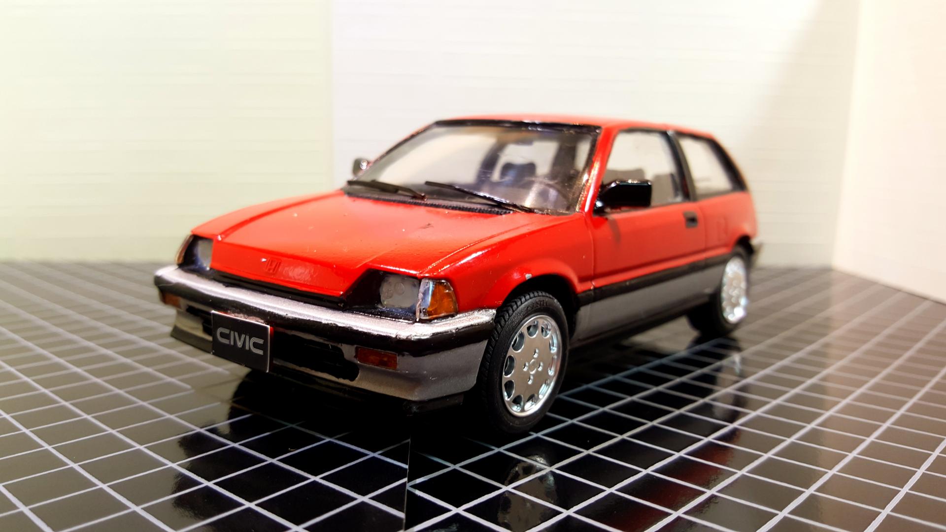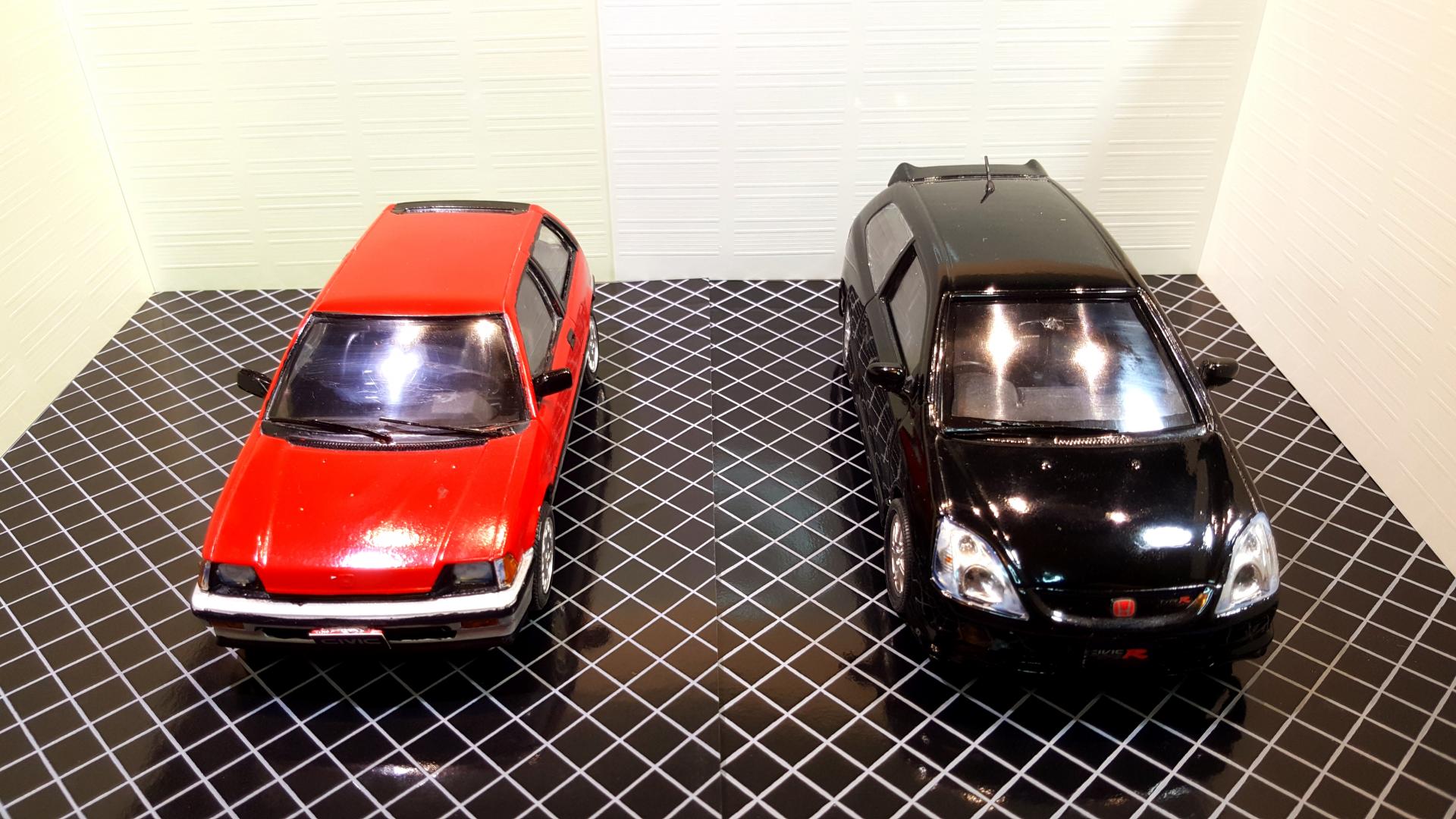 It has been too many years since I have been able to say this, but I HAVE COMPLETED NOT JUST ONE BUT TWO MODELS!!! The red one is Tamiya's 1984 Honda Civic Hatchback built as the export version with the optional left hand drive dash and the black one is Fujimi's 2002 Civic Type R. I built these as a break from a few very highly customized builds, both are box stock, and showed I have a few skills to brush up on like trim painting and had a few glue goof ups on the windows even though I used Testors Clear Parts glue and tried to clean up the goof ups with water. The large black decal across the bottom of the window on the 84 also gave me a little rough time cracking as I was trying to position it. They by far are not the best I have ever built or won't win any contests, but at least finally ended a probably 15 year streak of starting but never finishing builds! I also started two Fujimi garage kits to serve as a backdrop for the pictures.