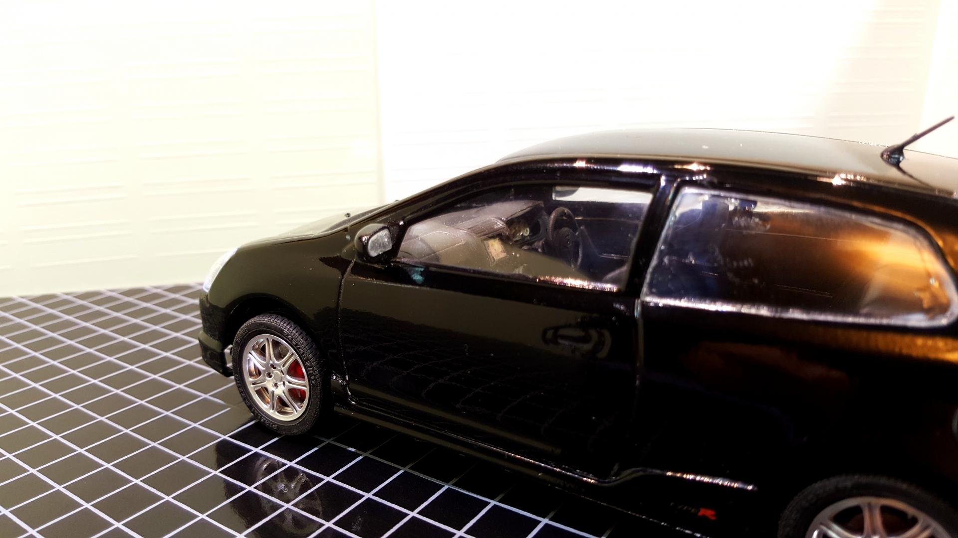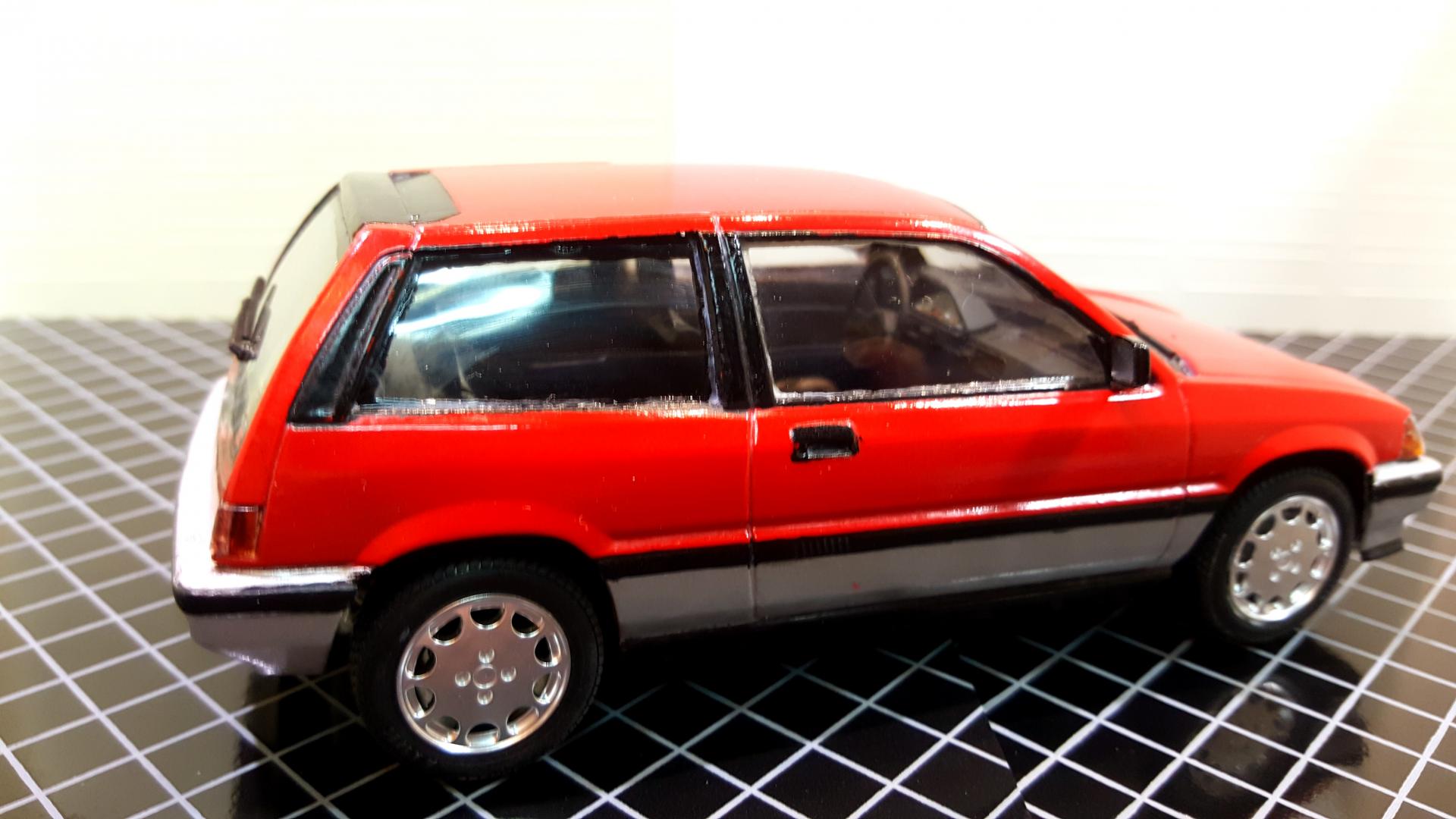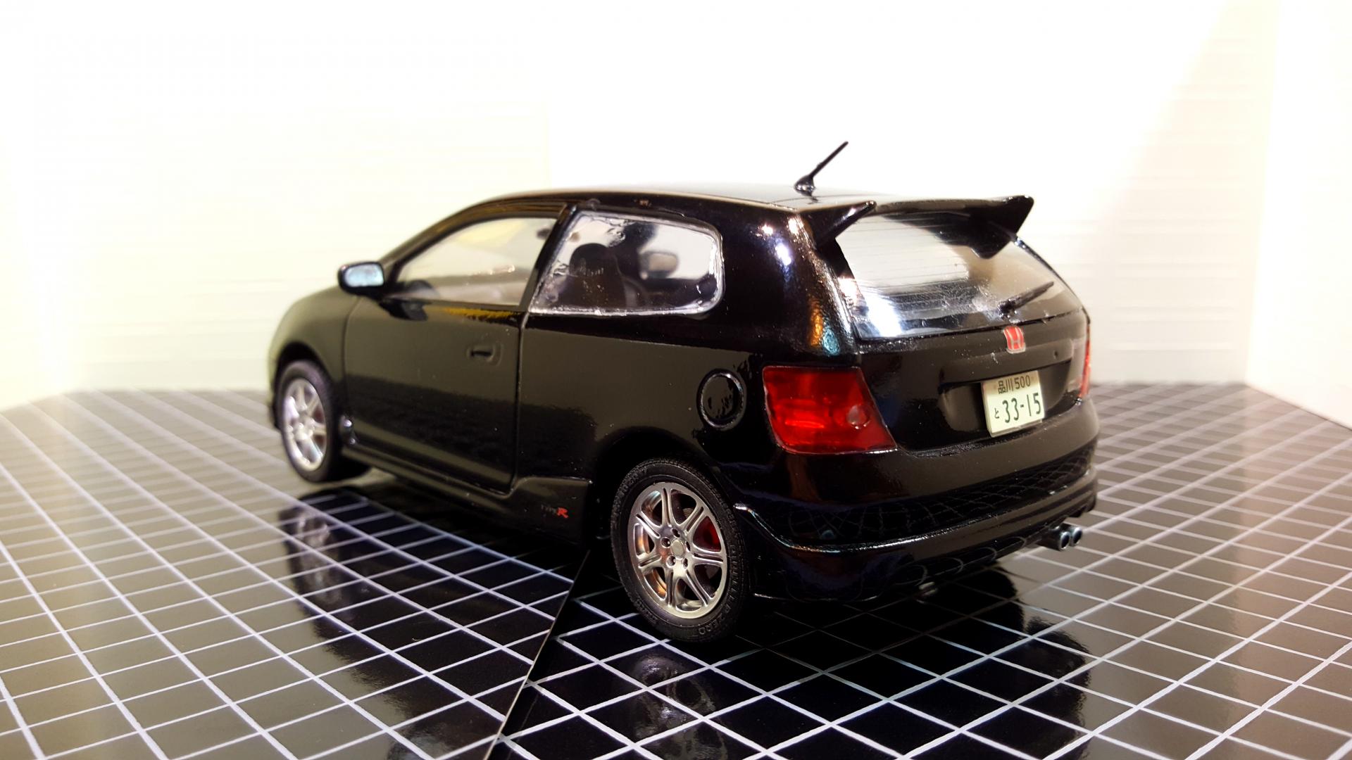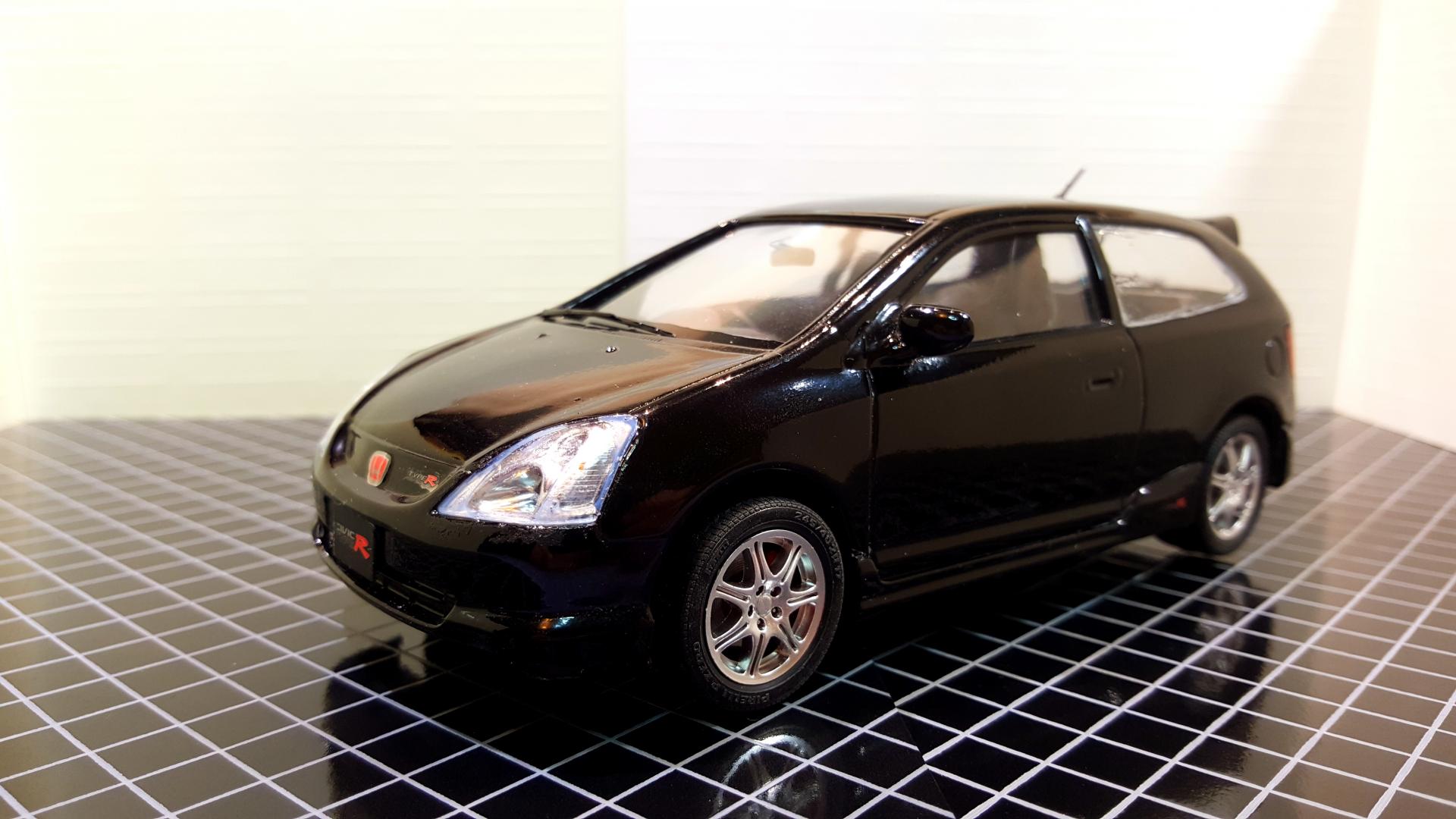 It has been too many years since I have been able to say this, but I HAVE COMPLETED NOT JUST ONE BUT TWO MODELS!!! The red one is Tamiya's 1984 Honda Civic Hatchback built as the export version with the optional left hand drive dash and the black one is Fujimi's 2002 Civic Type R. I built these as a break from a few very highly customized builds, both are box stock, and showed I have a few skills to brush up on like trim painting and had a few glue goof ups on the windows even though I used Testors Clear Parts glue and tried to clean up the goof ups with water. The large black decal across the bottom of the window on the 84 also gave me a little rough time cracking as I was trying to position it. They by far are not the best I have ever built or won't win any contests, but at least finally ended a probably 15 year streak of starting but never finishing builds! I also started two Fujimi garage kits to serve as a backdrop for the pictures.