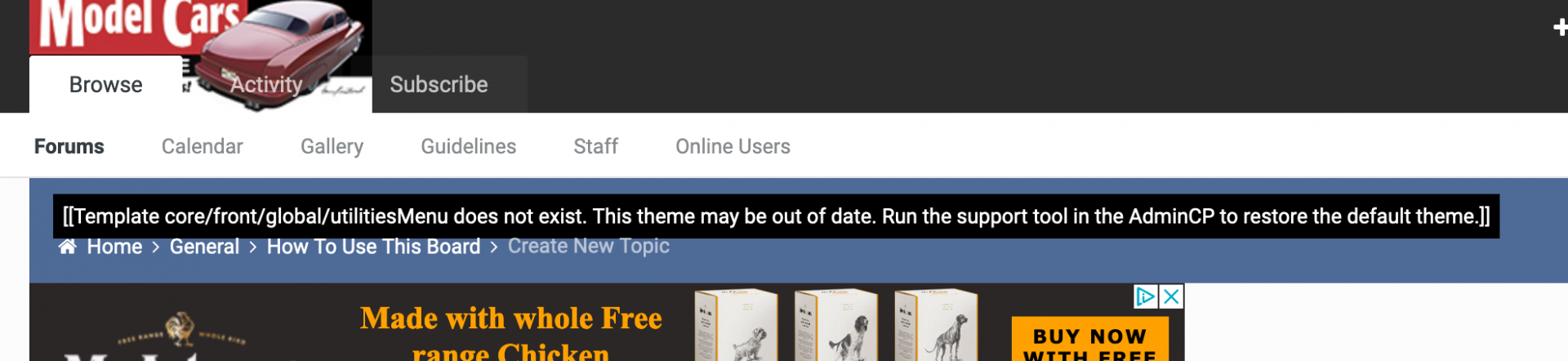 I have a strange message at the top of the forum page, at the top of the blue bar showing the location in the forum (eg Home>General> How to use this board) and below the MCM menu (Forums Calendar gallery etc) [[Template core/front/global/utilitiesMenu does not exist. This theme may be out of date. Run the support tool in the AdminCP to restore the default theme.]] Any ideas? best, M.
