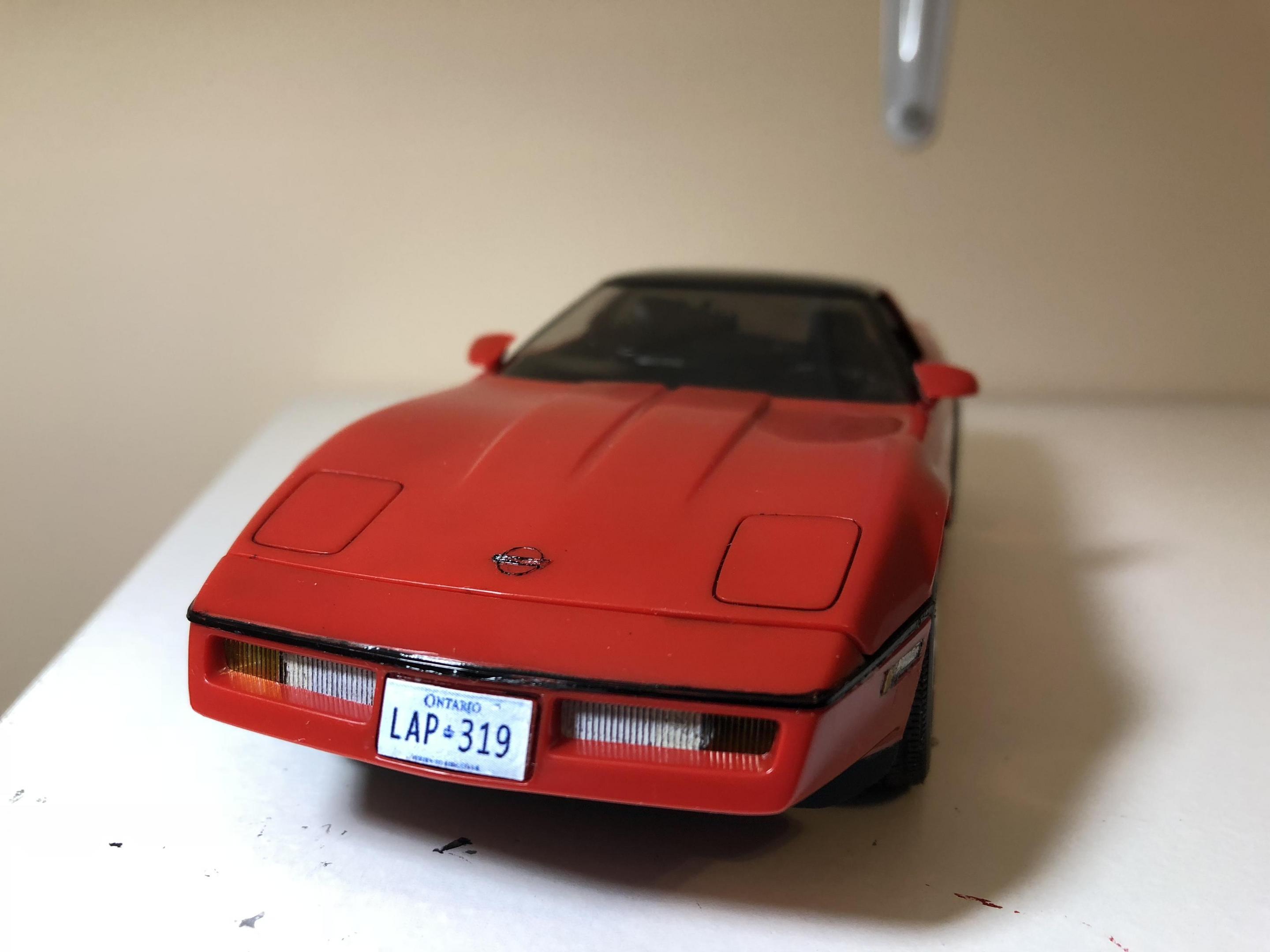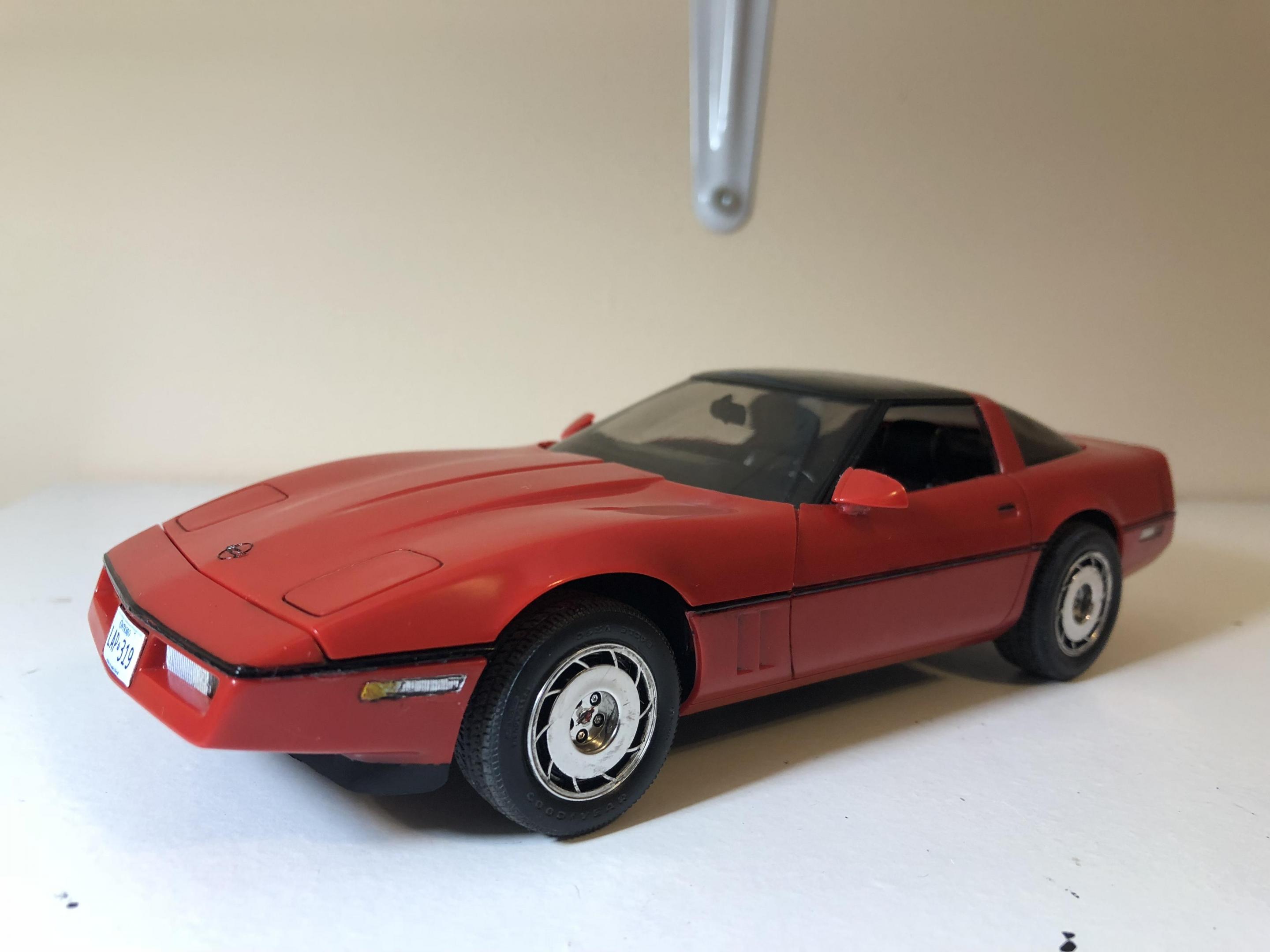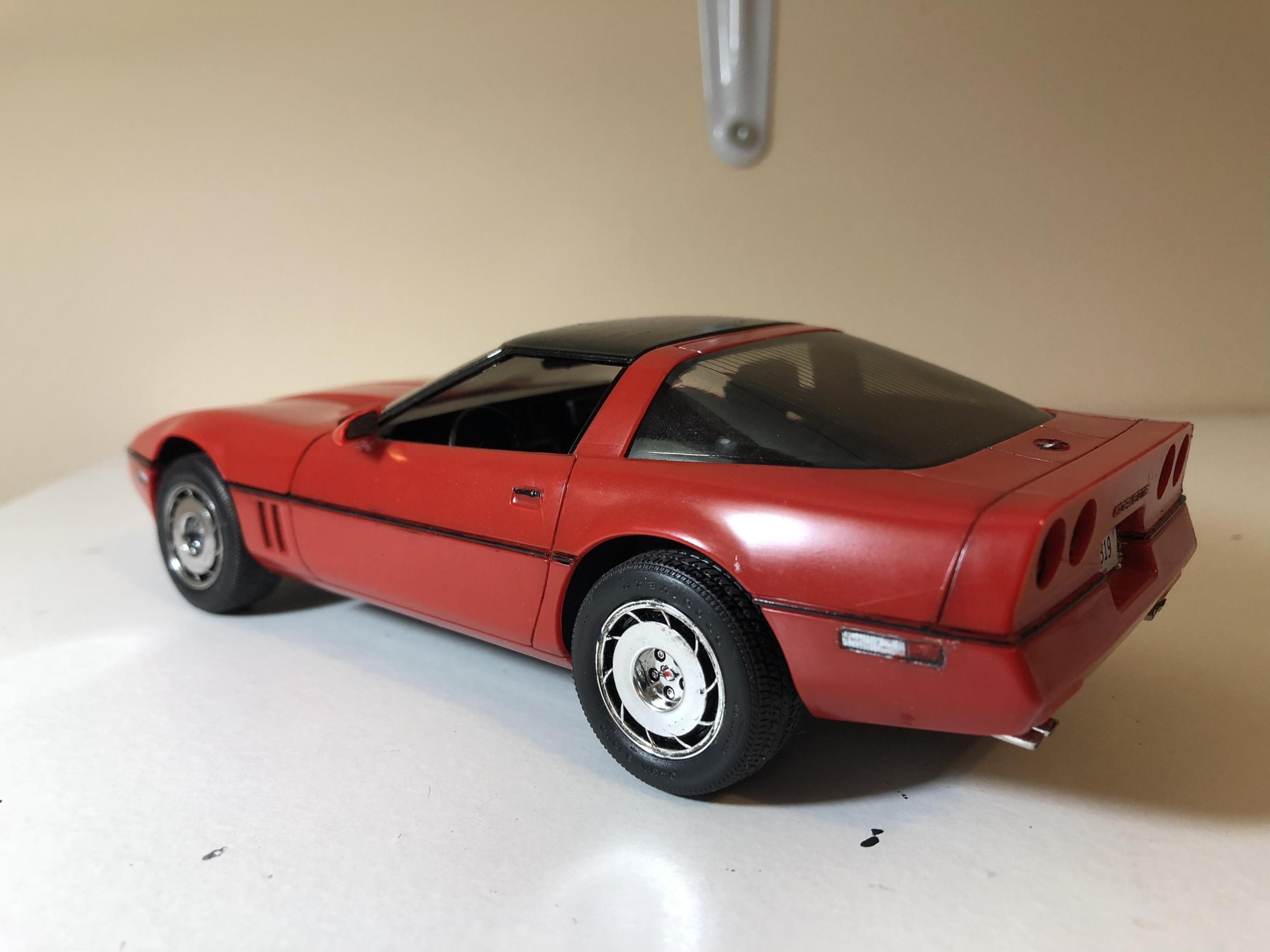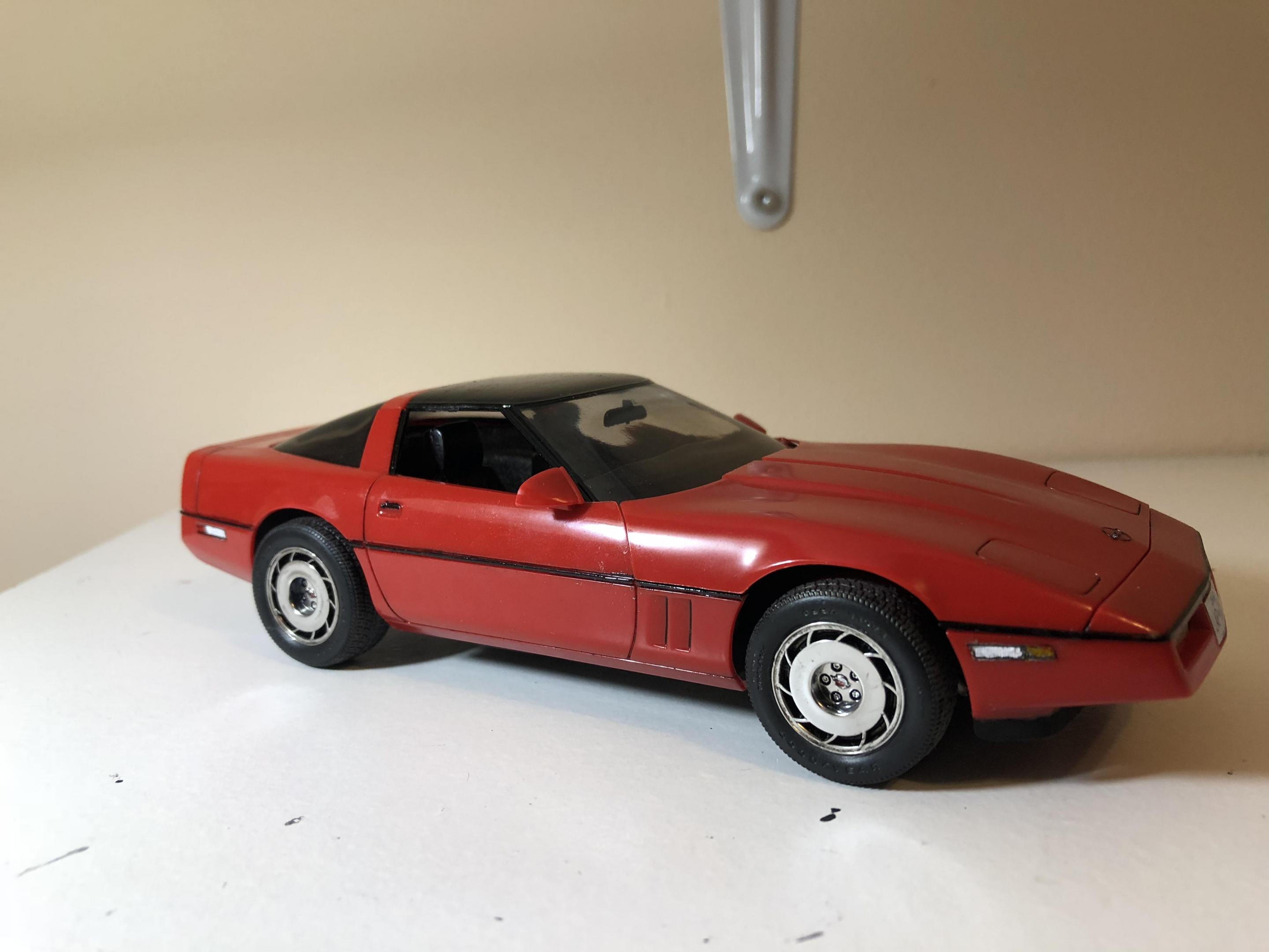 Hello. Completed my 1985 corvette by monogram. Box stock build. Left the classic monogram read bare plastic. Painted all the trim free hand. Think it turned out ok. Has some tricky suspension bits. But looks good. Great detail for a old kit. only issue I had with the kit was the taillights molded on the body. I tried my best to make them look good. But I think I overkilled it. Thanks for looking all comments welcomed