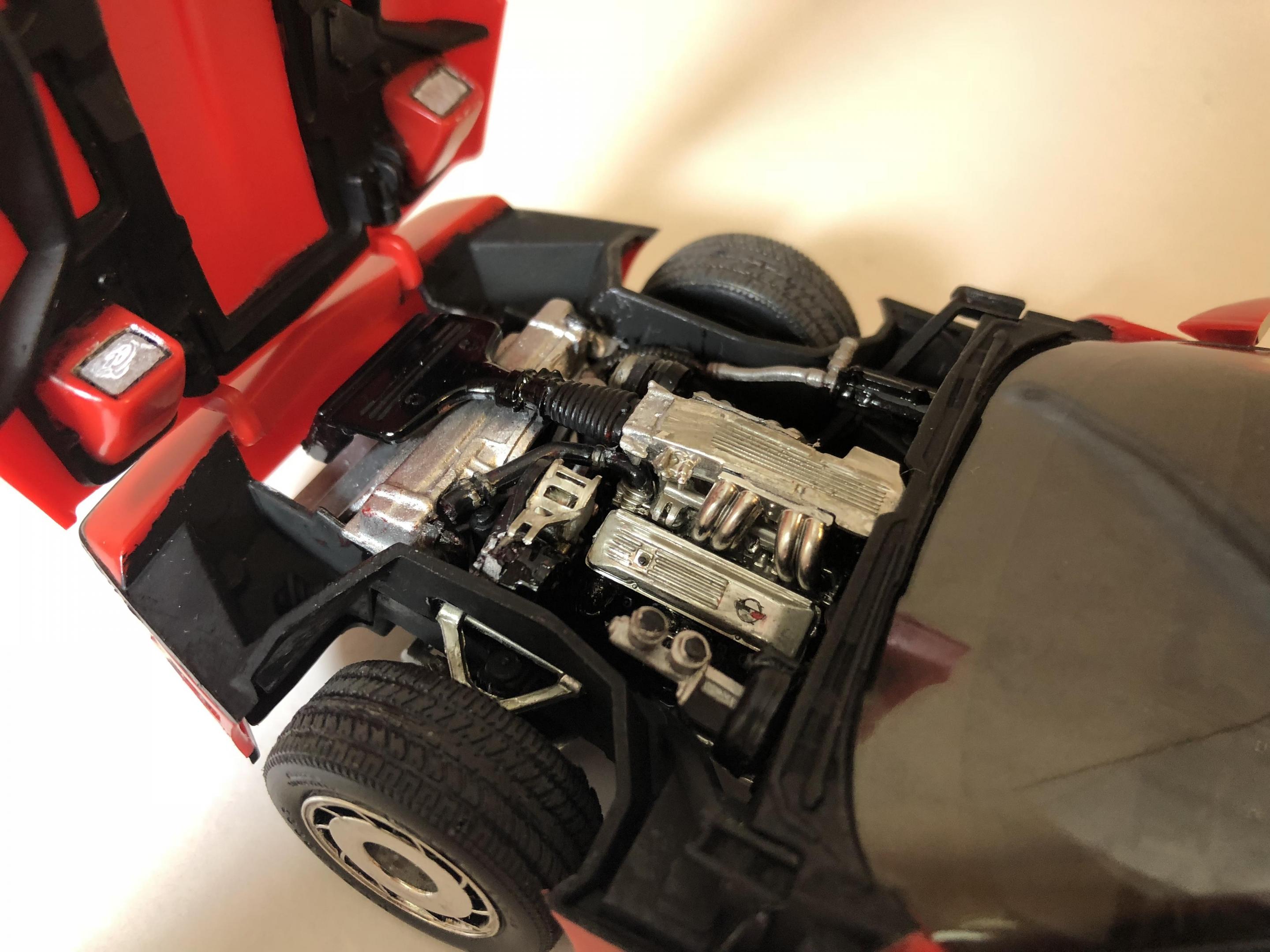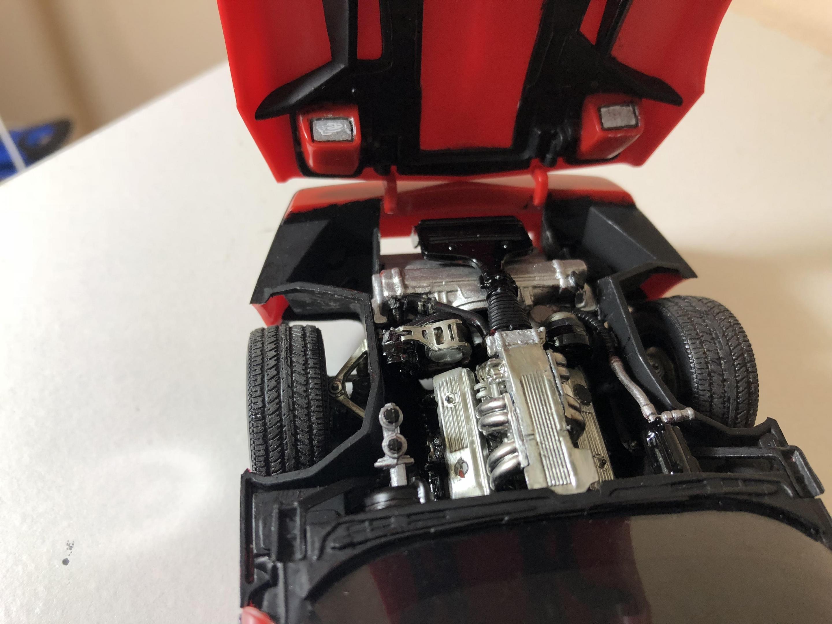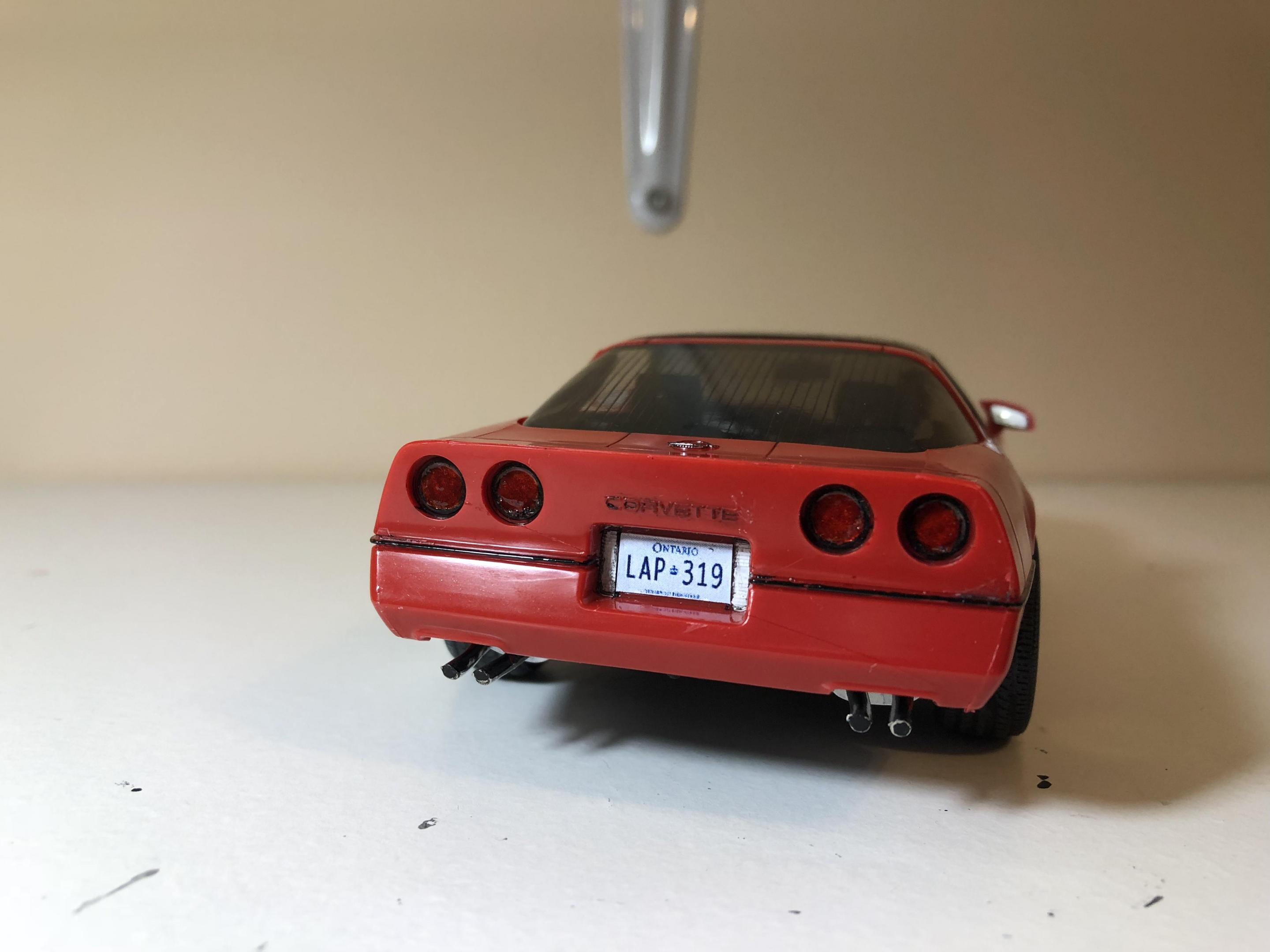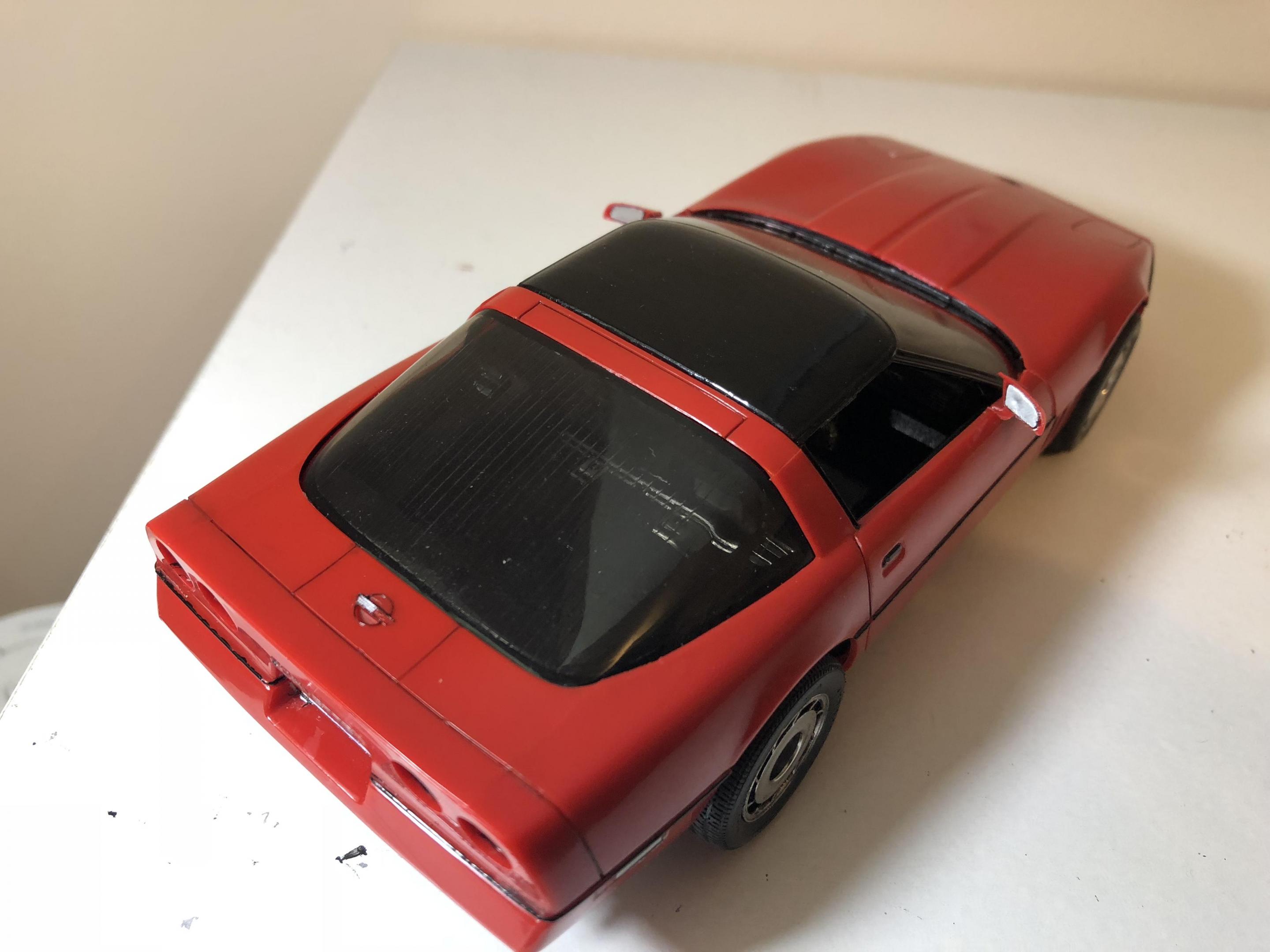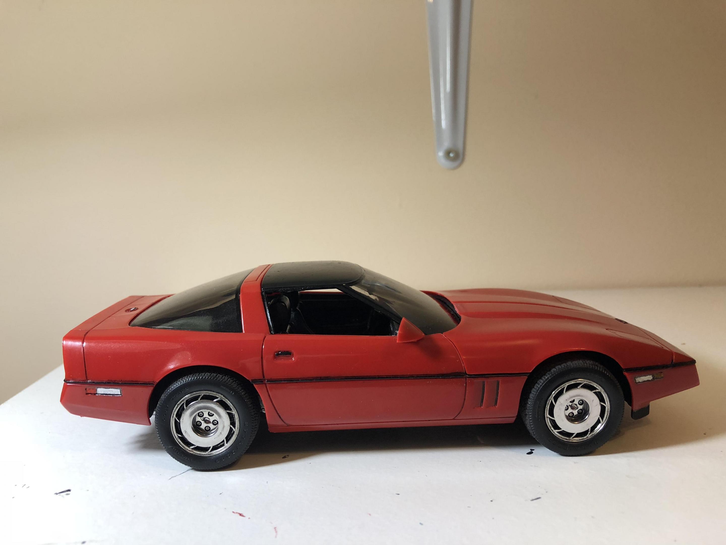 Hello. Completed my 1985 corvette by monogram. Box stock build. Left the classic monogram read bare plastic. Painted all the trim free hand. Think it turned out ok. Has some tricky suspension bits. But looks good. Great detail for a old kit. only issue I had with the kit was the taillights molded on the body. I tried my best to make them look good. But I think I overkilled it. Thanks for looking all comments welcomed