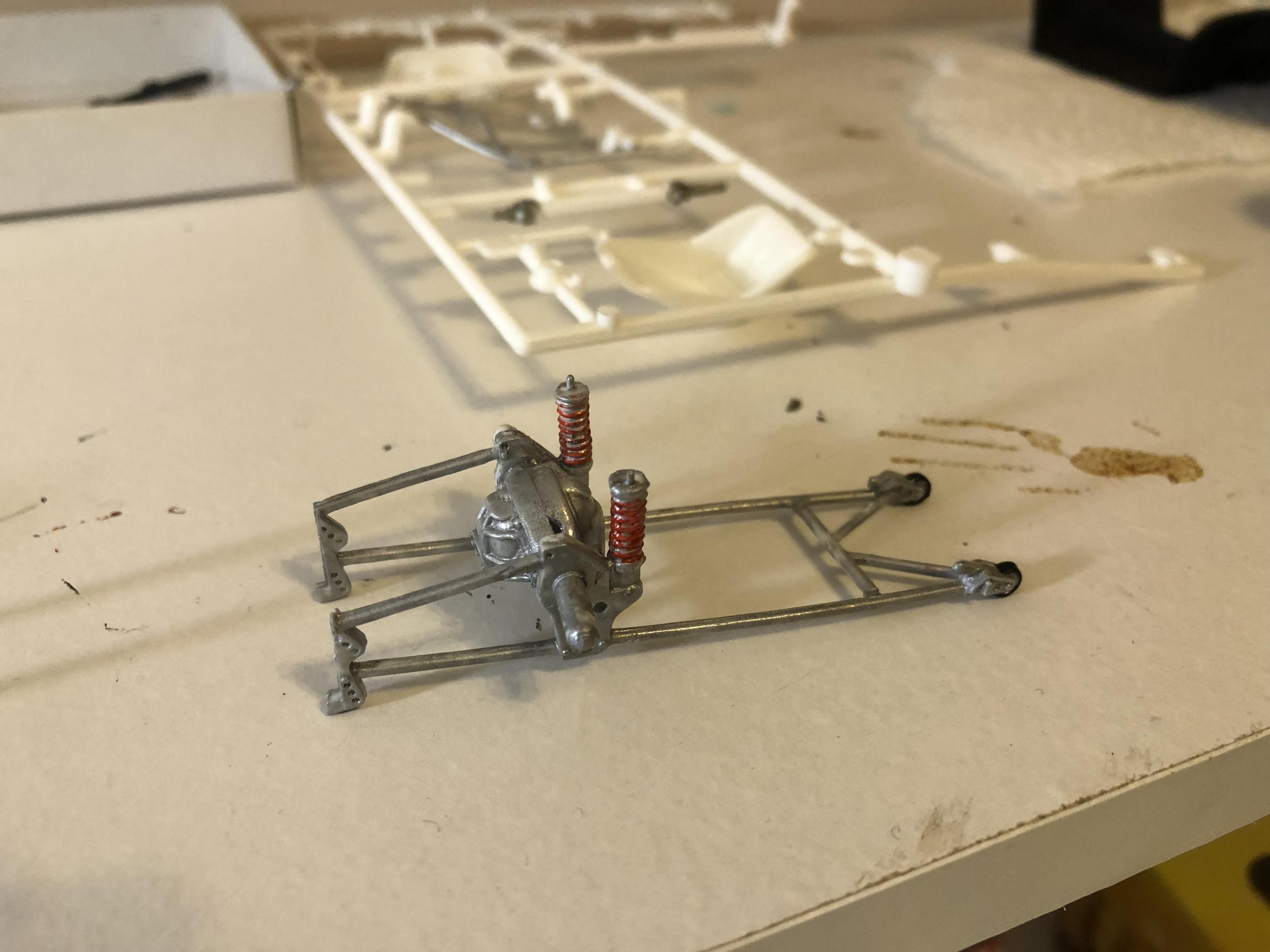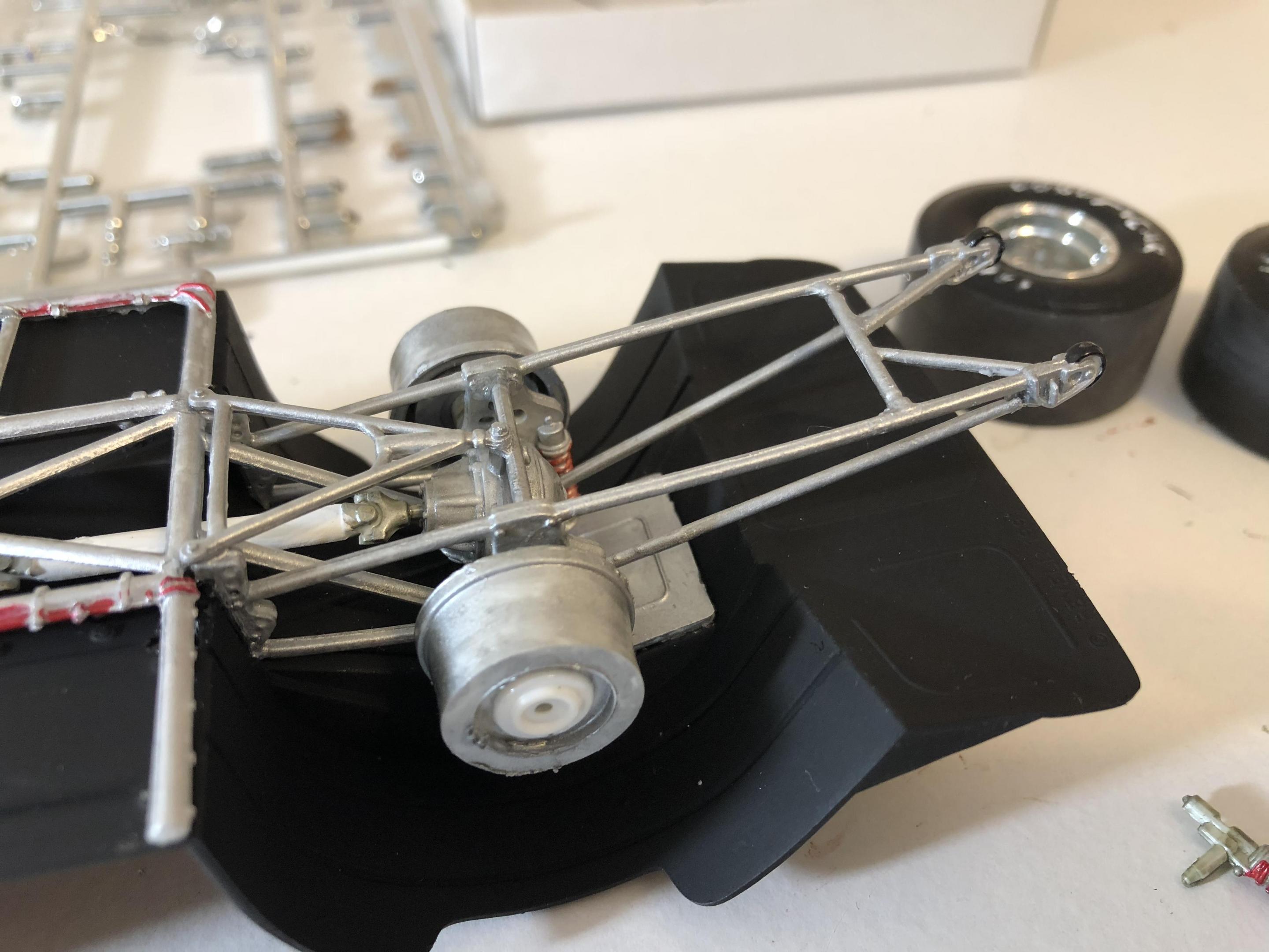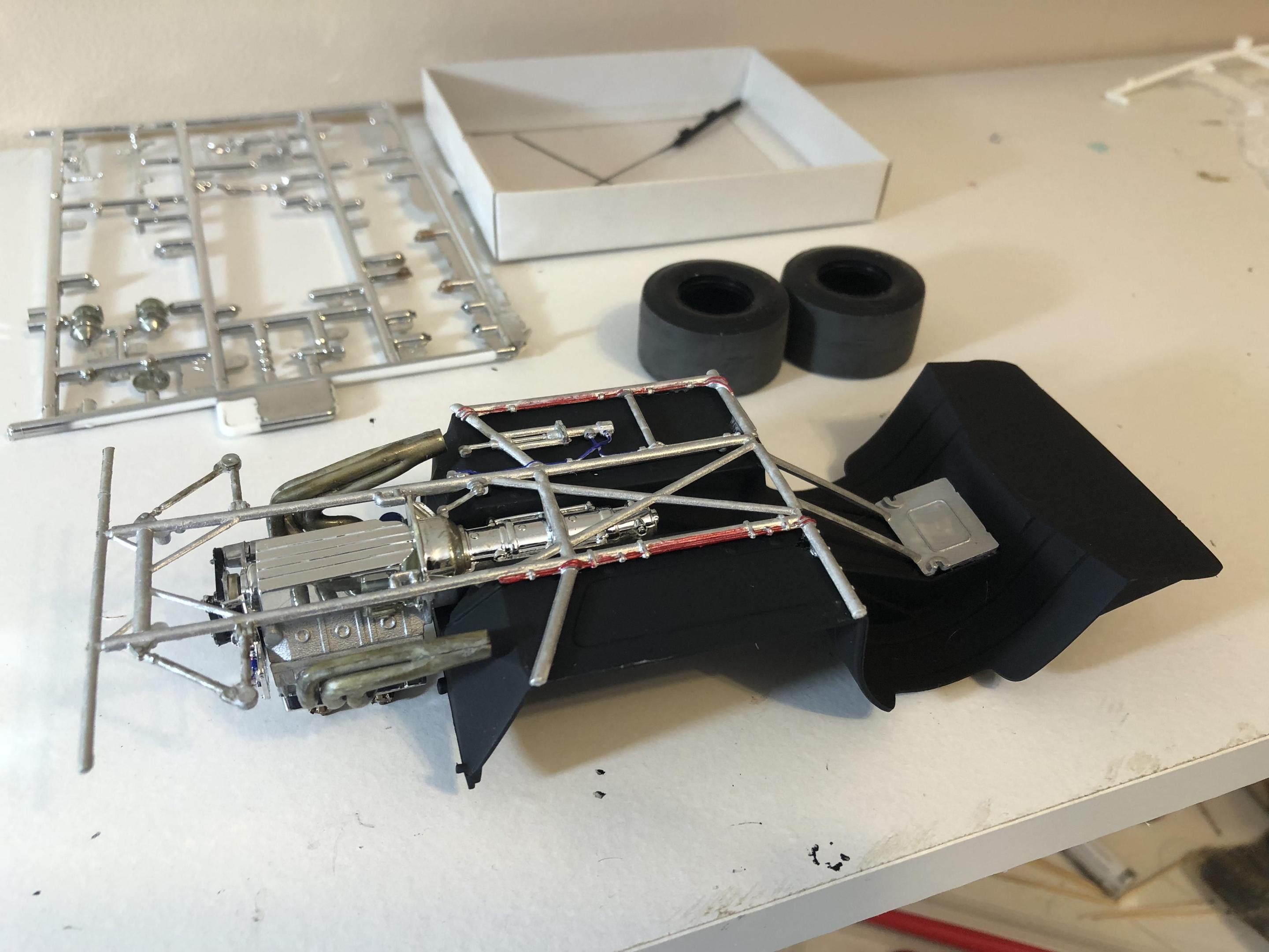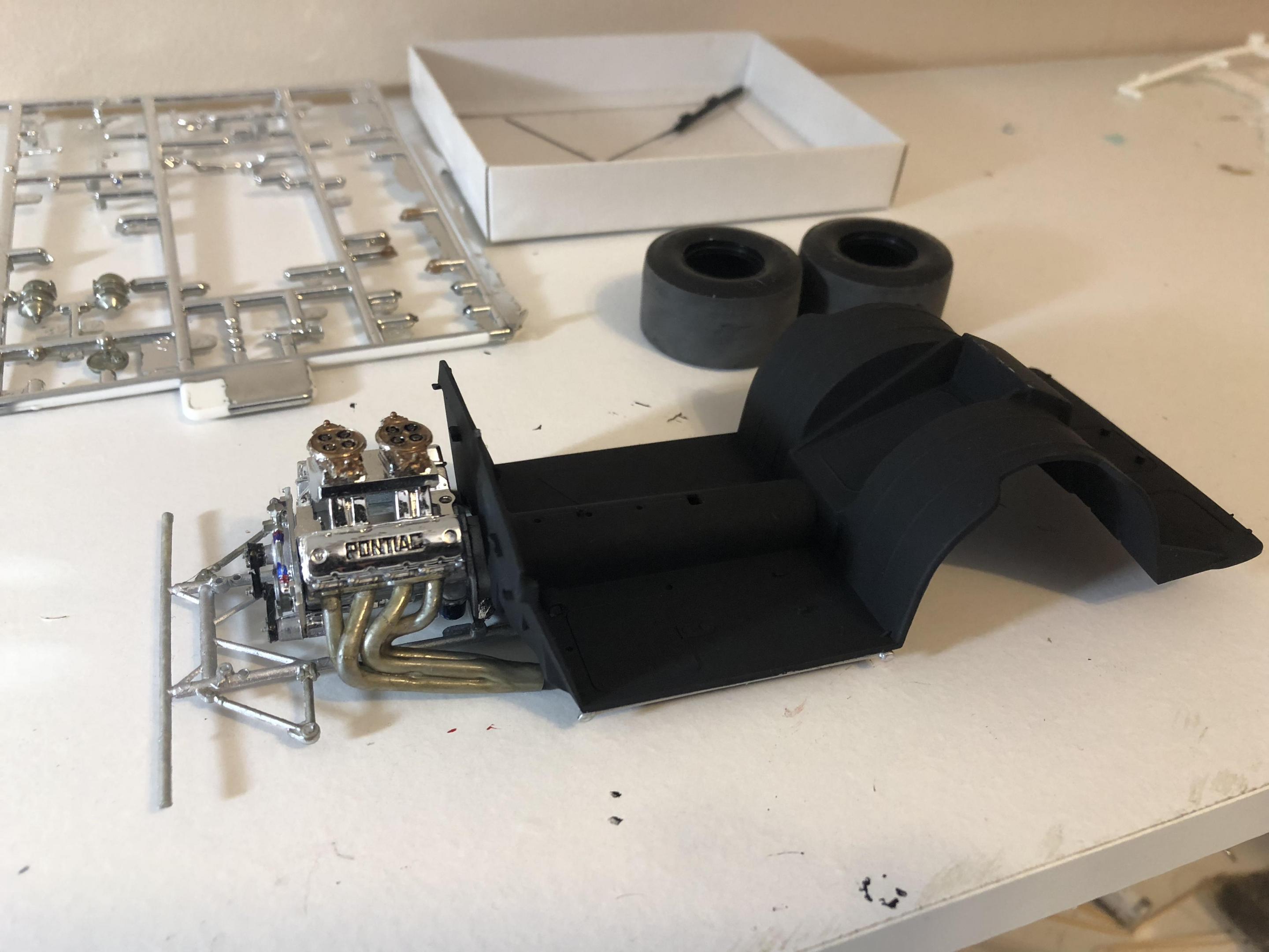 Got some more work done. Look like the hood need another coat. My molotov pen has gone dull tried to chrome the bumber. engine now in the frame. now never had such brtille plastic. The wheel shafts both snapped off. Going to have to intsall the back rims and back half of there tire so I can install the wheels with out more breaking