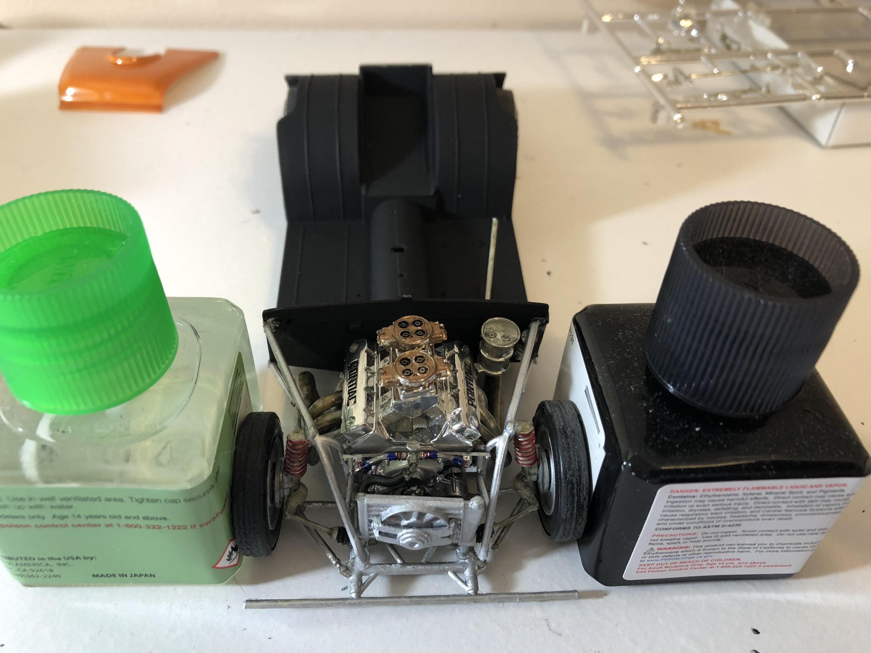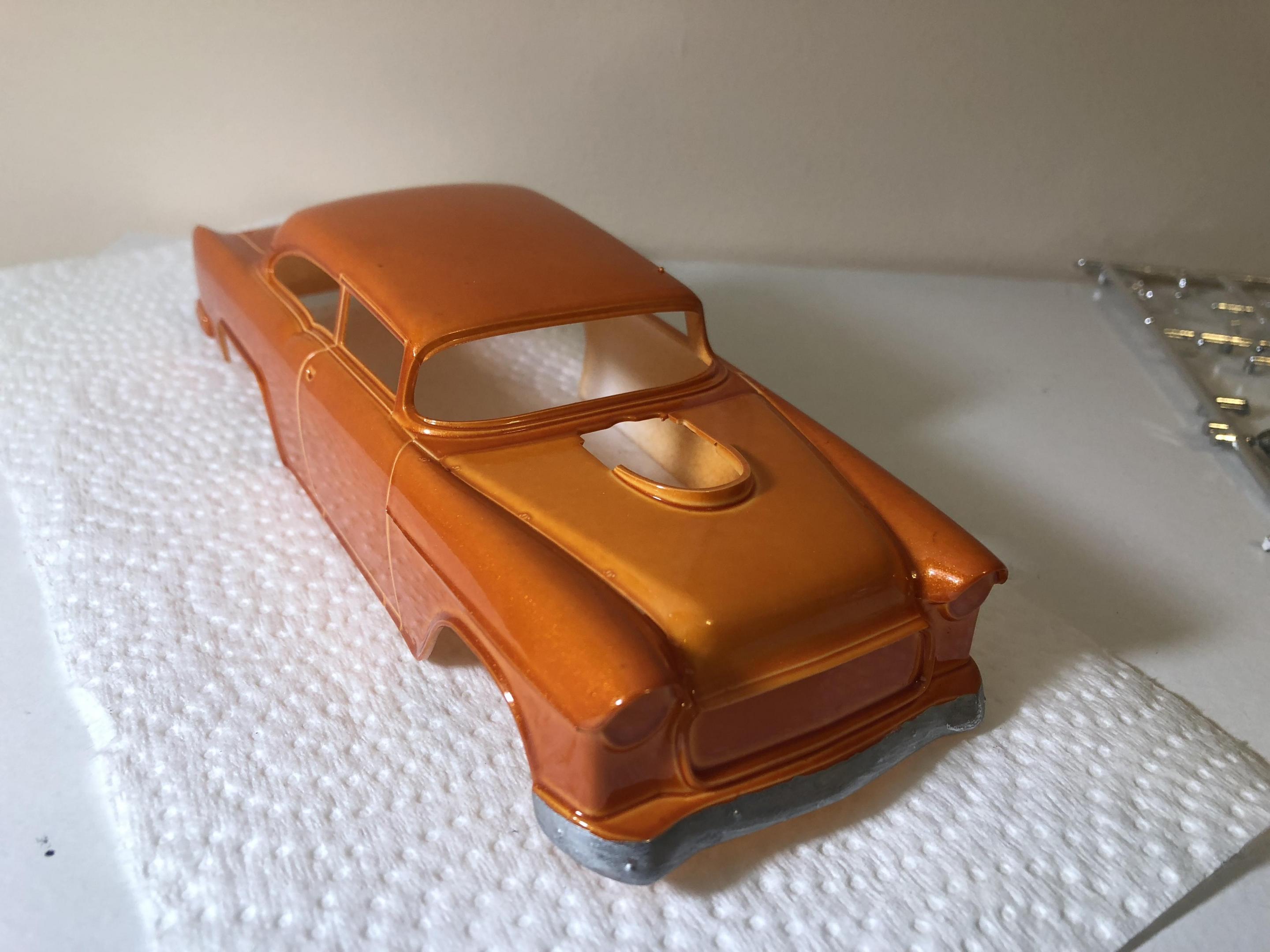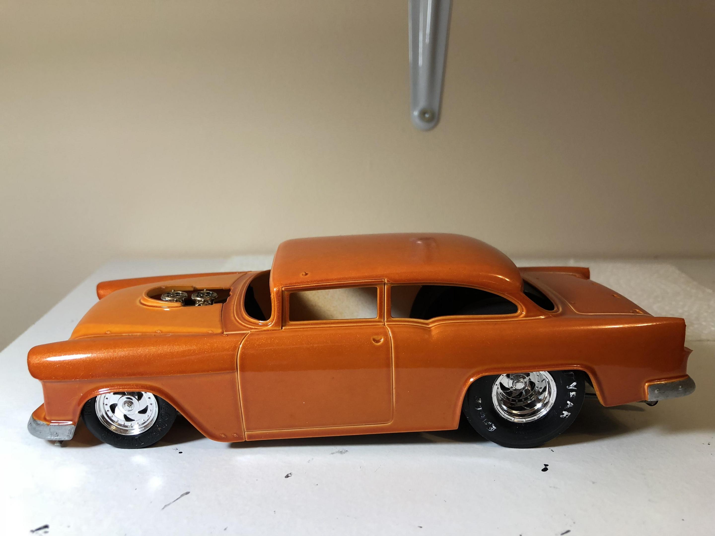 New on my main work bench Revell’s 55 Chevy pro sportsman. Engine almost completed. Paint is a testors orange pearl