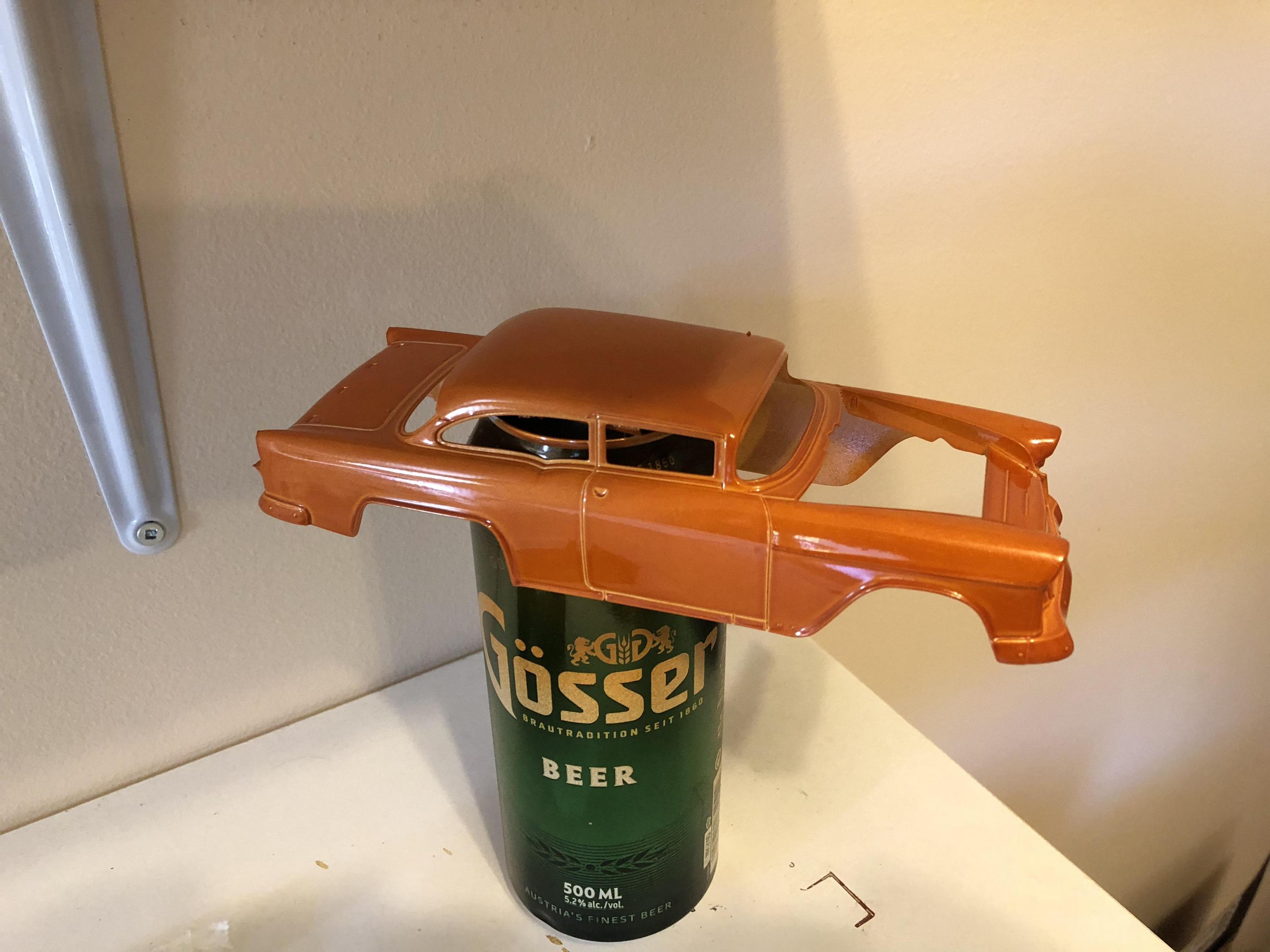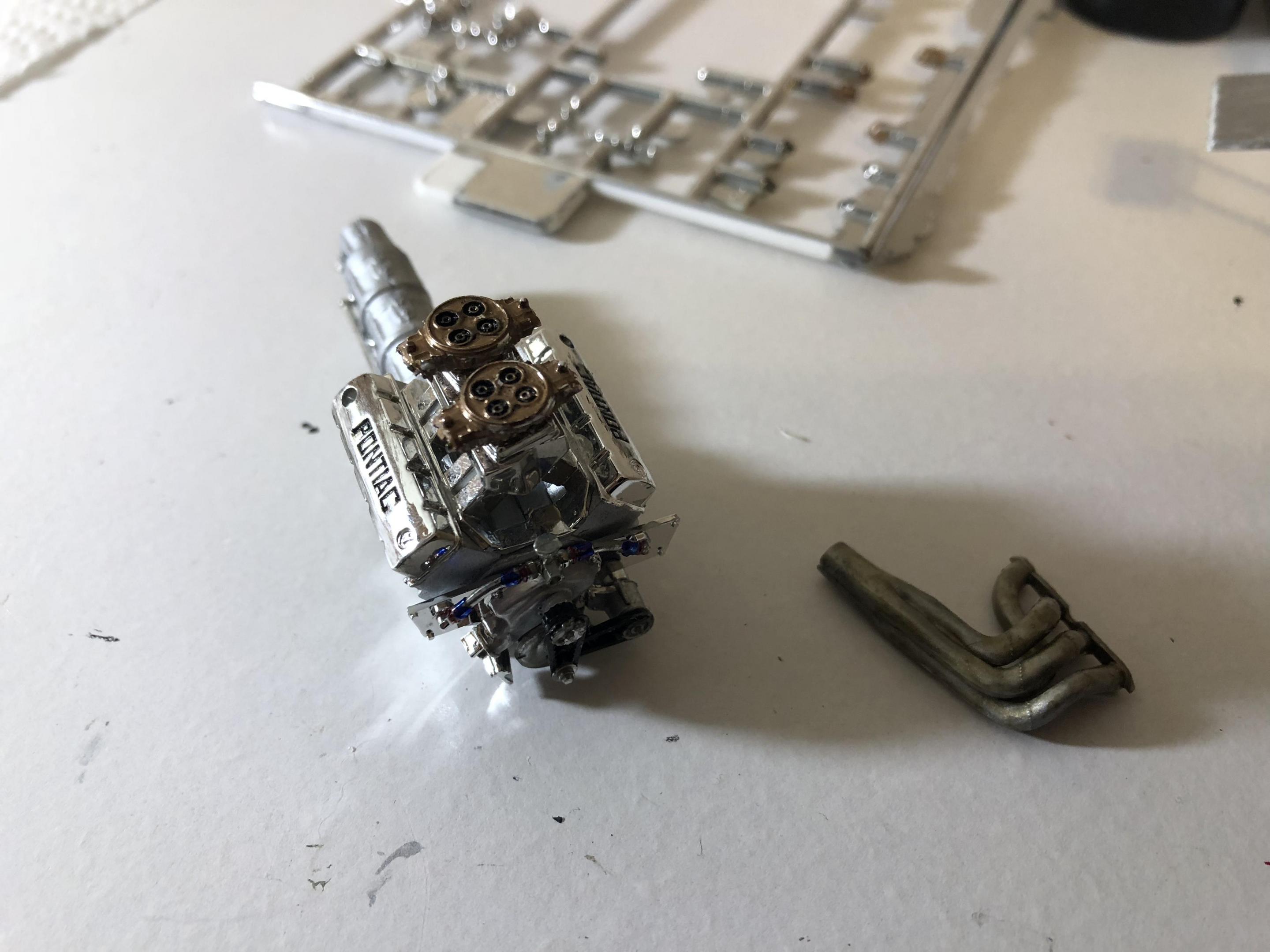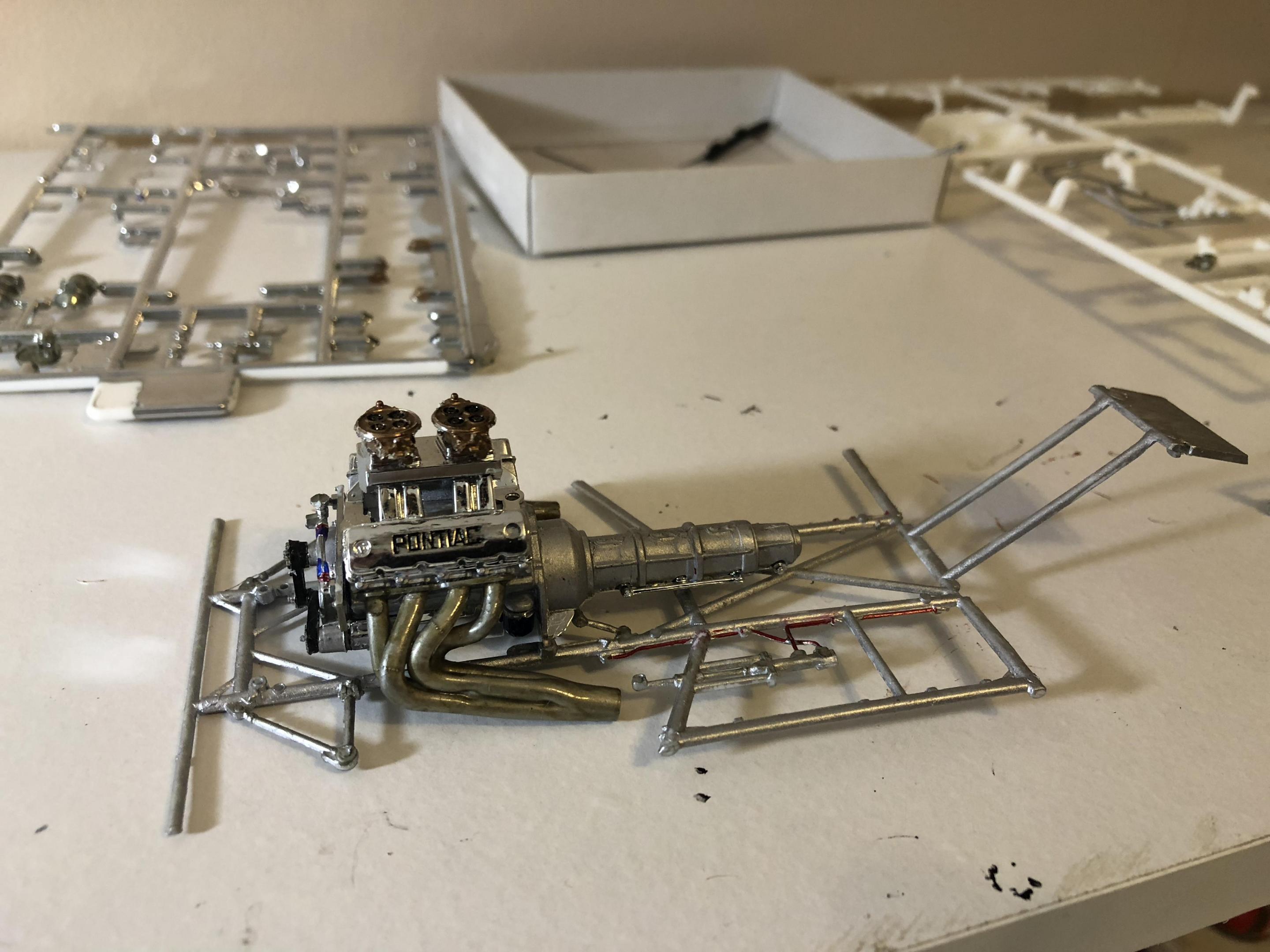 New on my main work bench Revell’s 55 Chevy pro sportsman. Engine almost completed. Paint is a testors orange pearl
