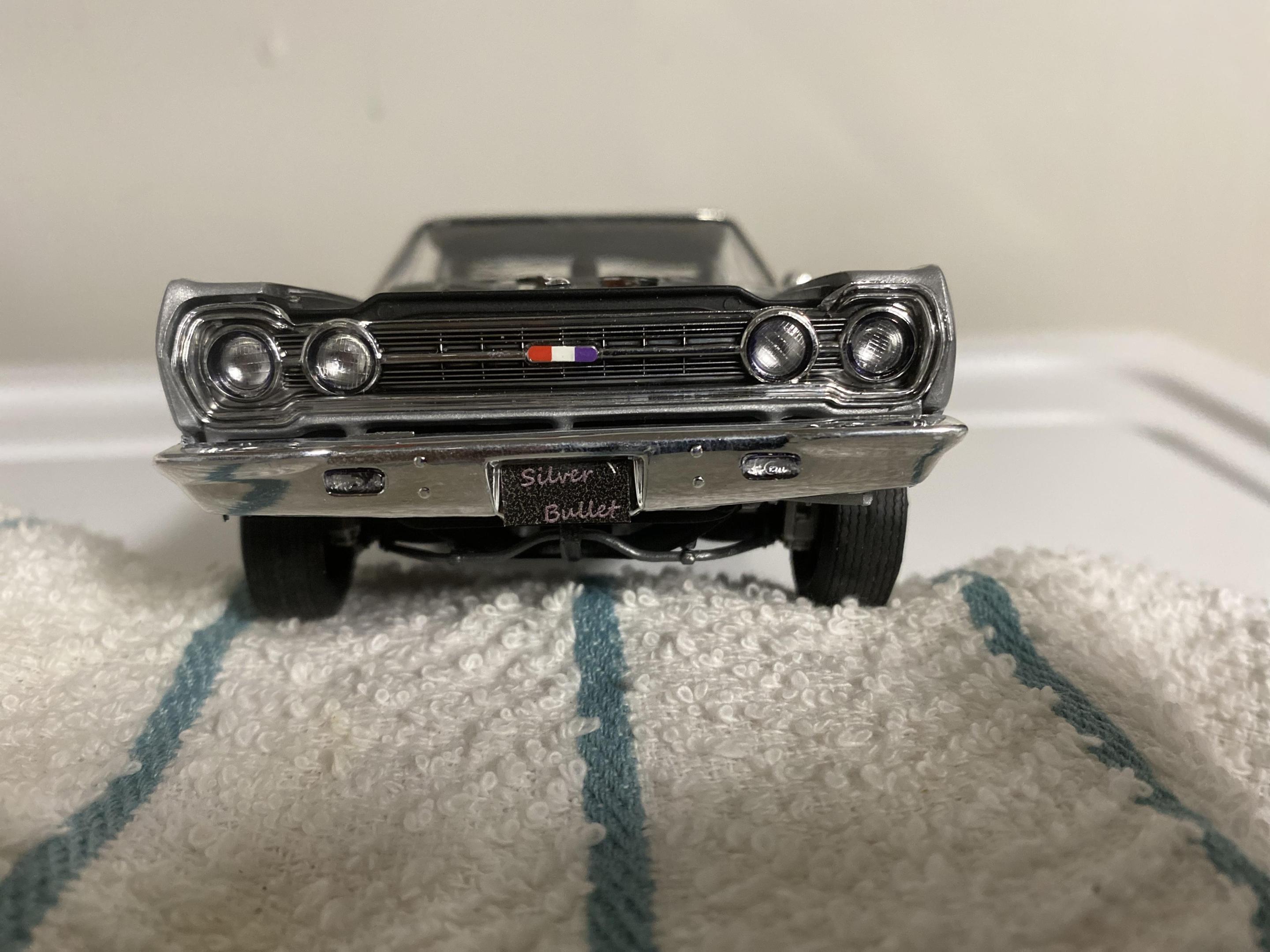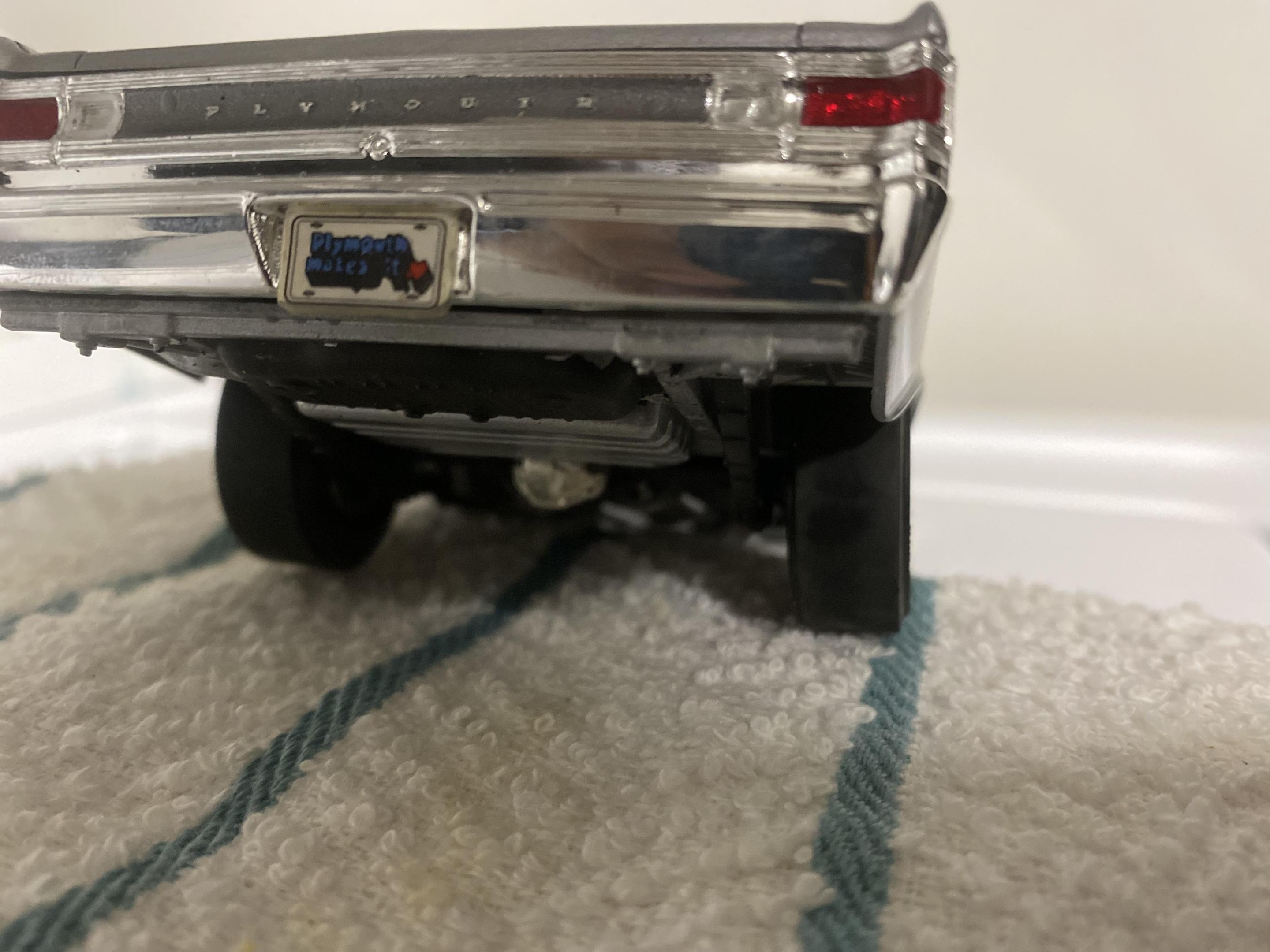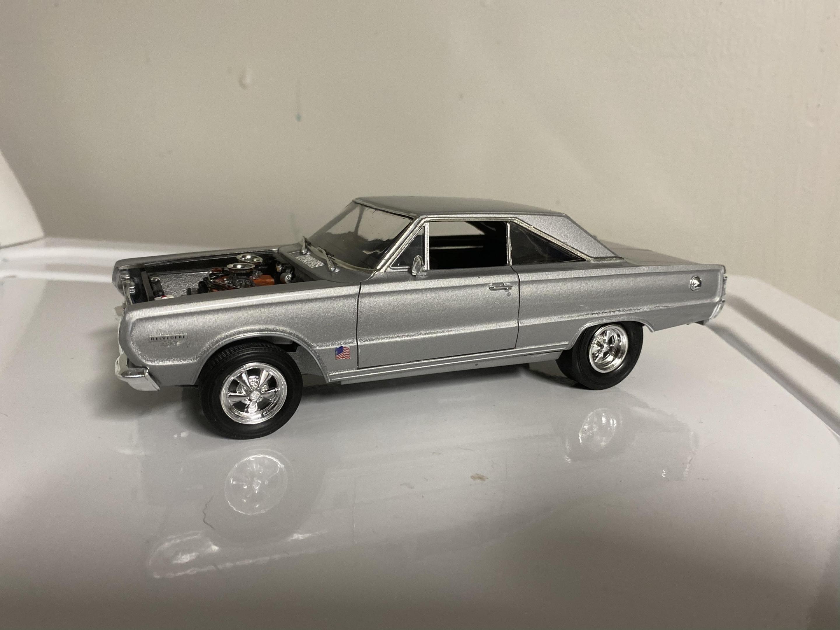 My build of Jimmy Addison’s 1967 Plymouth GTX. I scratch built the 4 Muffler exhaust system. Deleted the rear seat, scratch built the rear package tray. Wired up the motor and detailed it from reference pics. several parts from the parts bin. PE front disk brakes & parts box drums in the rear. Added valve stems to the Cragars. Period correct bucket seats as the 1:1 had.