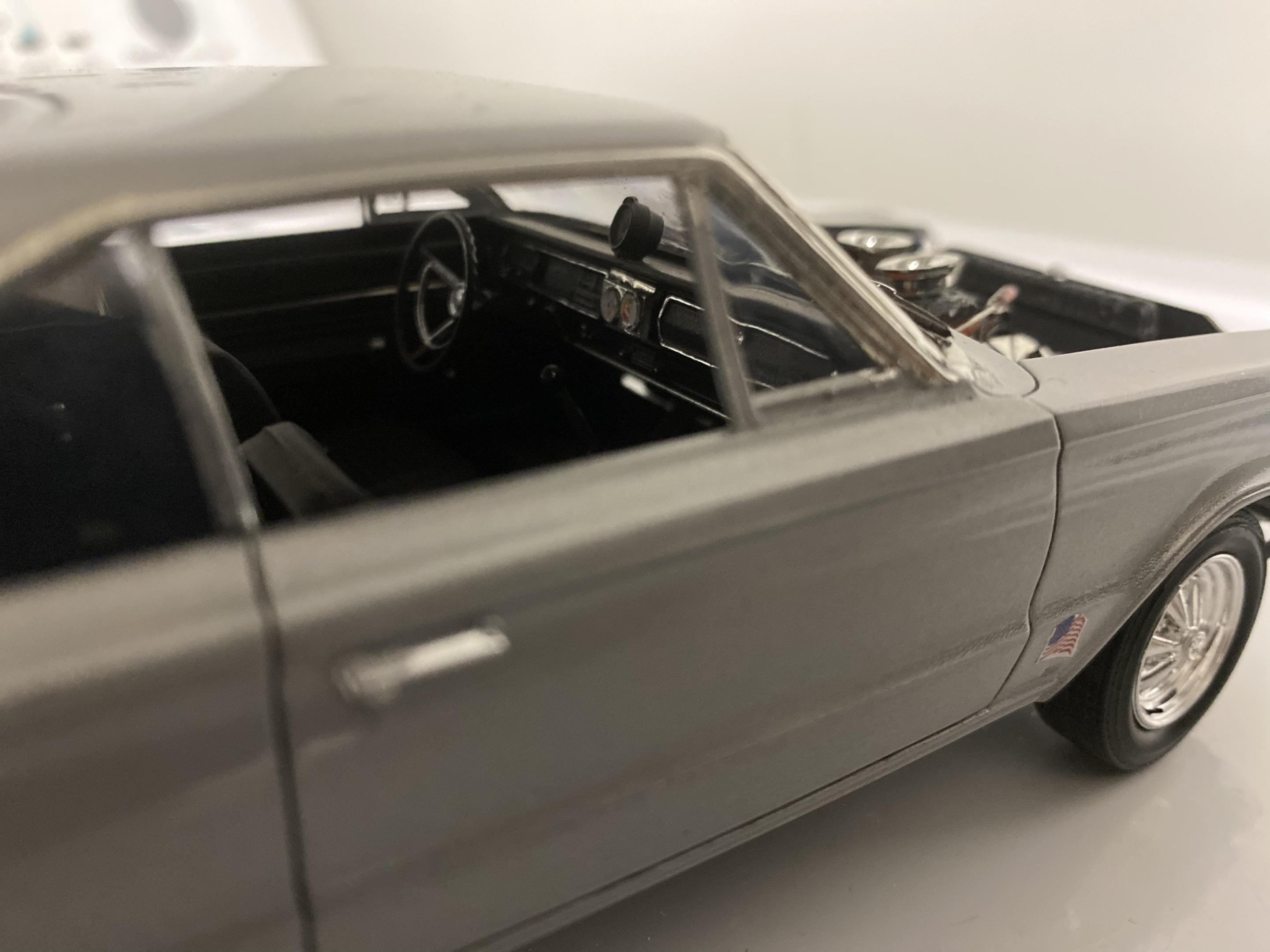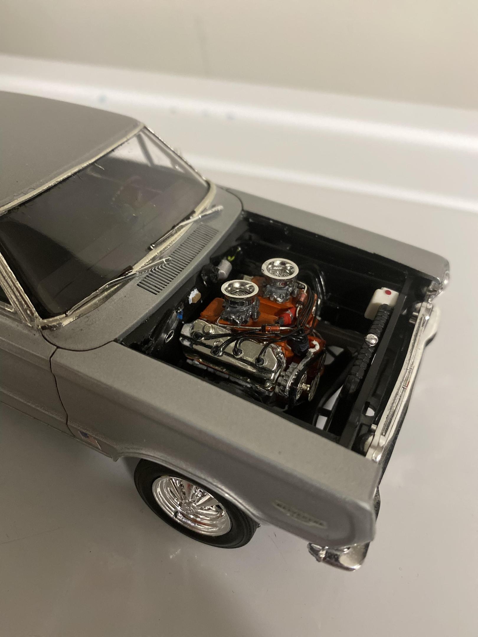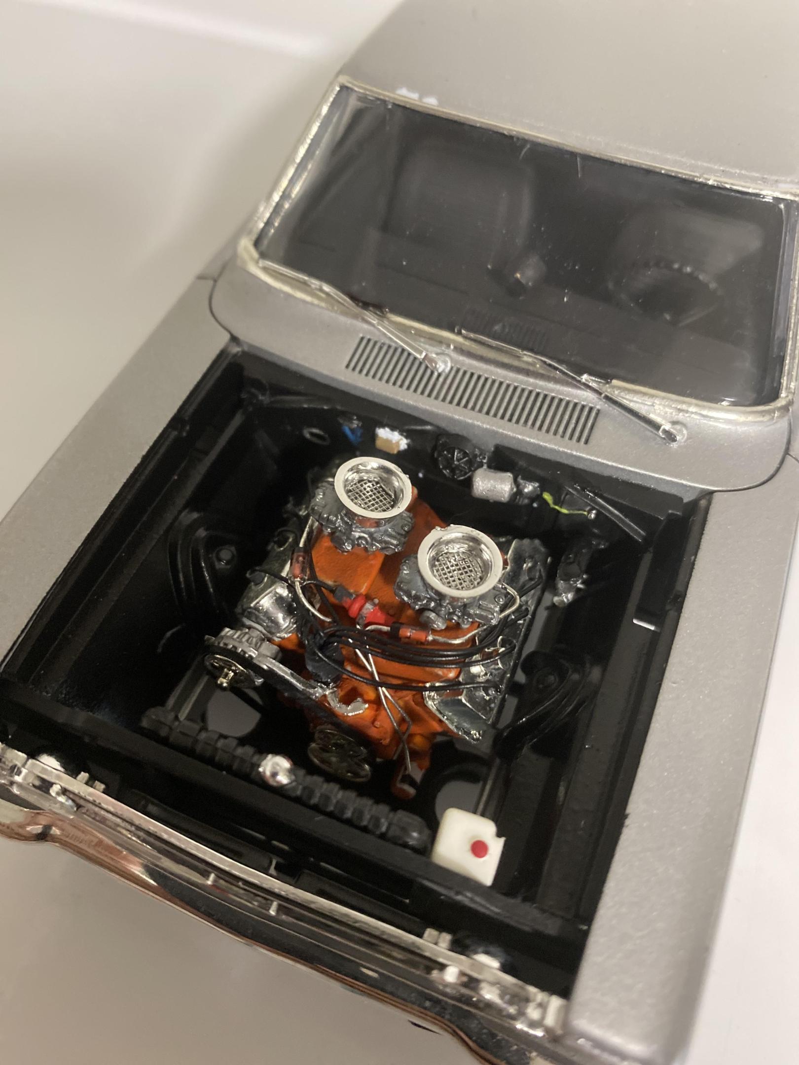 My build of Jimmy Addison’s 1967 Plymouth GTX. I scratch built the 4 Muffler exhaust system. Deleted the rear seat, scratch built the rear package tray. Wired up the motor and detailed it from reference pics. several parts from the parts bin. PE front disk brakes & parts box drums in the rear. Added valve stems to the Cragars. Period correct bucket seats as the 1:1 had.