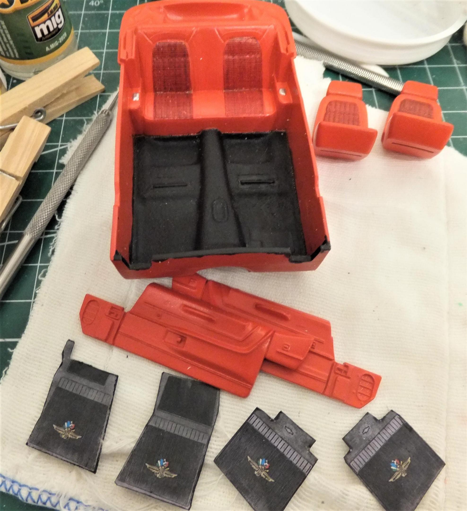 Have not updated in a while. Working on the interior and body. Decided to see if I could open the vents and am not sure it was a good idea. They are so fine and fragile as one sands down (from behind) that they are not looking uniform. I may need to rethink this idea. I do have an extra body in a parts box if need be. I also worked on the front RS grill. I stripped and opened it. I then built out the headlight area and used the Model Car Garage Camaro PE set to finish off. I think I have the depth about right. Now need to finish this off. Finally, on the interior, I have it painted, and assembly started. Used Chevrolet Hugger Orange paint from Testors. I did not flock the carpet as I fabricated some floor mats to go with. The seat decals from Revell broke apart on applying even though the decal sheet looked fine. Chalking it up to age. Fortunately, I made a copy of the decal sheet and used the backup. -