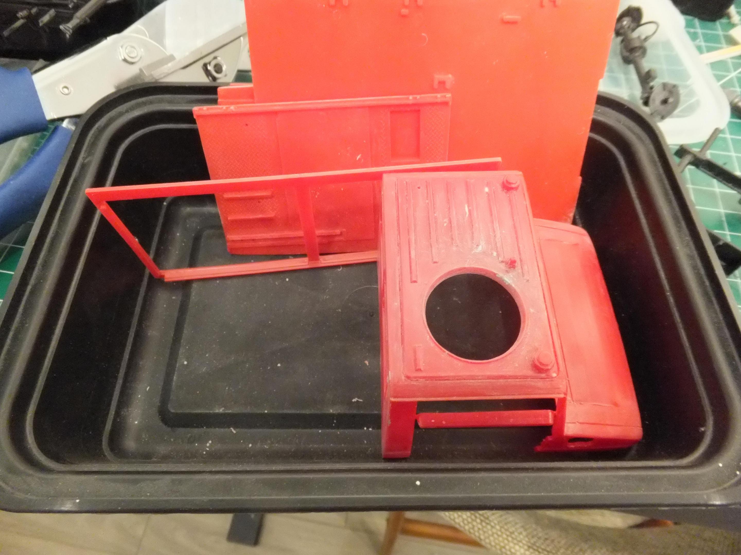 Sorry for the update delay. Even though a 30 odd year-old kit, it certainly has a rash of sink marks and ejector pin marks. Took a lot of clean up to make presentable for primer. I’ve been working on the clean up of the parts and doing some partial assemblies before primer. In looking at assembly of the storage “box”, it appeared the visible section needed to be partially assembled as it would be exceedingly difficult to insert post finish without the risk of glue marks being visible. The downside, of course, is that masking will need be done to get the distinct components painted. We’ll see if I made the right decision or not. Those are certainly 2 options I am contemplating. Next step is primer