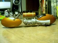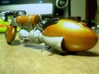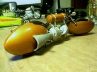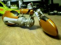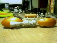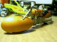 This bike is about 50% scratchbuilt, the scratchbuilt items include the frame, engine mounts, exhaust, foot pegs, kick stand and wheel pods made from plastic spoons. The engine is a Lycoming jet turbine from a Monogram 1/35? Bell Huey and the rest of the parts are from my parts box...I hope everyone enjoys!