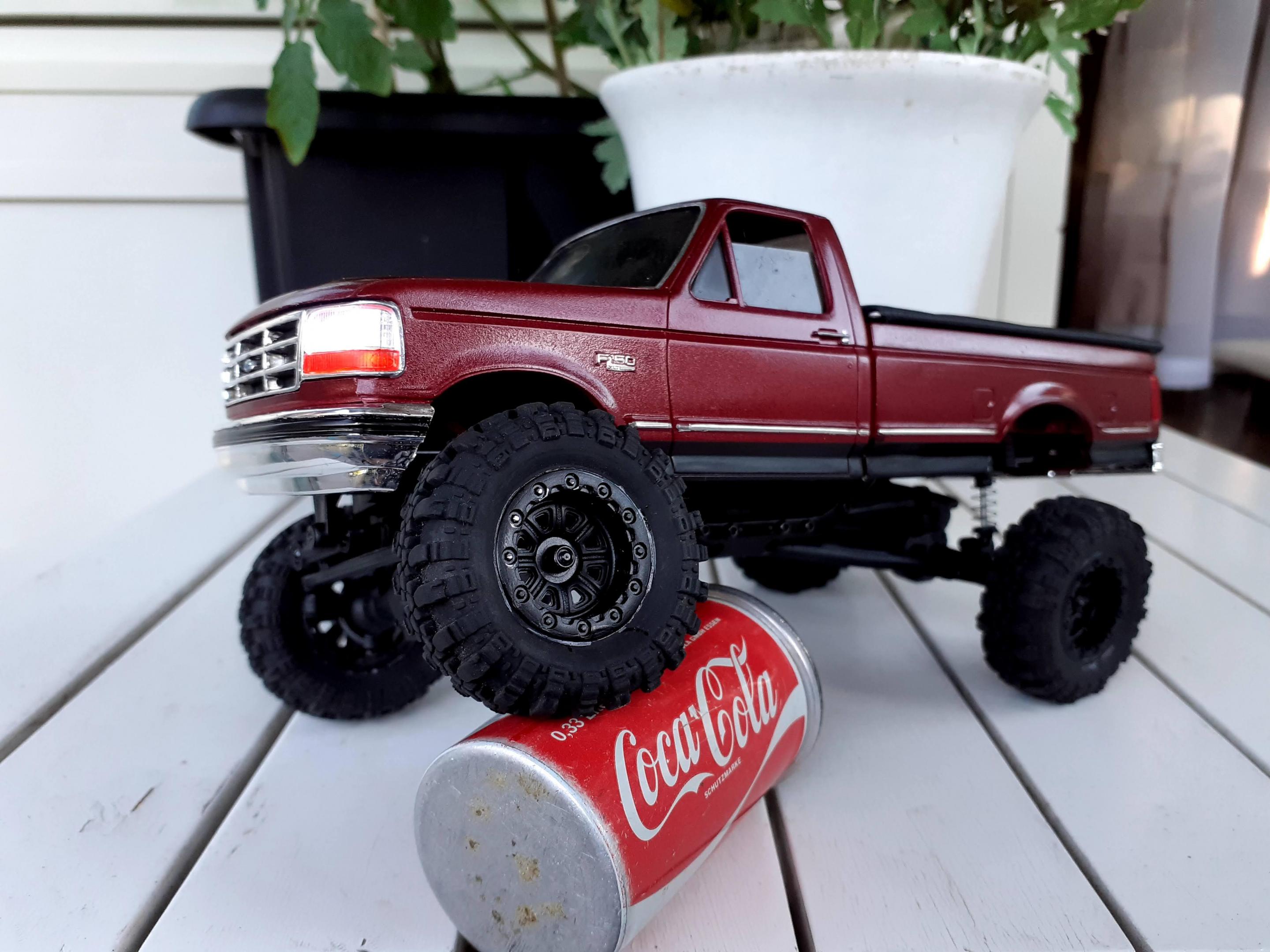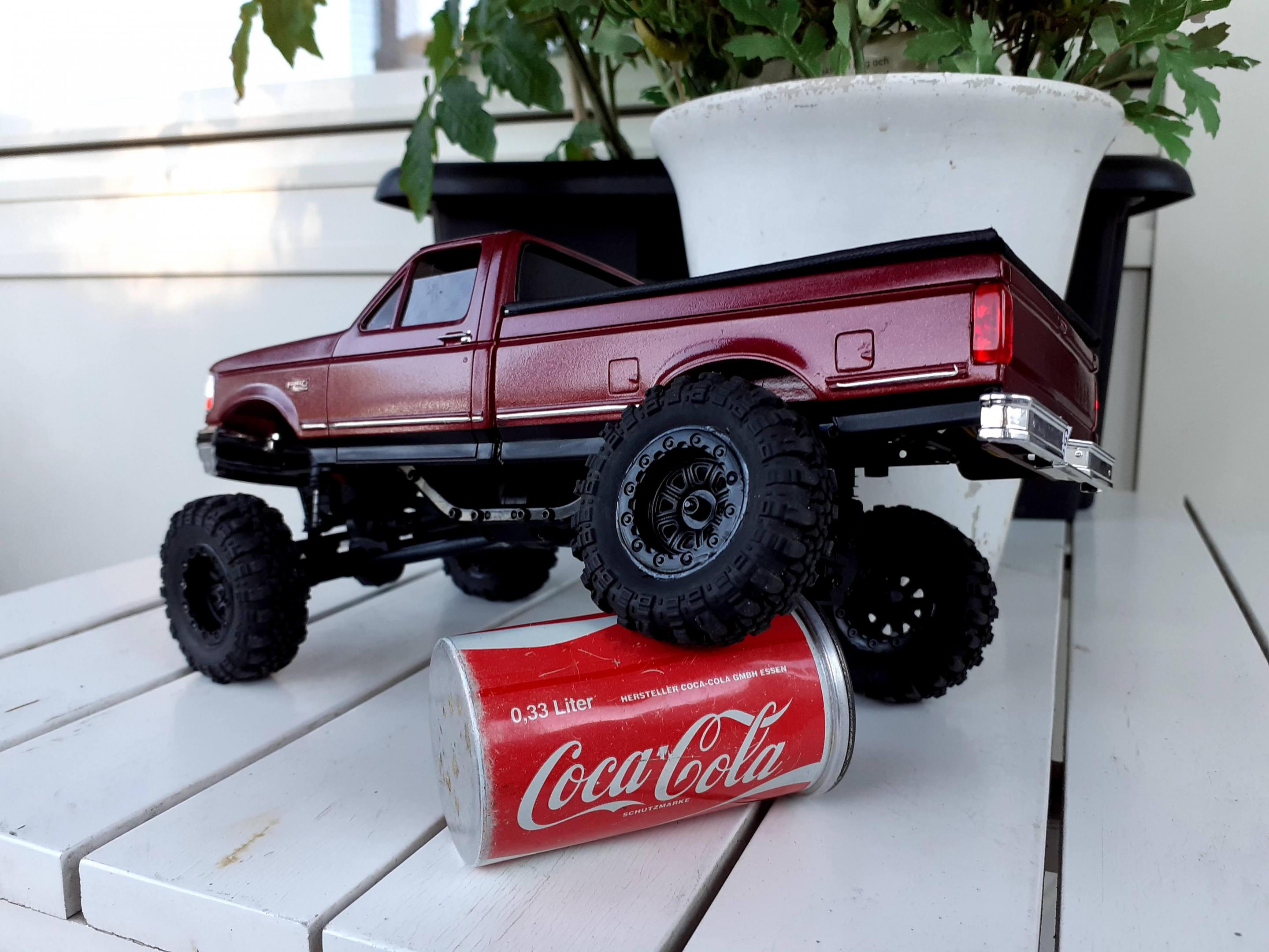 Hey, Jeff! My RC hobby started with a Traxxas Slash and an Axial Honcho in 1/10 too, but we could talk about that privately maybe. I agree with you about the scale issue. The original wheels are 56 millimeters (thats about 53 inches in 1:1). I bought a set of wheels from another brand that fit the scale much better. They measure 43 scale inches in 1:24 and that's large too. (The body is 1:25 so it's actually about 44"). That got rid of the monster truck look. The kit body is quite a lot heavier than the original lexan body. I didn't weigh it. I'll do it the next time I take it apart. All that extra weight makes it top heavy. Power is not an issue. It just topples over to easy. I'll have to add wheelweights and stuff. I know it's a modeling forum, and the fun thing with this one was combining two hobbies. I even used bare metal foil on it so it'll be a bit fragile on the trail. -