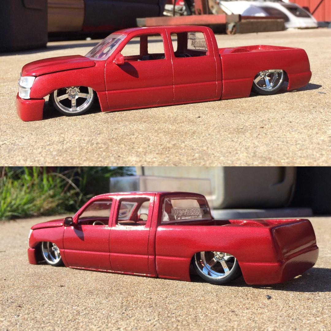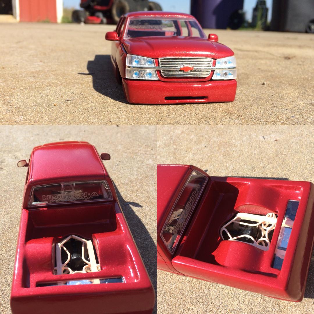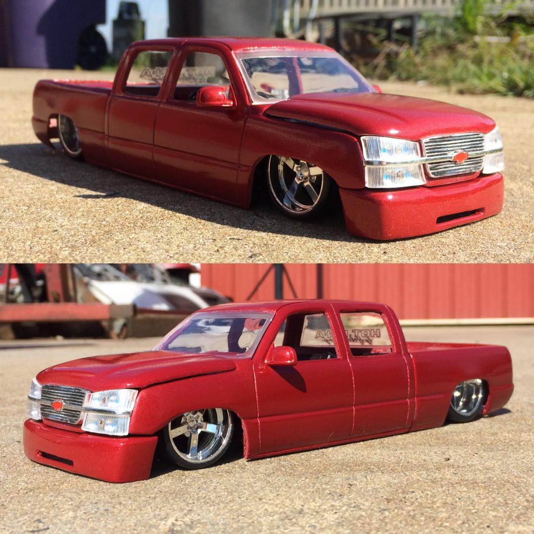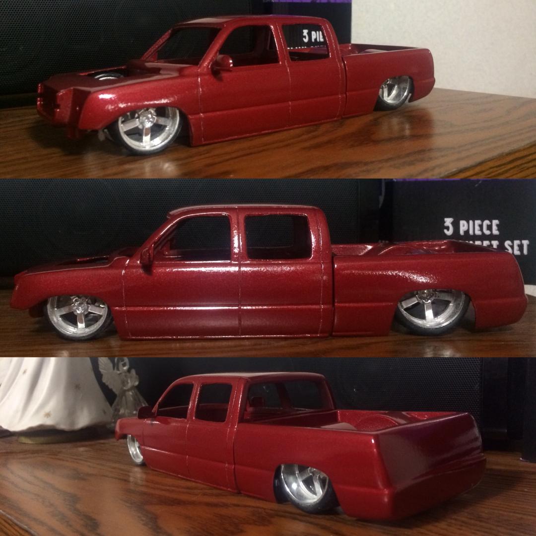 Resin crew cab body from trailer trash kustoms.cut off the 06 style front end from a diecast along with the wheels as well..a lot of body modifications to smooth everything out and built a whole new bed floor to show off some of the frame work.chopped off the headrest and built a console from the dash back with 3 subs.