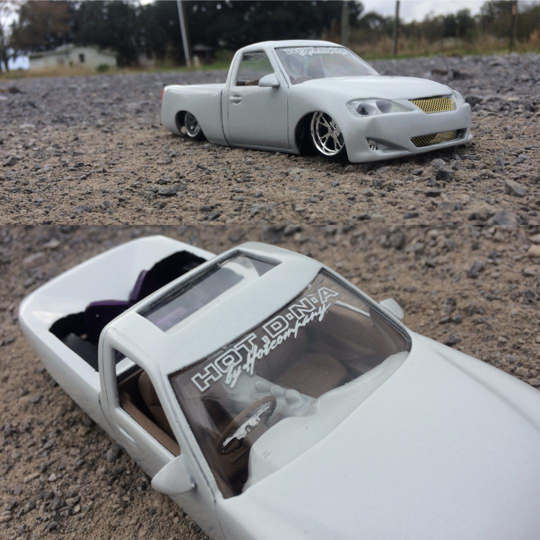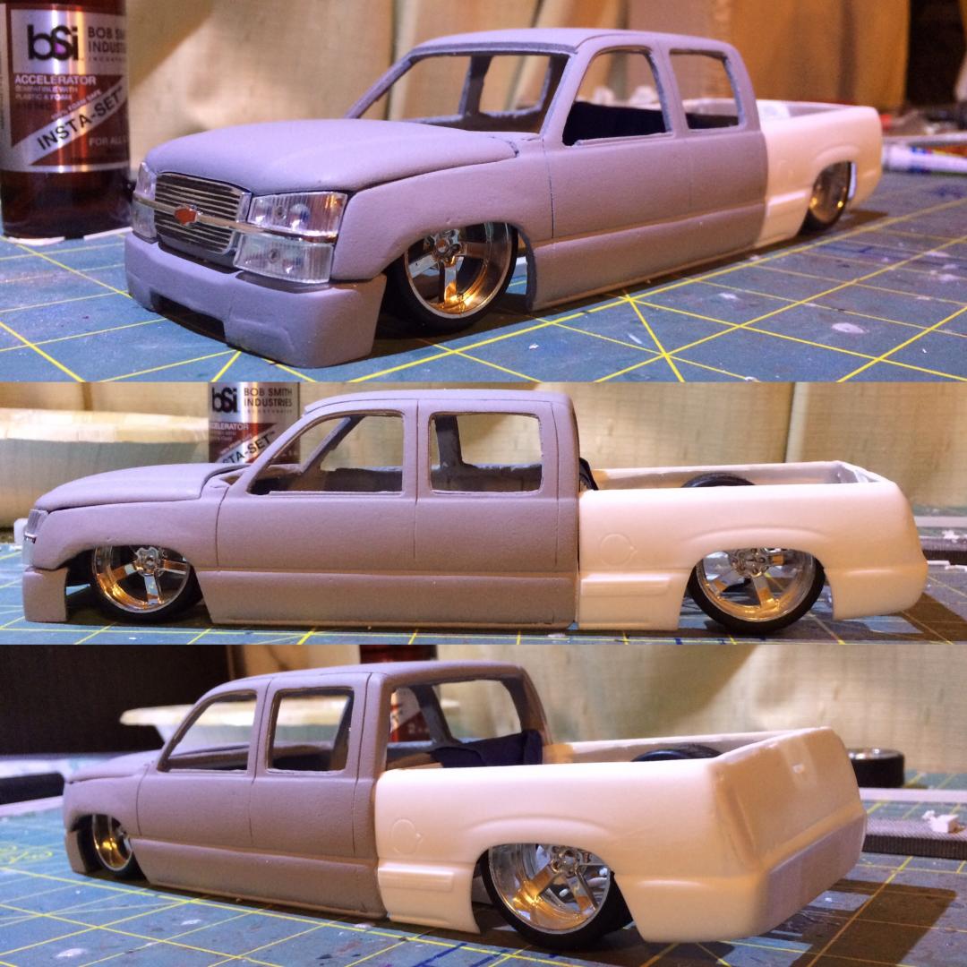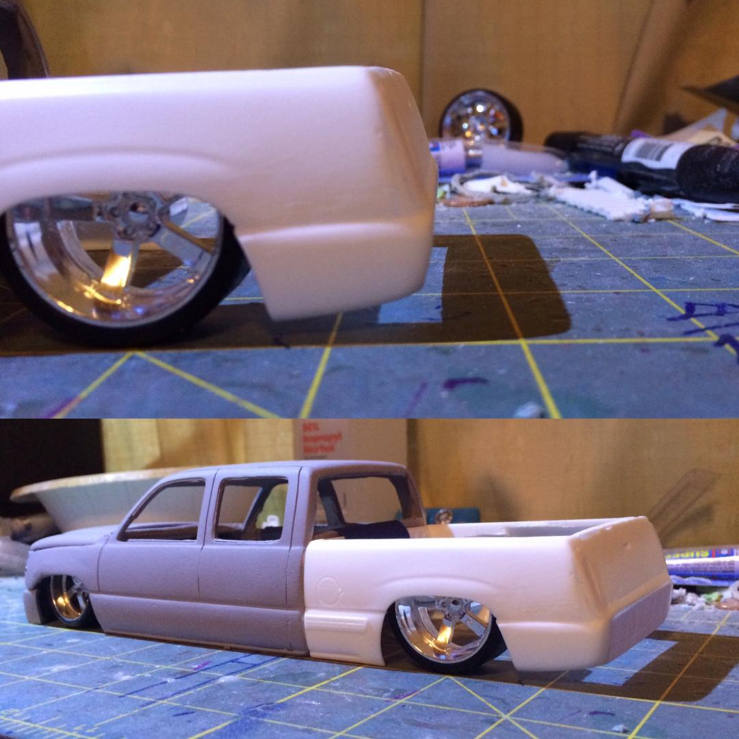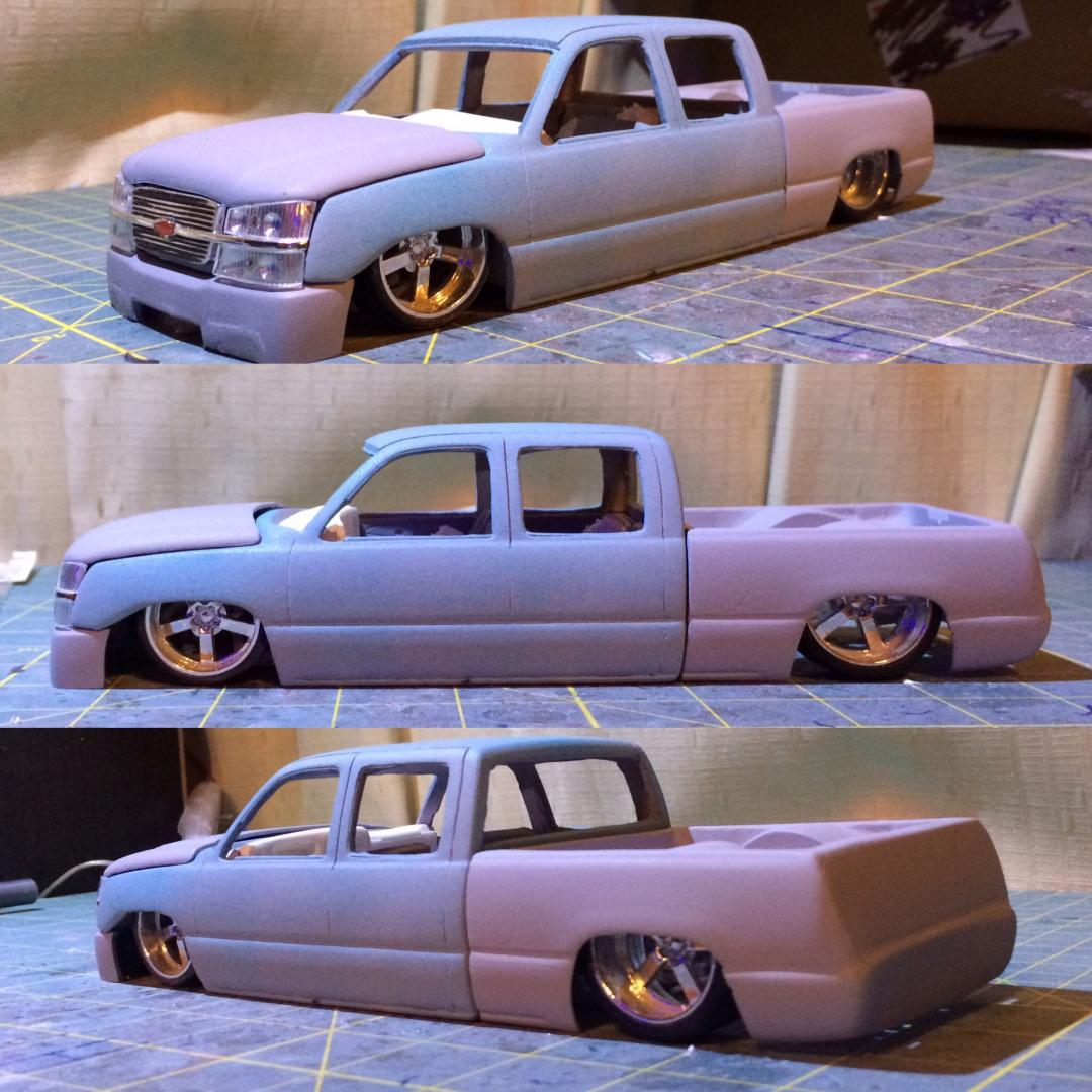 Resin crew cab body from trailer trash kustoms.cut off the 06 style front end from a diecast along with the wheels as well..a lot of body modifications to smooth everything out and built a whole new bed floor to show off some of the frame work.chopped off the headrest and built a console from the dash back with 3 subs.