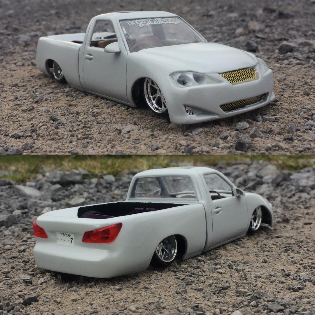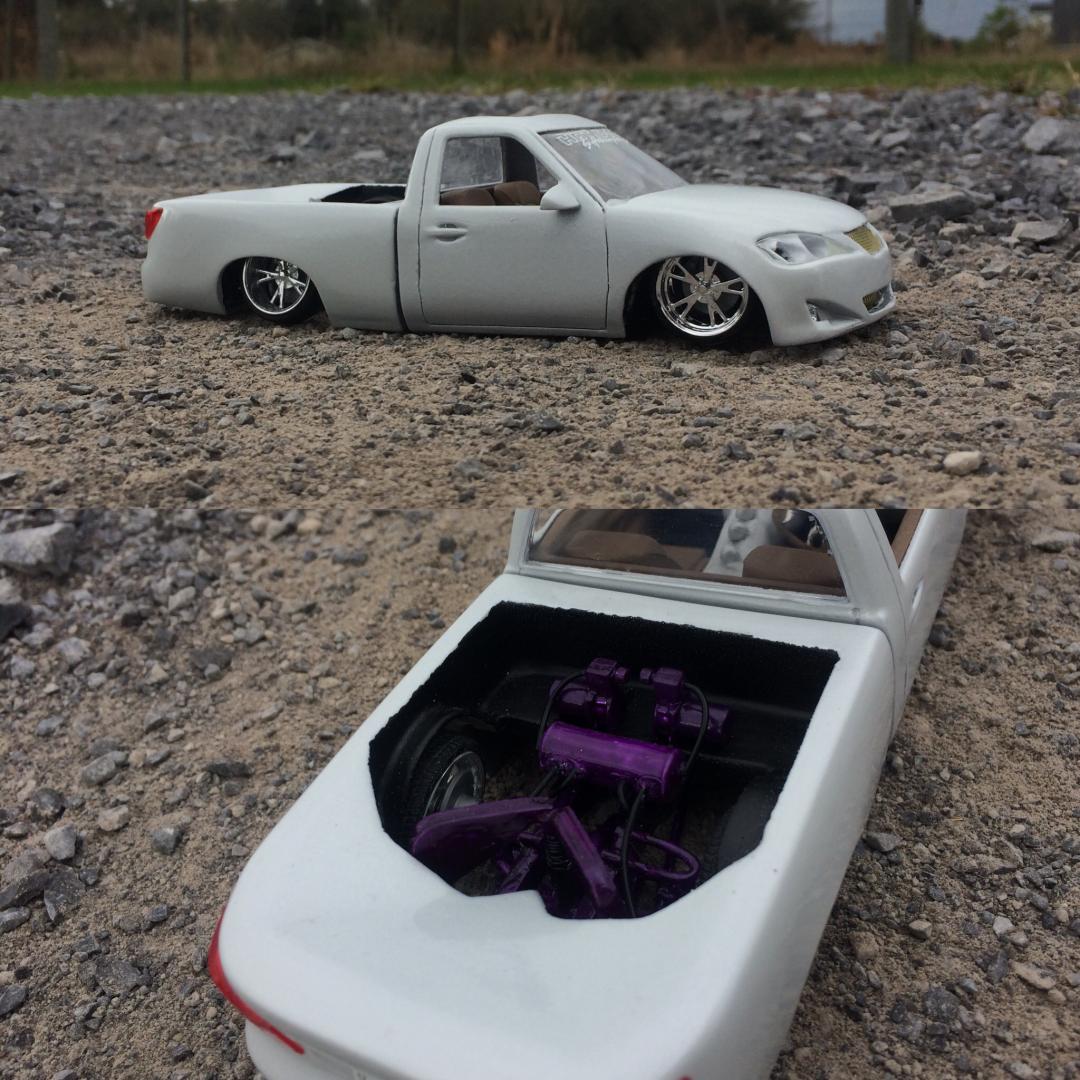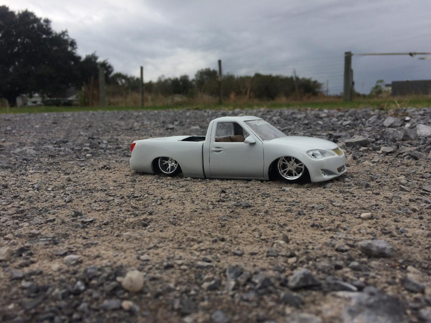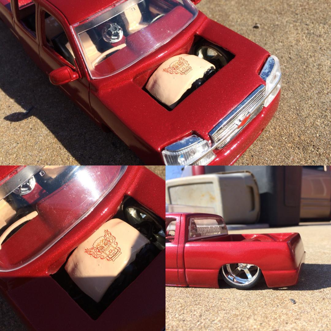 Resin crew cab body from trailer trash kustoms.cut off the 06 style front end from a diecast along with the wheels as well..a lot of body modifications to smooth everything out and built a whole new bed floor to show off some of the frame work.chopped off the headrest and built a console from the dash back with 3 subs.