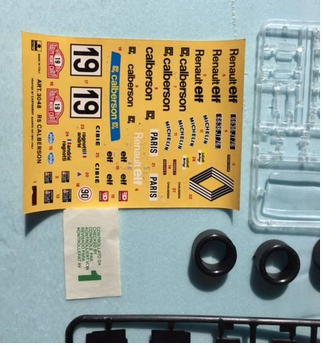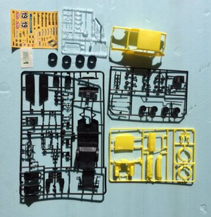 8. This retro-review covers ESCI's long out of production 1/24 scale Renault 5 Rally car. I love offbeat and unusual subjects and Renault's 5, known as the Le Car here in the states, hits both of those marks. It is only a quick shoot and post as I don't have a photo backdrop or decent lighting. I just thought there might be some others who enjoy weird little cars as much as I do. I actually have two of these kits, the Gitanes and the Calberson versions. For the purposes of this post, I am picturing the Calberson version as the only difference in the kits is the decal sheets and the colors the bodies are molded in. I bought these kits in Naples, Italy at the fleet-landing gift shop over twenty years ago and just came across them in storage last weekend at my Mother In Law's.(She Who Must Not Be Named) I also found an unbuilt ESCI Gelandewagen Paris-Dakar, which I plan to start as soon as I actually get room on the table, and a Volkswagen Golf Rally car, so all in all it was a good Thanksgiving for me! I seem to remember buying the ESCI Series 1 Ford Escort rally car, the Audi Quattro rally car and a Range Rover as well. Can you guess what subject I was into back then? Maybe I'll come across them someday. I don't have any history to relay on this kit, (maybe there are some ESCI experts out there?) but I'm pretty sure ESCI produced it in other variants as well. I seem to recall seeing a red and possibly a green one in US hobby shops back in the day.All ESCI kits I have seen are packaged in large format boxes about the size of the special edition kits AMT does. There is no printed production date on these two boxes, but the cool box art paintings are helpfully signed by the artists. The Gitane's artwork was done by someone named Giglioli in 1980, while the Calberson's artwork was done by R. Cappello in 1984. The body is very good proportionally, looking better than a lot of new-tool kits I have bought. All parts are crisply detailed, with very little flash and only faint parting lines. It should require little in the way of clean up. The Calberson kit's body parts are well molded in a bright yellow, the Gitanes car's body is in a blue close to Grabber blue. The body is molded in one piece except for the hood and rear hatch which are separate. The chassis, engine and interior bits are molded in black and are on one large sprue. The only real issue with this is that the sprue containing these parts is slightly too wide for the box, meaning the guy who packed the kits had to sort of bend it to get it in. Luckily it doesn't appear to have warped the parts themselves. The interior is platform style with decent detail on the separate side panels and dash. It includes two nice racing seats for the driver and navigator. The engine is pretty simple but should respond well to detailing. The way it is designed reminds me of AMT's Volkswagen Rabbit kit of the 70s. The wheels, roll-cage and rally lights are also black and are on a separate sprue. I really like these rally lights and may have to mold them so I can put some on other kits.The windows and all lenses are on a clear sprue. Of course this sprue was not wrapped, so the windshield is a bit scratched, but it should polish out.The taillights are molded on this sprue as well, so they will have to be painted transparent red. The tires are wide, low-profiles with only a faint pebbly finish on the tread. I didn't scale them out but they fit an AMT wheel, so I'm guessing 15 inch. They also have raised outline type lettering on both sides. One side has Goodyear, the other Dunlop. The tires are fitted to three-lug Campagnolo(?) mag-style rally wheels. The decals seem in very good shape for so old a kit I think they will still be usable. The ones on the Calberson car are printed by Cartograf and represent the car as raced at the 1978 Monte Carlo Rally, and the Gitane car's were by a company called "G.Decal, Italy" The sheets in both kits are nicely done and quite thorough. For the Calberson, the only thing not included is the red stripe around the bottom of the body which will have to be painted. I don't know where ESCI's molds ended up, but I would sure love to see some of their kits back on the shelves. This is my mini-review such as it is, the pictures are not great, but I hope you enjoy it. Let me know what you think.