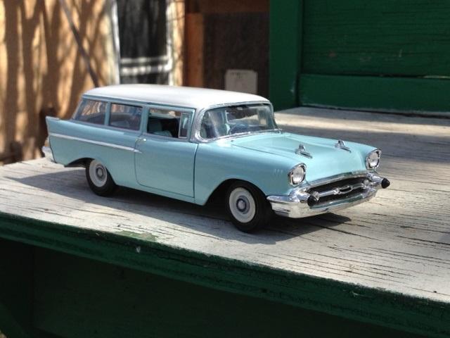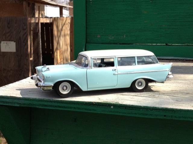 Here is my '57. It 1/25 and started out as a Jesse James diecast that I found at Walmart years ago. They came with a custom paint job and were lowered with hydraulic stuff in the back. I turned it into a basic Chevy family car. I stripped it and repainted it in the closest thing to a stock Chevy color that Krylon makes.