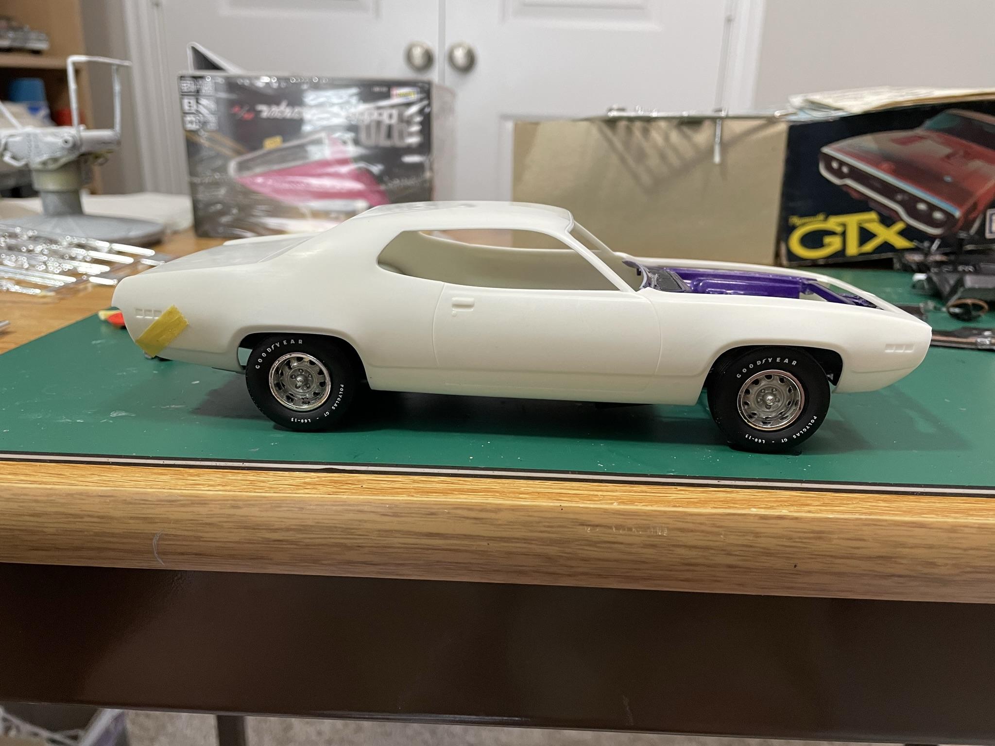 I was able to get the Hemi wired and some primer on the body. If the weather holds up for tomorrow I’ll have some purple on it.
