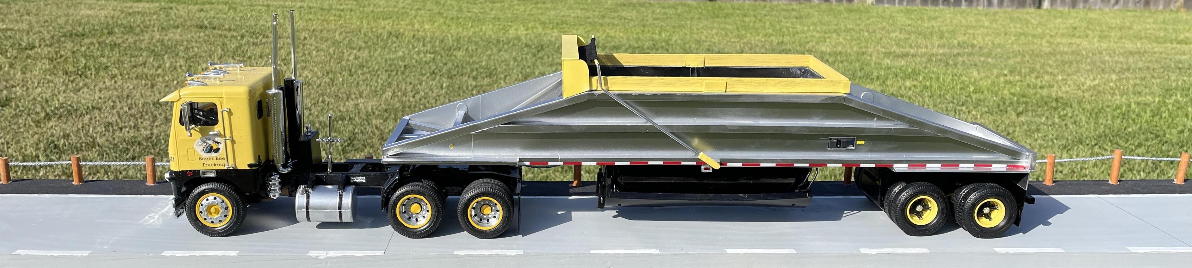 My Super Bee Trucking fleet needed a bottom dump trailer and seeing that there’s no bottom dump trailer kits I decided to design and scratch built my own. I used the Load King trailer for my reference data on the dimensions and style of the trailer. There’s a WIP post of the building of the trailer. The fifth wheel plate pivot’s, the bottom gates open, landing legs are adjustable and the load tarp opens and closes. I’m starting on a Dodge LS1000 day cab to pull this. The Frightliner and Mack used in the pictures already have dump trailers. Your comments are always welcome and appreciated.