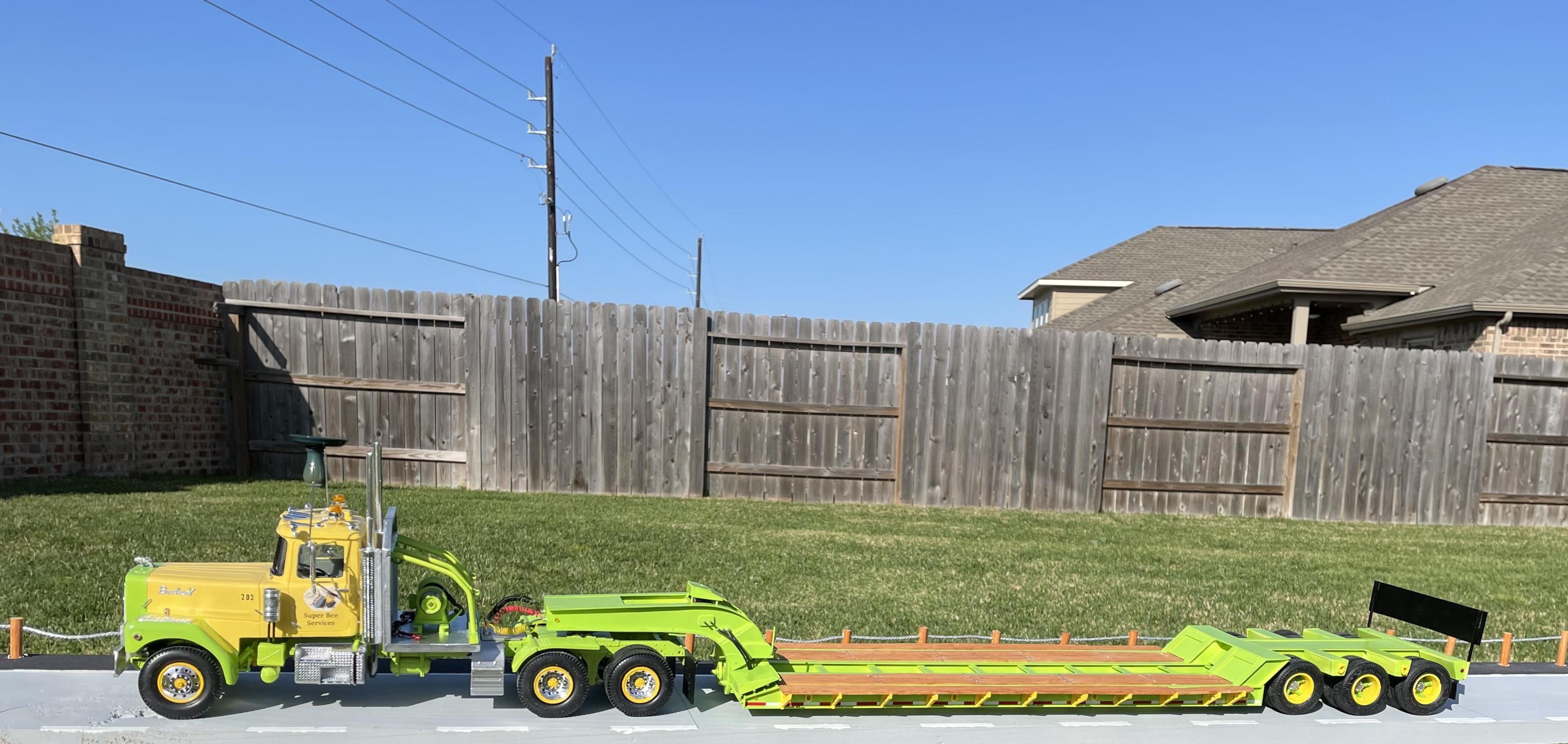 This is another detachable lowboy kit from Stace. I wanted this one a different than the first one I did. I made the goose neck similar to a Dorsey trailer and did my own rear suspension. This one will be carrying a bulldozer so I’ve got to outriggers opened up for the wide load. As always your comments are always welcome and appreciated.