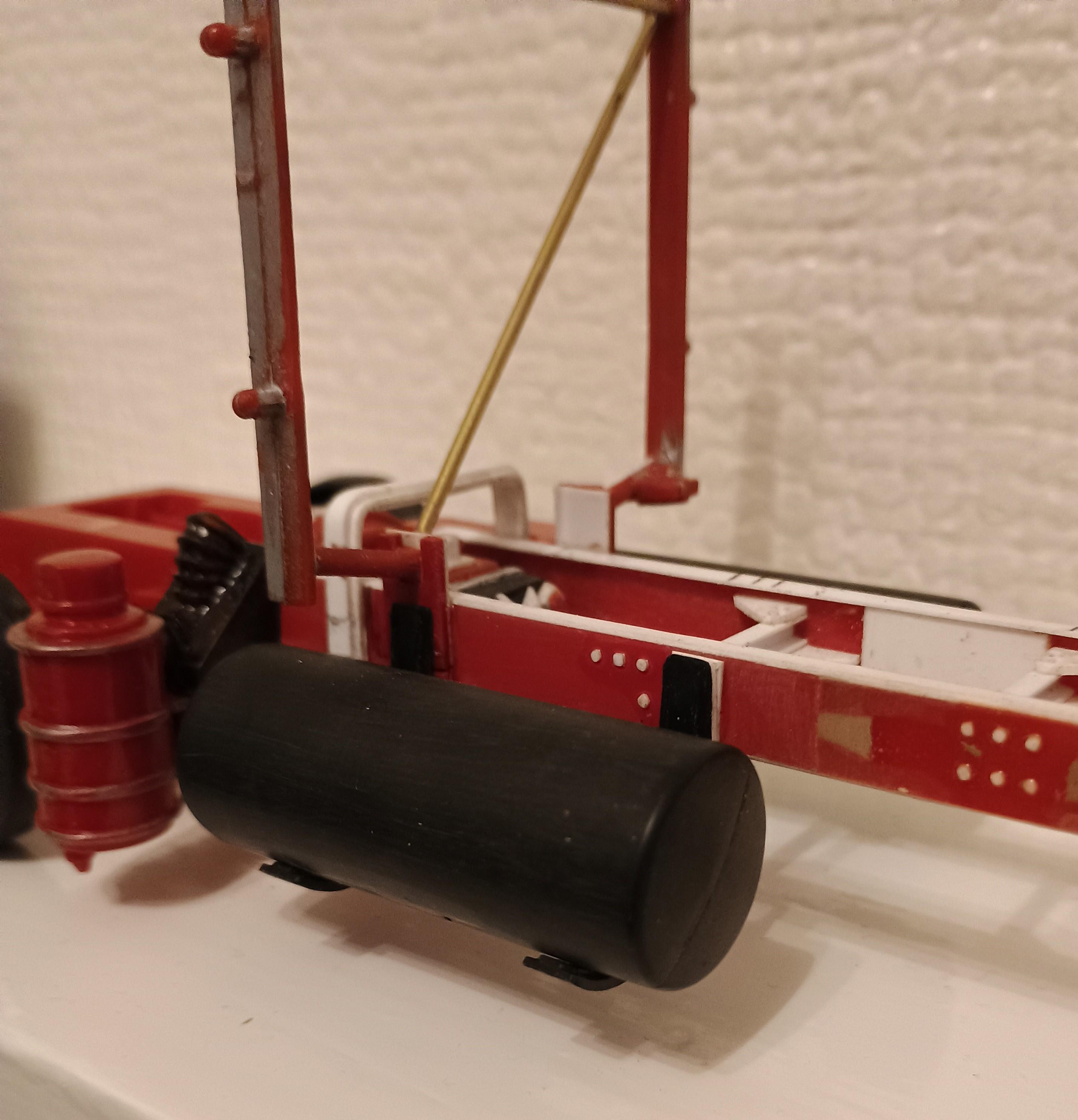 Had some bench time this afternoon. Modified the Aerodyne interior to suit the new cab size. I sectioned the tub behind the seats (arrow) and then had a small amount to trim off the back of the upper bunk. I used the trimmed piece as a filler panel to ensure a tight fit. It practically touches the cab roof so I'll just put a valence in front at the top and hide it. Looks ok in situ, needs a repaint. Changed the air intake stack for a more mundane top hat style. Looks more in keeping. It actually comes from the AMT Aerodyne K100, I just added a flange to the cap and some straps. Tank straps! I added 90 degree angle pieces to the tank brackets and used 3mm strips of electrical tape to form the straps. They look ok I think. -