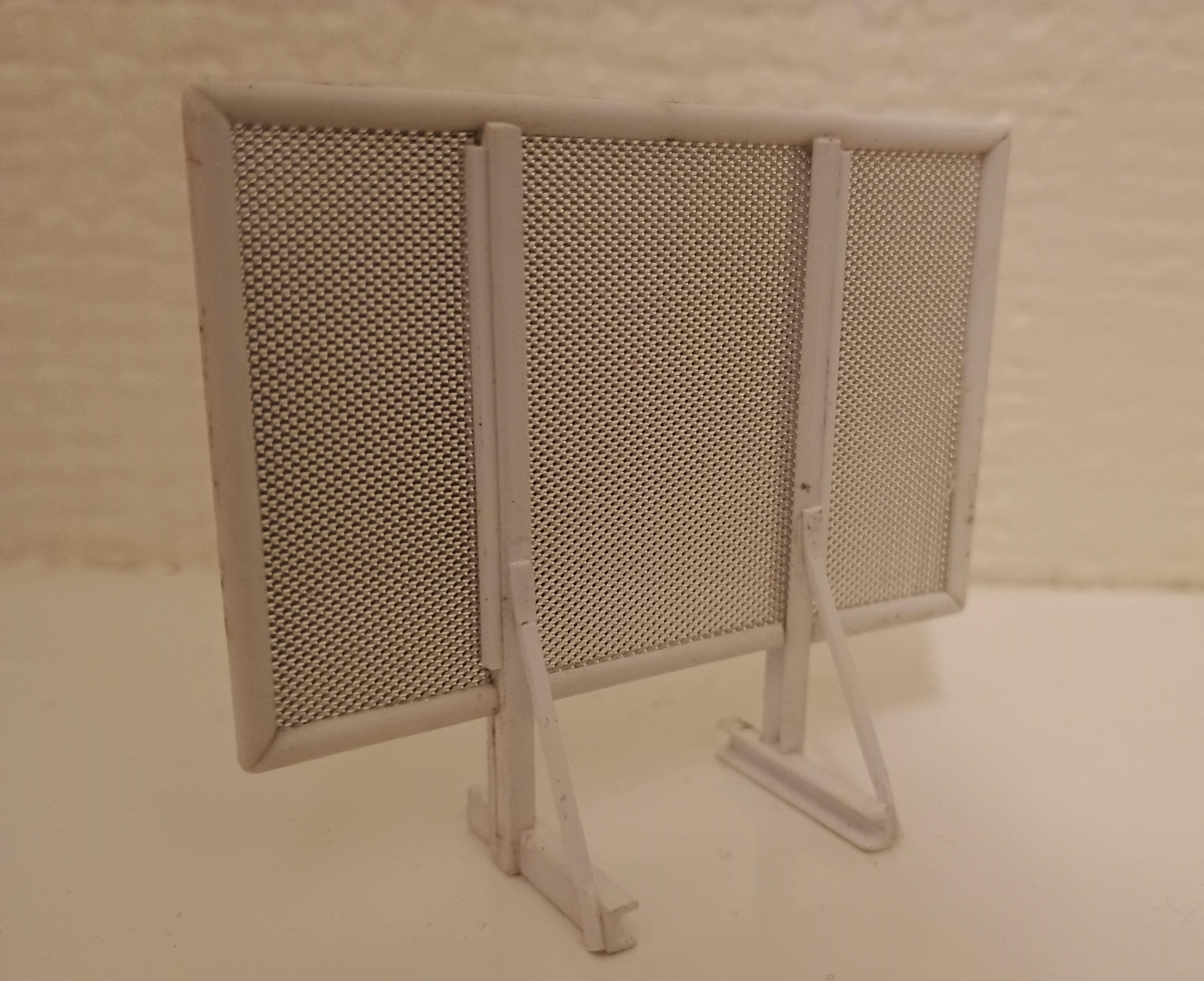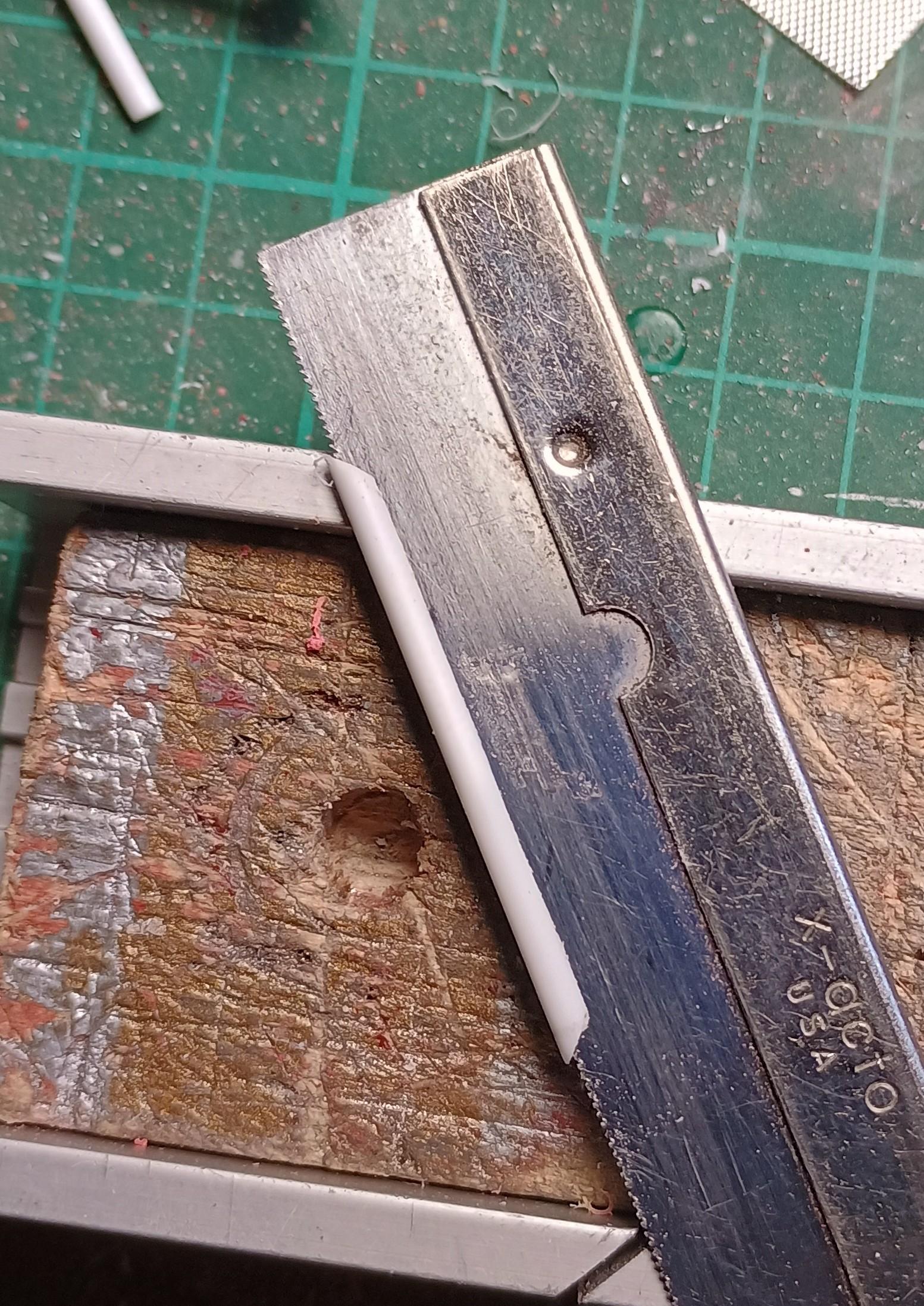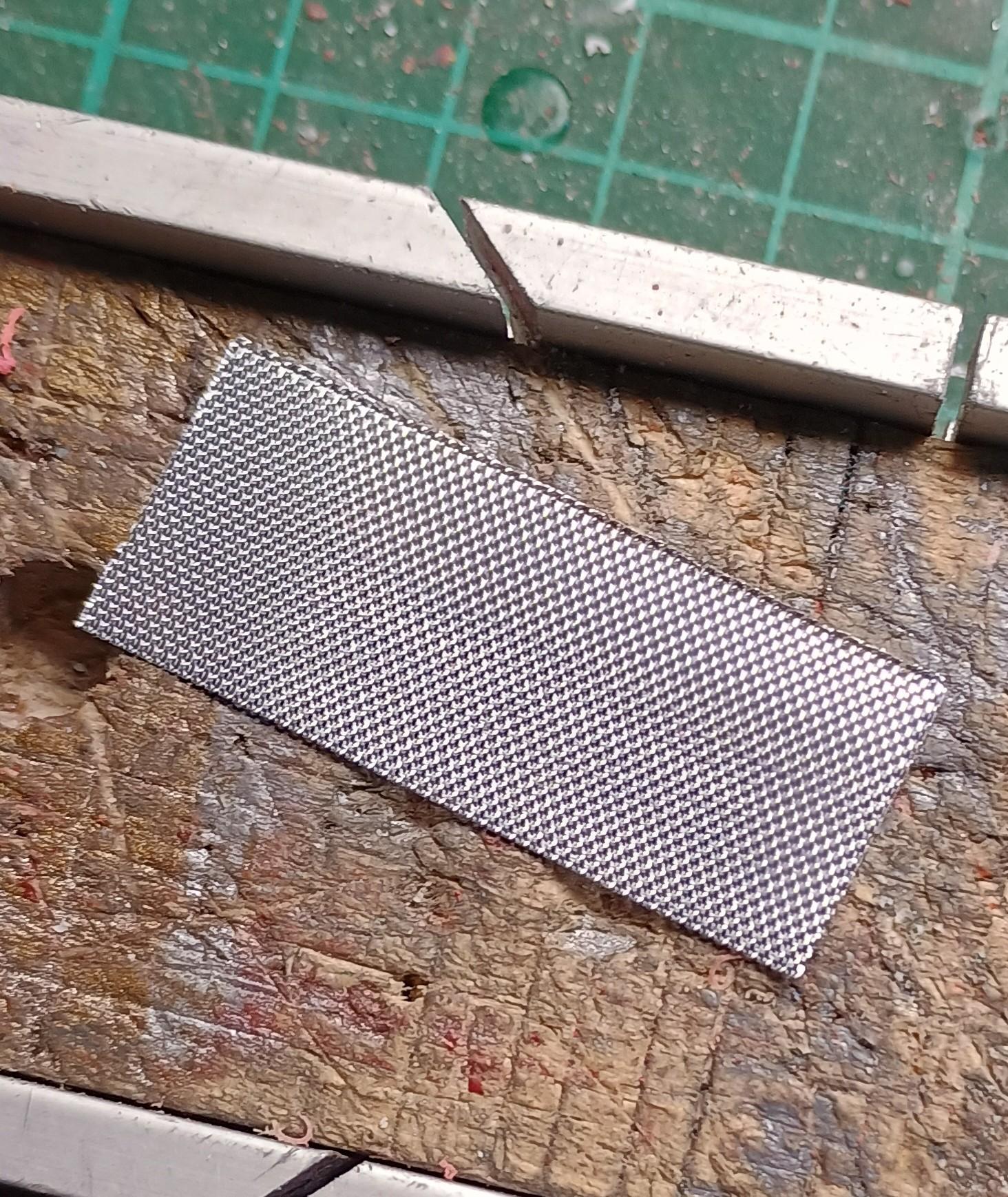 Bit naughty in the current temperature and humidity but I got a little primer on the cab to see how it looked. OK to me. I also built a headache rack similar to the one in the Movin'On truck. I tried forming the outer frame using 2.3mm plastic tube and a heat gun for round edges and it was ok until I tried an adjustment and it snapped. I decided to use straight lengths with mitred corners. On the inner edge of the frame I cut a groove into which I fitted aluminium mesh. I added two main supports and braces, looks ok. I might put a rear window into the back of the cab, as in the truck in the episode. I think it had a lace curtain on it! -