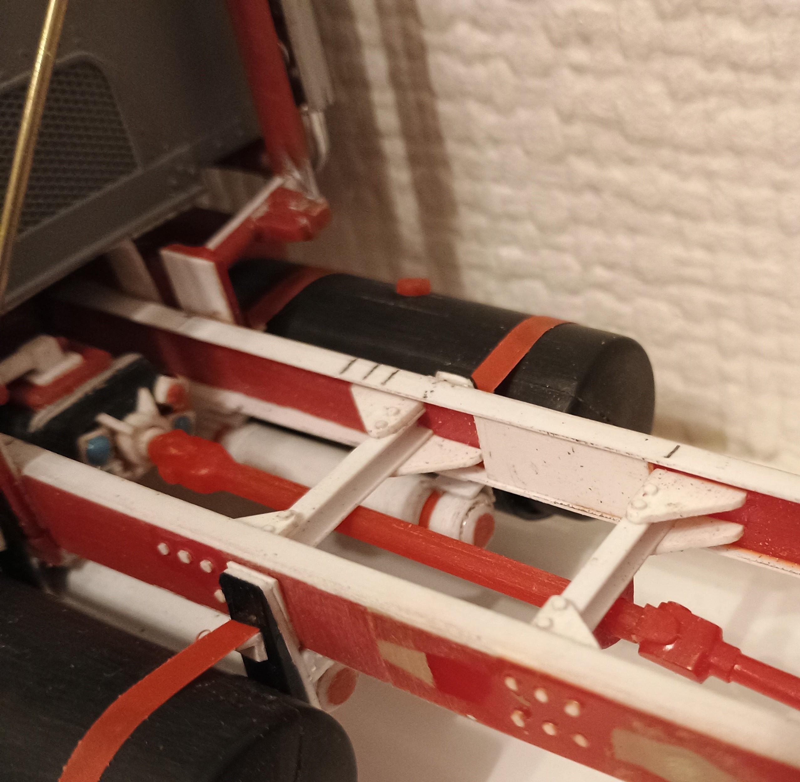 It's been so busy lately with work on the house, I'm racing against winter but I managed an hour or two today. Built a rear light and licence plate bracket. Added some detail to the spring hangars on the rear tandems. Will have to add the radius arms also. Built two air tanks and mounted them on the fuel tank brackets. -
