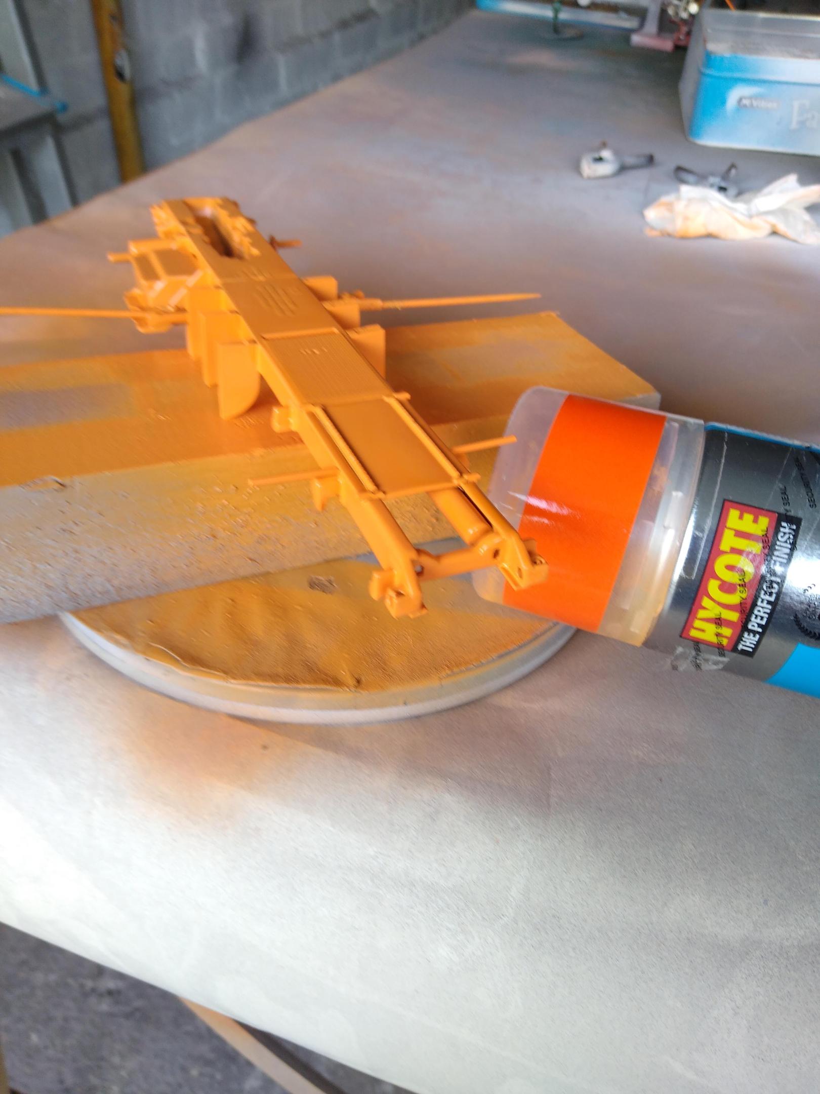 It's done nothing but rain here recently, but got a decent day Friday and had a few hours spare so decided to get the chassis and tanks painted. I had bought a vibrant Orange from Hycote but sadly it didn't come out as vibrant as I'd hoped. Finish is ok. Put everything back together and looking good. Tried another way to deal with the hollow Monogram "tyres", I sliced the sidewalls off some of the hundreds of spare SMT tyres and put them into the Monogram "tyres". Not fantastic but fills the void that is usually there. I'm sure someone will think that the tyre sidewalls shouldn't touch in real life as it causes heat related tyre failure but this will do. I can't understand why the aluminium paint turned out so dark on the rear wheels. Maybe the shape caused me to put it on too thick, the fronts turned out fine. Not sure what to do. -