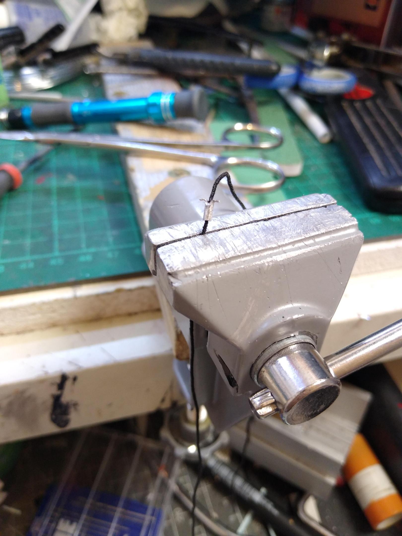 Using 1.5mm aluminium tube I made some palm couplings and the electric plug. I crush 2mm of the tube as much as possible, then shape the flattened part into the round head of a palm coupling. On the electric plug I cut a groove down the back and bent the sides out to form the pull tabs, looks acceptable. Bit of elastic thread and draped them over the pogo stick. -