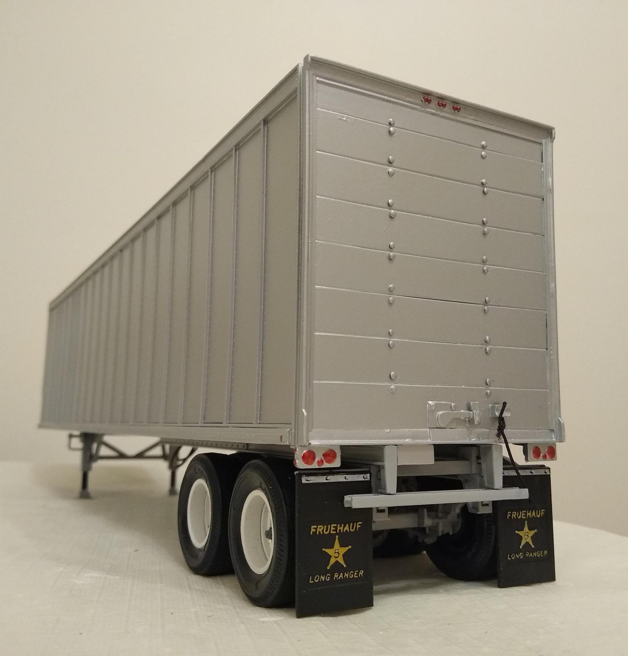 My 1/32 exterior post van is no longer a dream, it's now a thing! It's a Fruehauf Reefer dismembered into roof, sides and bulkhead, then converted using 1mm square rod. Fabbed a roller shutter rear door, modified the wheels to sink the spiders further in, made the landing gear operable, reset the suspension height, converted it to Fruehauf F2 lightweight suspension too. Looks good behind trucks of the era. Just imagine the Pete pulling it into a hot, dusty truck stop in Arizona, the trailer suspension squeaking and banging over the potholed surface, the rear shutter chattering with the bumps... I'm glad I took the leap because it was rather scary and impulsive.