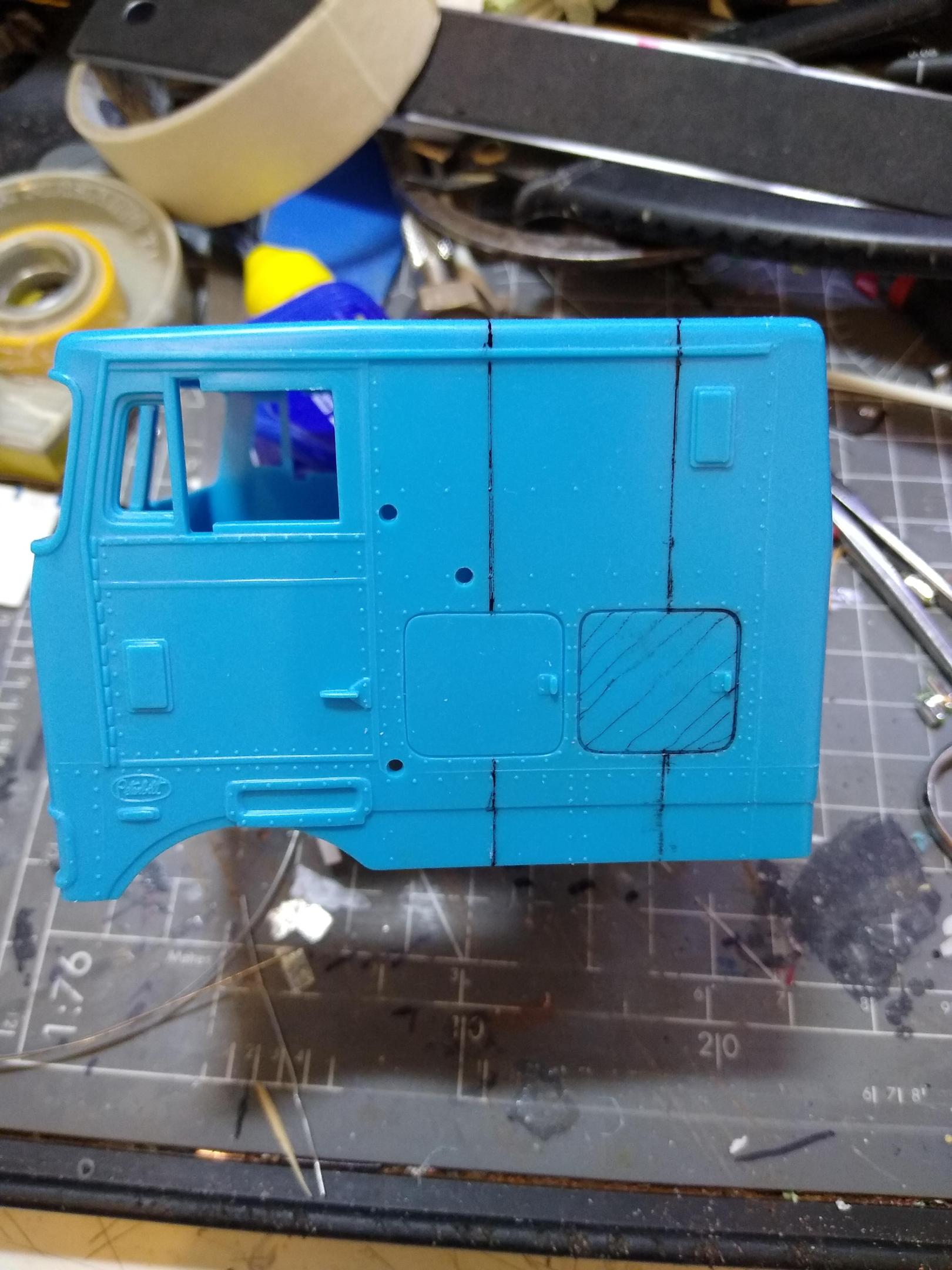 Force and I were talking about trailer colours for Sonny Pruitt's rig (the van is bare aluminium but my query is the chassis: silver or grey?) and he reminded me of something that's been nagging at me for a while. The trailer had a side door, the Monogram one doesn't. I'd considered laying one out in plastic strip but I wasn't happy about making a handle, the lock bar, the hinges etc ... The Fruehauf doors are too tall because the side doors are smaller and couldn't be cut down tidily. Then I realised that, of the two AMT Trailmobile doors I'd saved recently, I only need the LH one, the RH would be perfect for the job. I marked the van where the door opening is and then gently scribed the lines with a knife. Took a hobby saw and gently dug into the cut until it went through, then took the cut to the limits. The opening was purposefully too small so I could use the door as a GO-NO-GO guage until it fitted all round. Two pieces of card stock behind for support and plopped the door in. Still needs the reinforcing piece under the lower rail but looks good to me! -