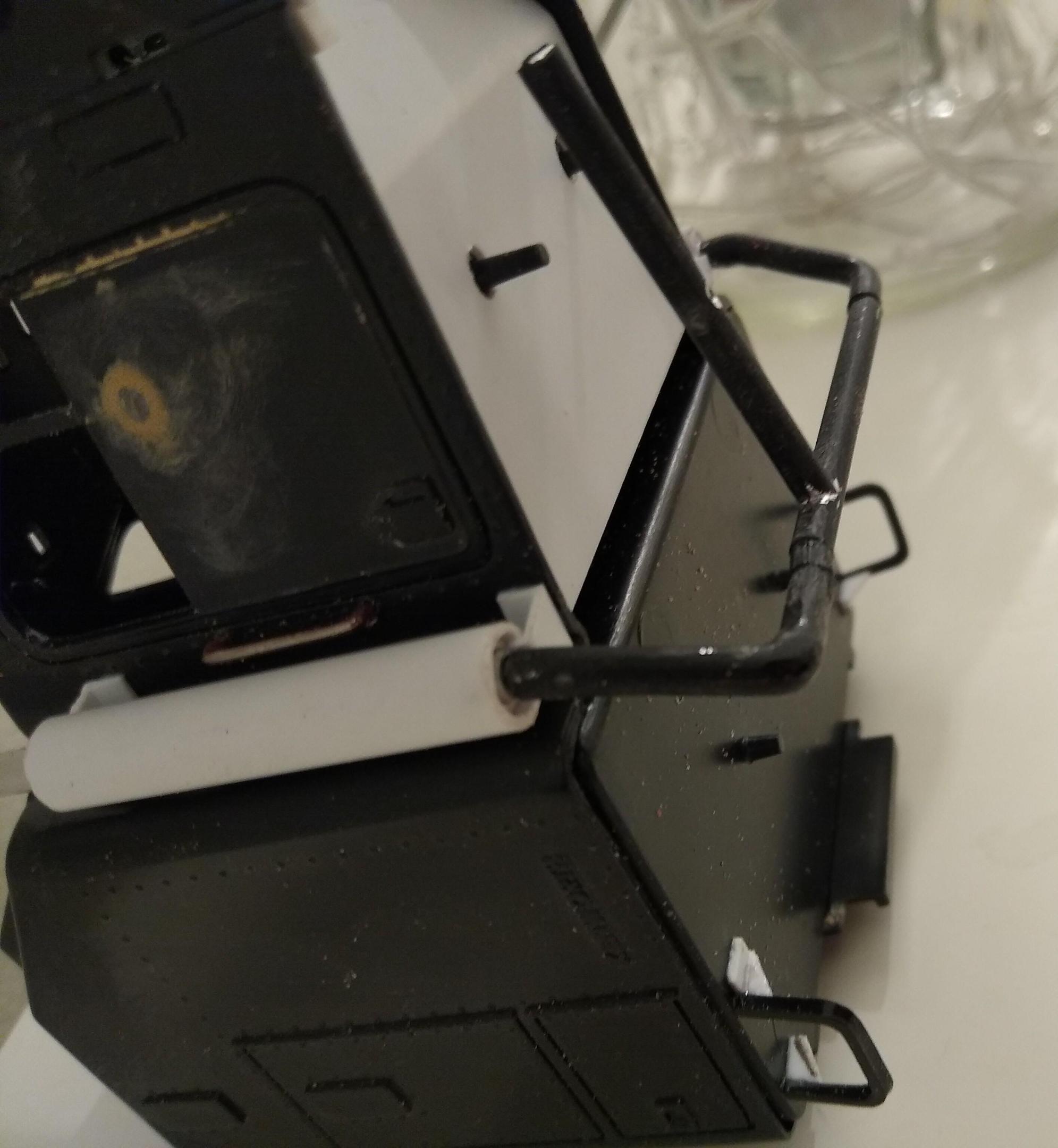 Tried the kit glass in the cab today and it really wasn't going to cut the mustard. With adding the weatherstripping to the aperture it makes the glass even more recessed. Also there's no wiper detail. I had a spare Monogram T600 windshield piece, so I separated the panes and filed each one down until they sat in the recesses almost flush. However, they kept dropping out and going wonky so I had a moment of genius! I decided that the driver would have both sunvisors turned down on a sunny day. I made two and glued them in place. Then I glued a piece of scrap against the lower edge to finish the dash and I now had two ledges to push the glass up against. The results are good. Then I dropped one of the panes, stepped on it and broke the bottom of the wiper arm off. Miraculously found the tiny broken piece, picked it up and dropped it again. Can't find it now. I can't repeat my thoughts but I'll look again tomorrow. Kit mufflers and stacks were atrocious so made my own from aluminium tube and plastic tube. Fabbed some brackets from C section and got them glued in place. I can pull the stacks out when they are set firm, will paint the mufflers with the cab and then find some aluminium tube to slide over them. Also drilled the holes for four grab handles off the T600. So small progress, but progress nonetheless.
