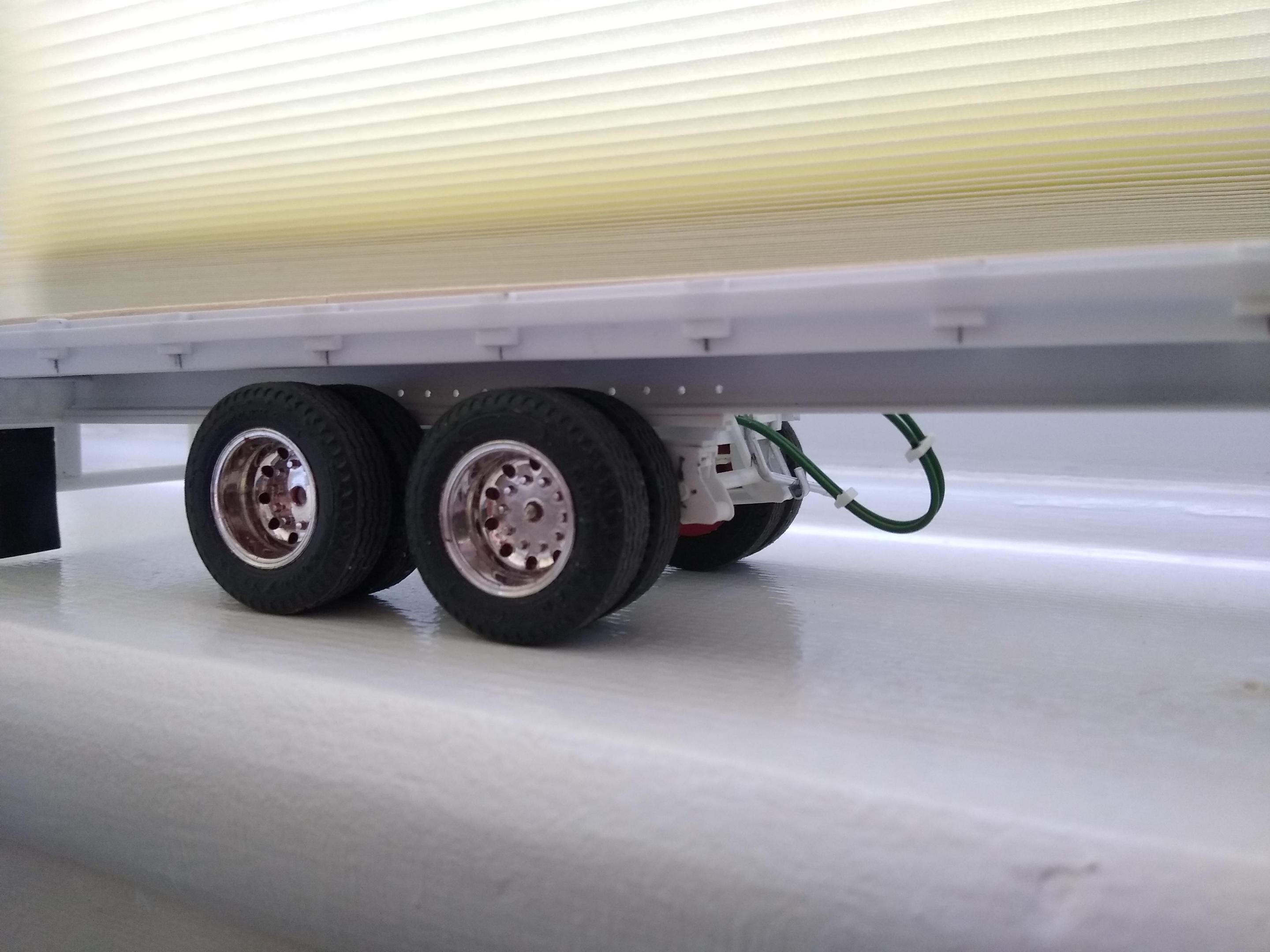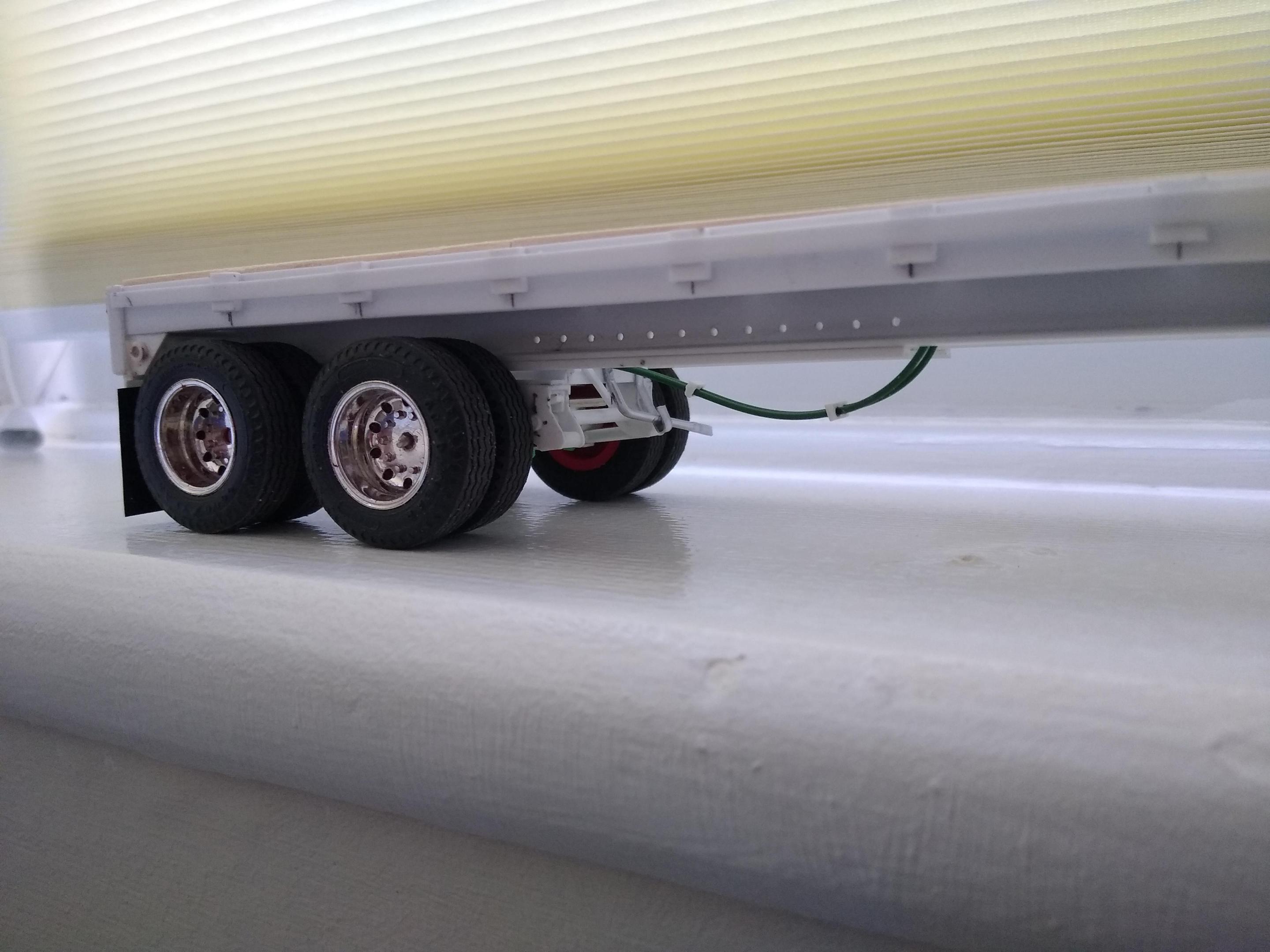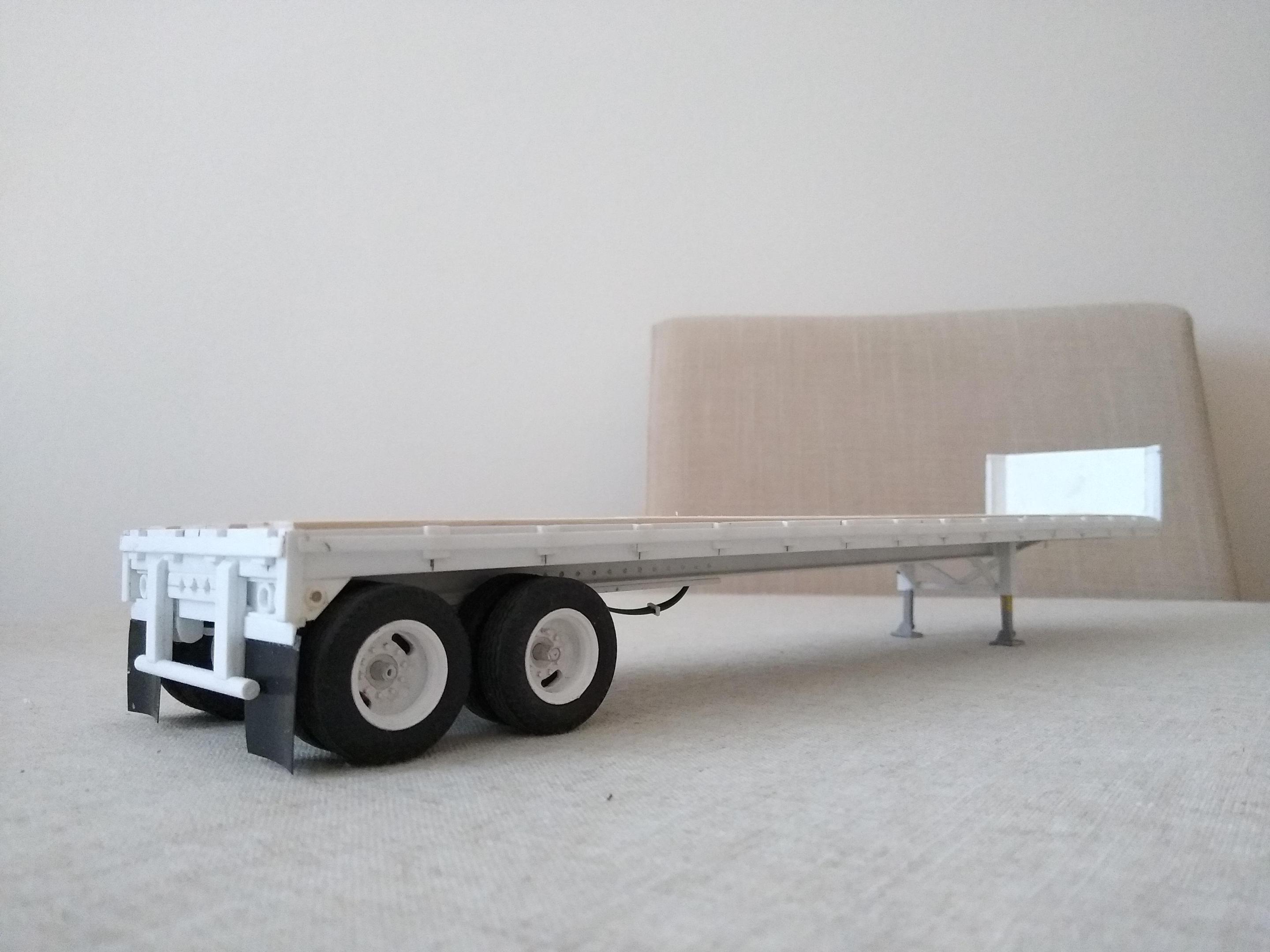 Everything on this trailer is scratch built except for the wheels and tyres and the sand shoes on the landing legs. I wanted a flatbed to go with my assortment of 1/32 tractors but at this scale there's only dry vans, reefers and the fuel tanker. My only option was to modify a diecast unit or build my own. Looking at the die cast stuff I could see it really wasn't suitable, the suspension detail was dire so I chose the "build" path. I bought various plastic profiles from a hobby shop and set to work copying the construction of the real thing. I modelled it on some Trailmobile trailers on auction websites. The rear tandems slide and the landing legs operate. The paint is Post Office Red over red oxide primer. I modified the AMT 1/32 chrome wheels to look like 2 hole Budds. I made my own decals for the mudflaps using Microsoft Paint and reduced some Trailmobile badges for the front and back. This has been one of the most satisfying models I have ever built. I'm over the moon with it and am now wondering what I could build next, despite having 4 projects on the go already. I'm thinking of a removable goose neck trailer. ?