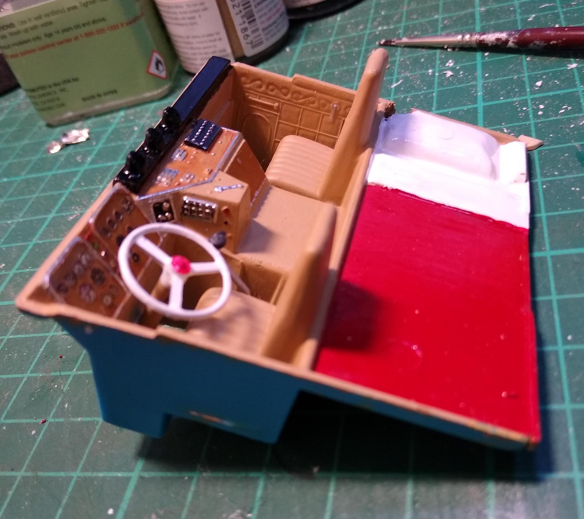The miserable, wet weather is starting to pass now here in Liverpool so thoughts have turned to painting the Peterbilt. First I thought I'd do the interior and get my Cummins painted. I know it should really be white but I only ever worked on Cummins that were buff coloured so they look right to me that colour. Let's just pretend that the original white engine was having an in-frame after a million miles and they found a crack in one of the top lands for the wet liner on cylinder three so a replacement engine was sourced. Anyway, it looks ok to me, it'll only be seen through the gaps under the cab so does the job. Painted the interior, used BMF on the clusters then washed in dark brown to mimic the faux wood veneer. Didn't want to do too much because you can't see much once it's in place, but again, good enough. -