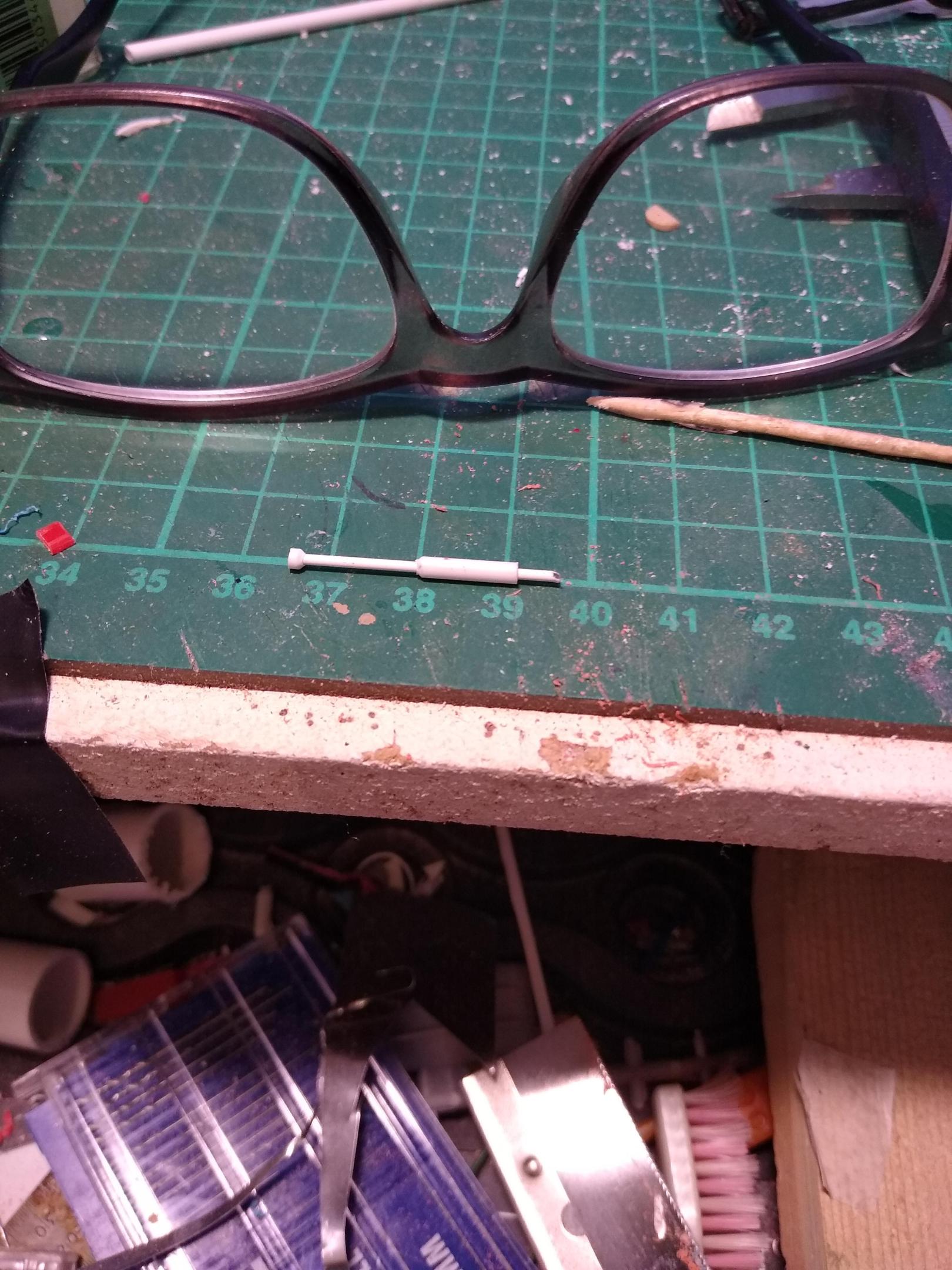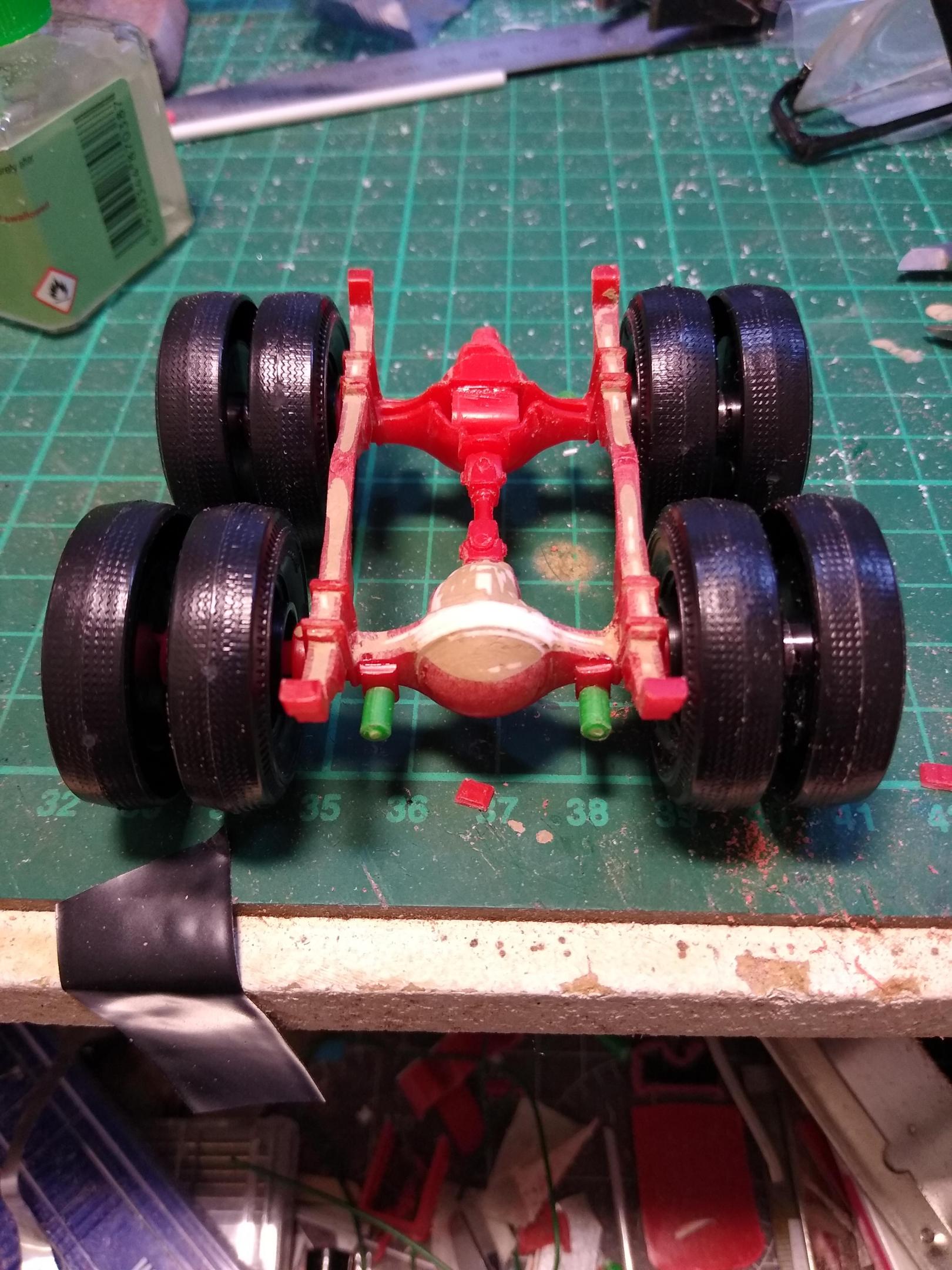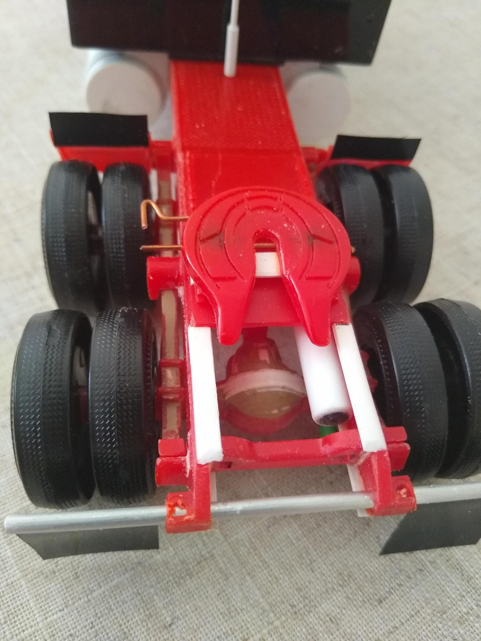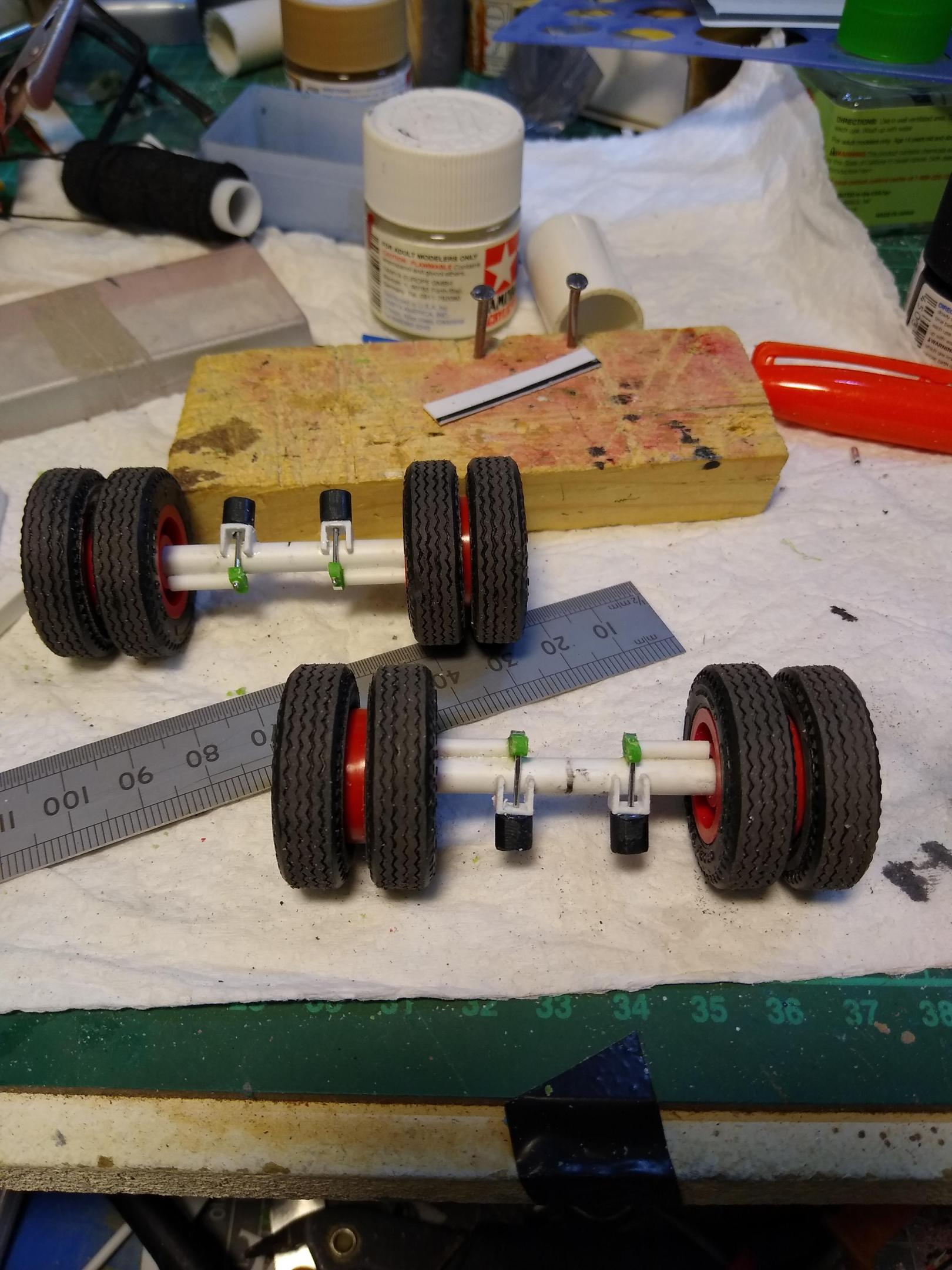 Rubbed the putty down on the rear axles, quite pleased with it. Added some rudimentary brake chambers. Used some spring steel wire and hollow tube to knock up a pogo stick, drilled the deck plate and looks ok to me. Also removed the hard plastic quarter fender flaps and made new ones out of electrical tape.