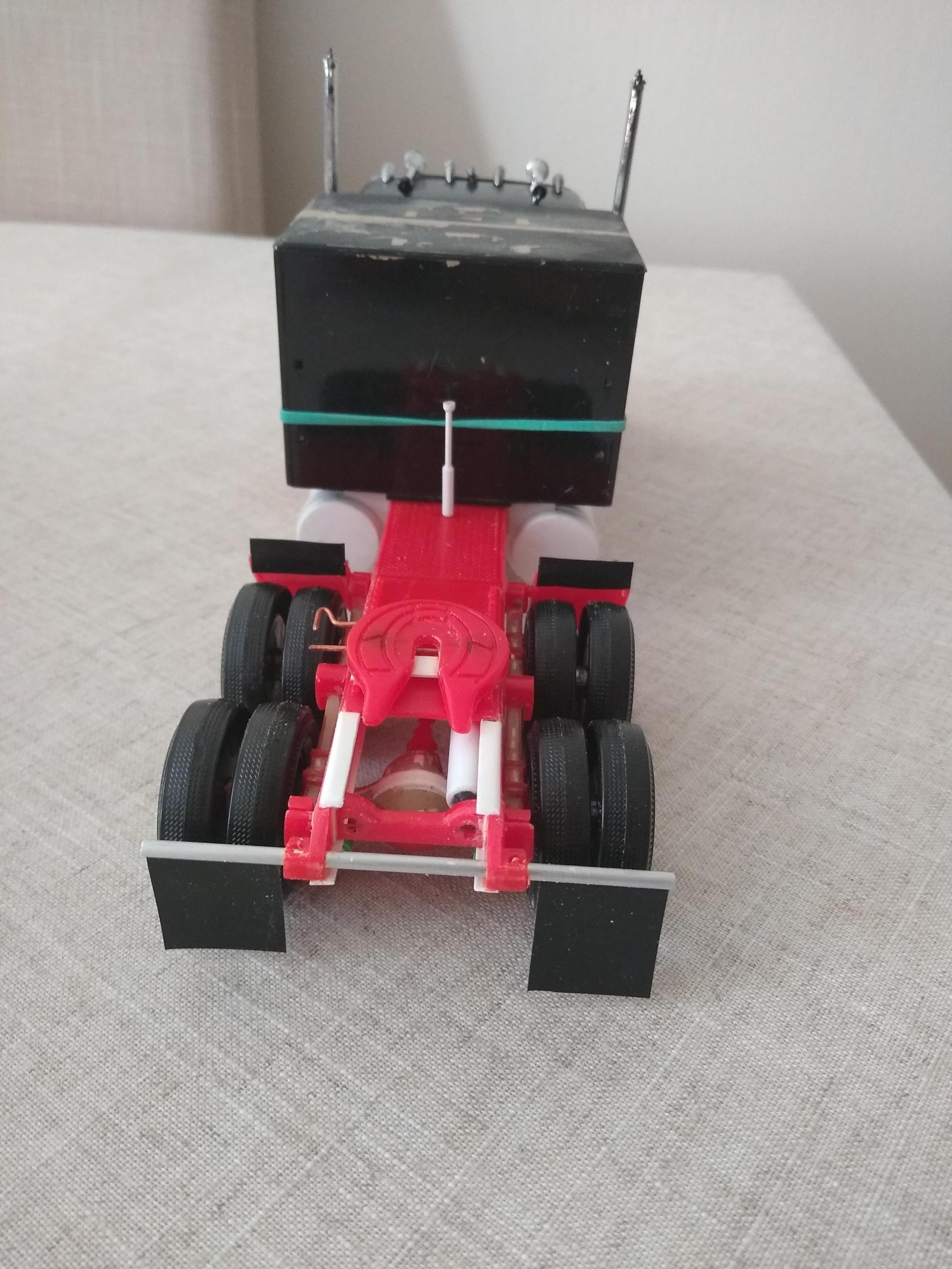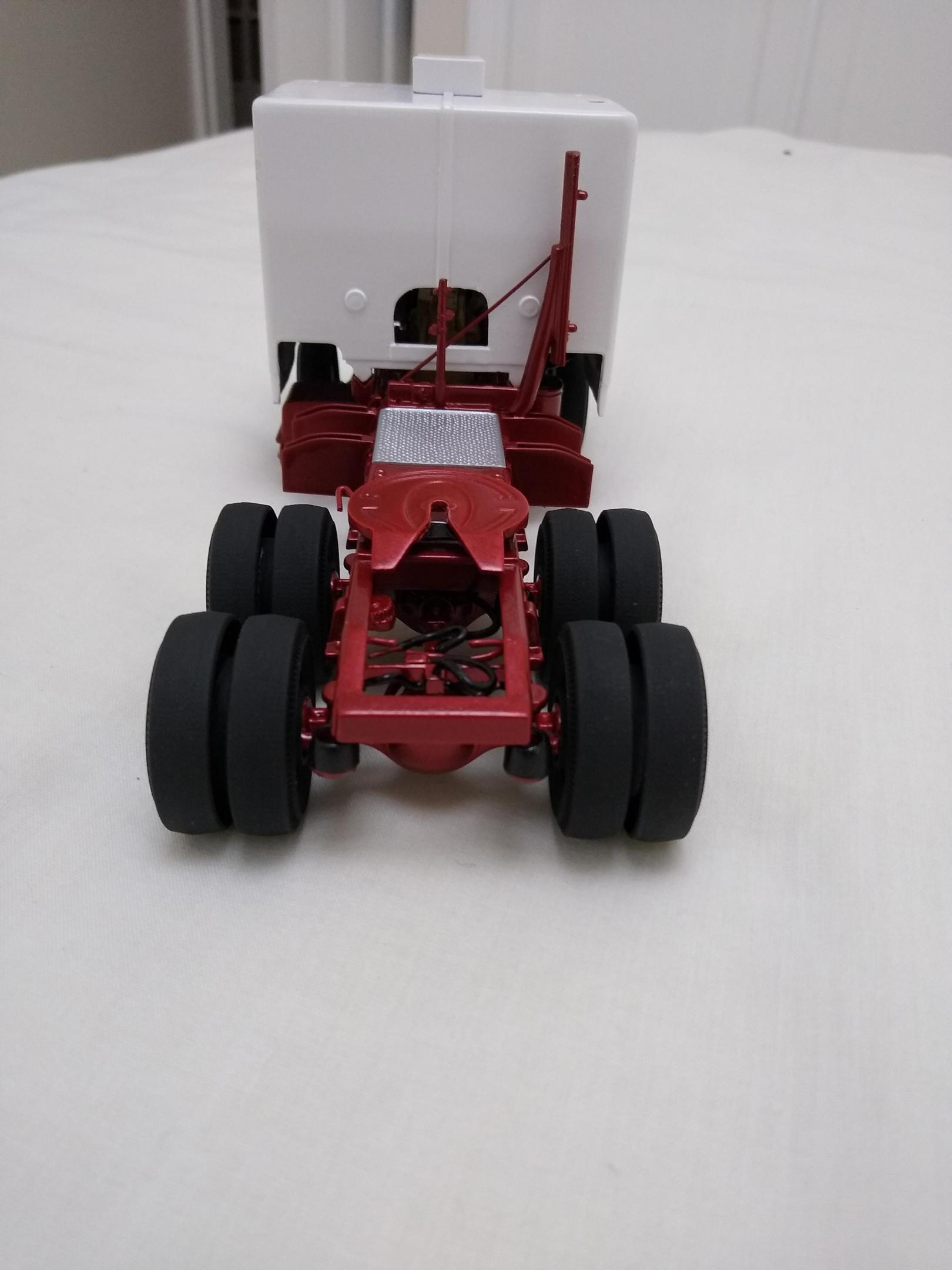 That red chassis really pops! Paint job on the cab looks great. The decals make it easier. Salem paint scheme is fantastic looking. Are they the AMT kit wheels? -
