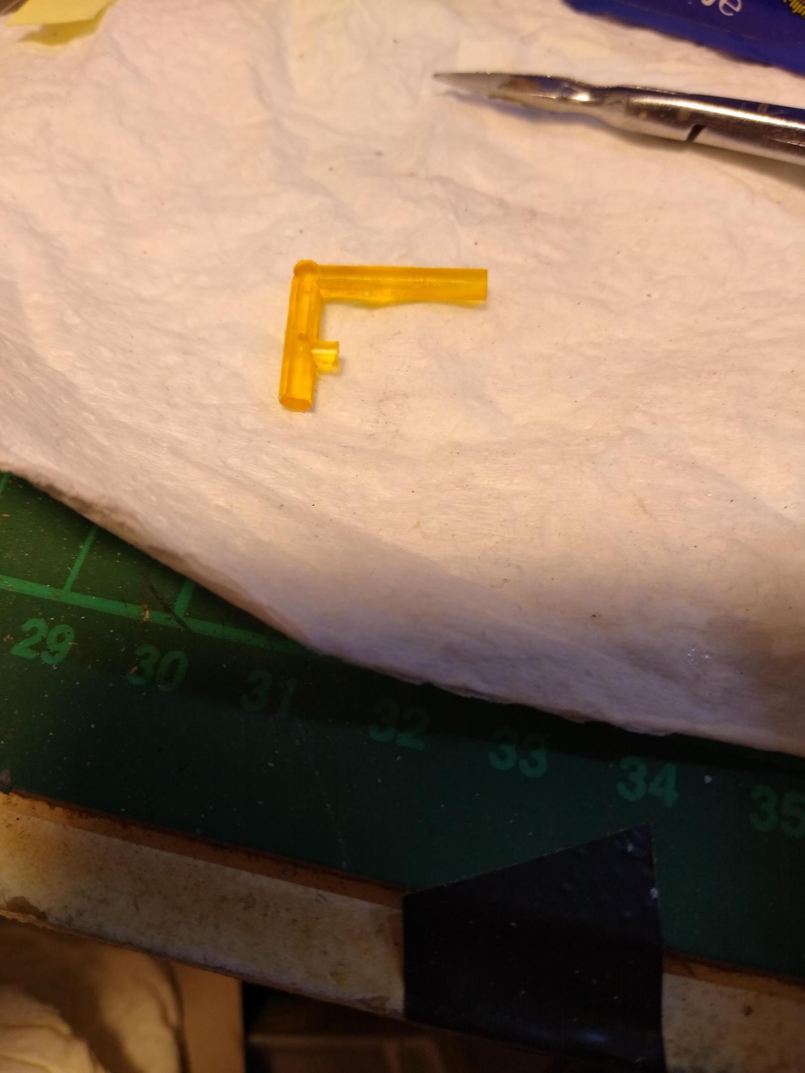 Fitted the rear shocks today, took me an hour and only I can see them!!! Why do we do it? Also fitted my air hoses around the pogo stick, front licence plates from the kit on a board under the front bumper. One thing I have wanted to do is add the round flashers on the front of the cab. I am very aware that at 1/32 scale they'd be so fragile someone would only have to cough and they'd fall off. So, I had to be resourceful. I snipped off a piece of amber sprue from an AMT 1/25 kit and filed an annular groove in it. Then, I put a piece of wire in the groove and wound it tight forming a pigtail. I cut and filed the sprue until it was a thin disc bound by the wire. A little Tamiya clear orange to deepen the colour, drilled a hole in the cab and wound the pigtail into the hole. I now have more realistic, translucent and tough lamps. Much better than the ones the kit tacks onto the mirror brackets. I'm very pleased. I'm now trying to draw up my Winslow stripes on Inkscape which was recommended to me by Peteski, thanks mate. In typical make style I faffed around with it for four days fruitlessly before deciding to read the manual and knocking out a simple pattern in half an hour! Long away from a set of cab stripes but it's very interesting. -