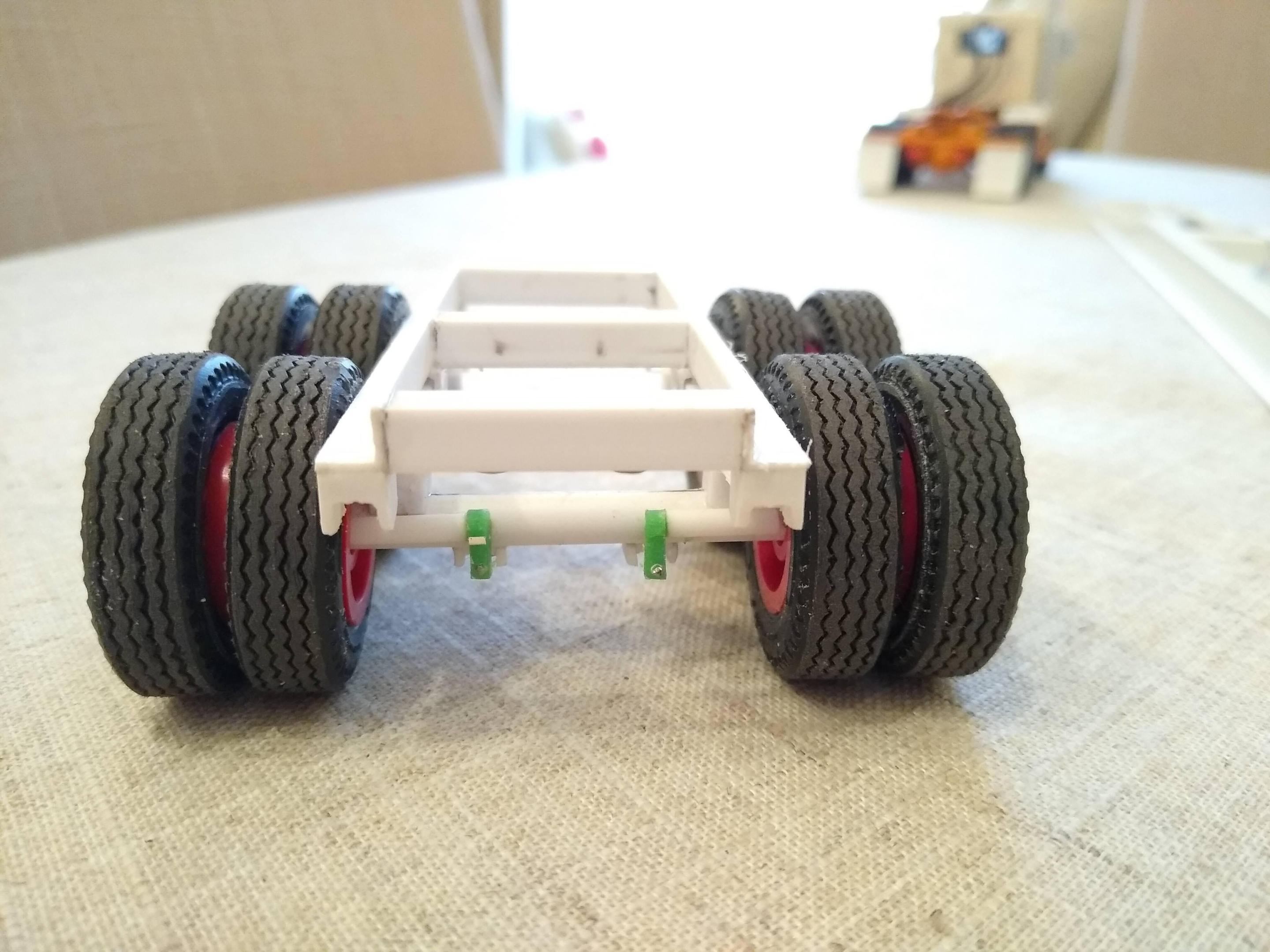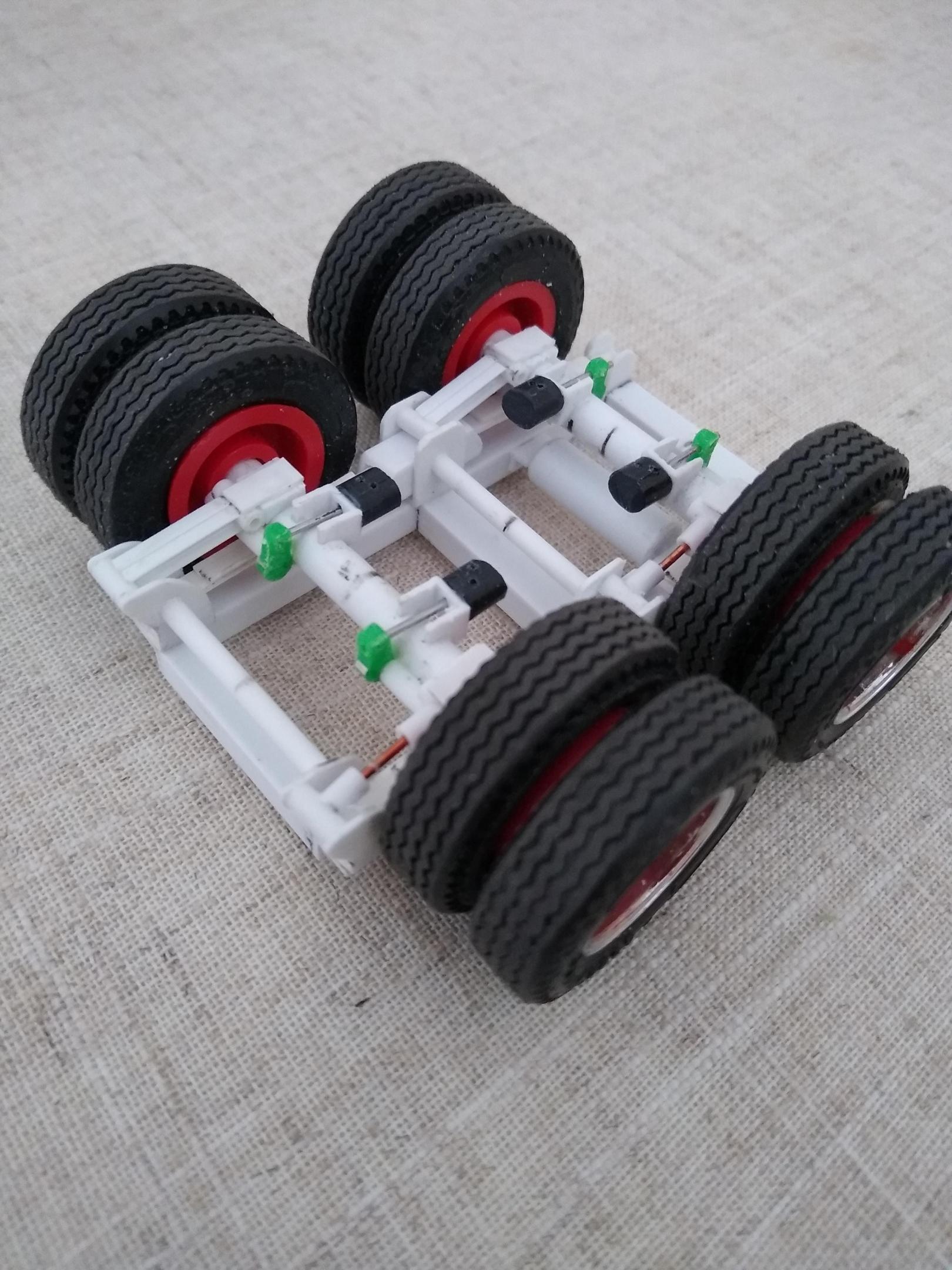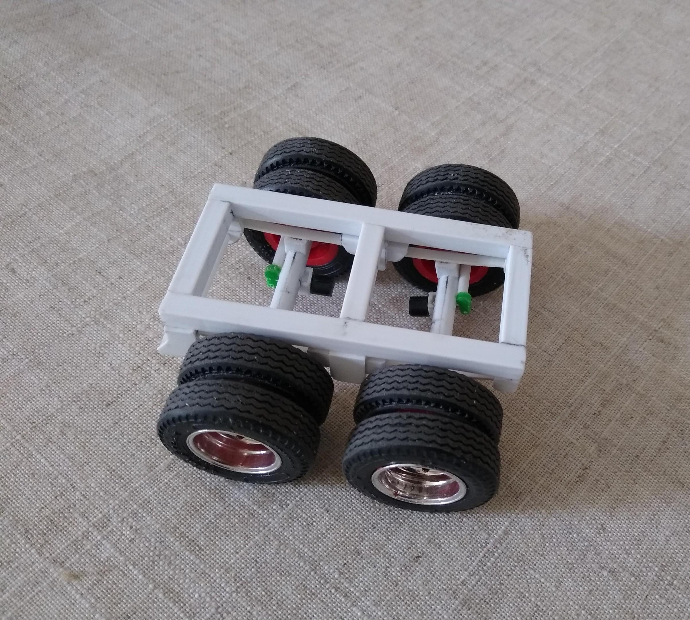 Finished building the tandems, added the air tank and track rods, on the track rods there's an adjustable one and a fixed one on each axle. To me it looks an utter shambles but it's the best my fat hands and middle aged eyesight can do. I can't seem to cut or file anything straight! Fitted the axles which was a bit scary because I wanted to rectify something that taints the Trailmobile van trailer for me. Because the wheels and tyres are smaller than scale, they look too far apart at the scale axle spacing so I wanted to bring them closer together. The AMT spacing is 8mm at the tyre tread; I settled on just under 6mm for the right look. Seems to have worked when you put them side by side. Fabbed landing gear using the 'extended' legs from the Monogram Fruehauf van. By using hollow square tube I can make them operate too. Still to do the reduction gearbox and winding handle. -