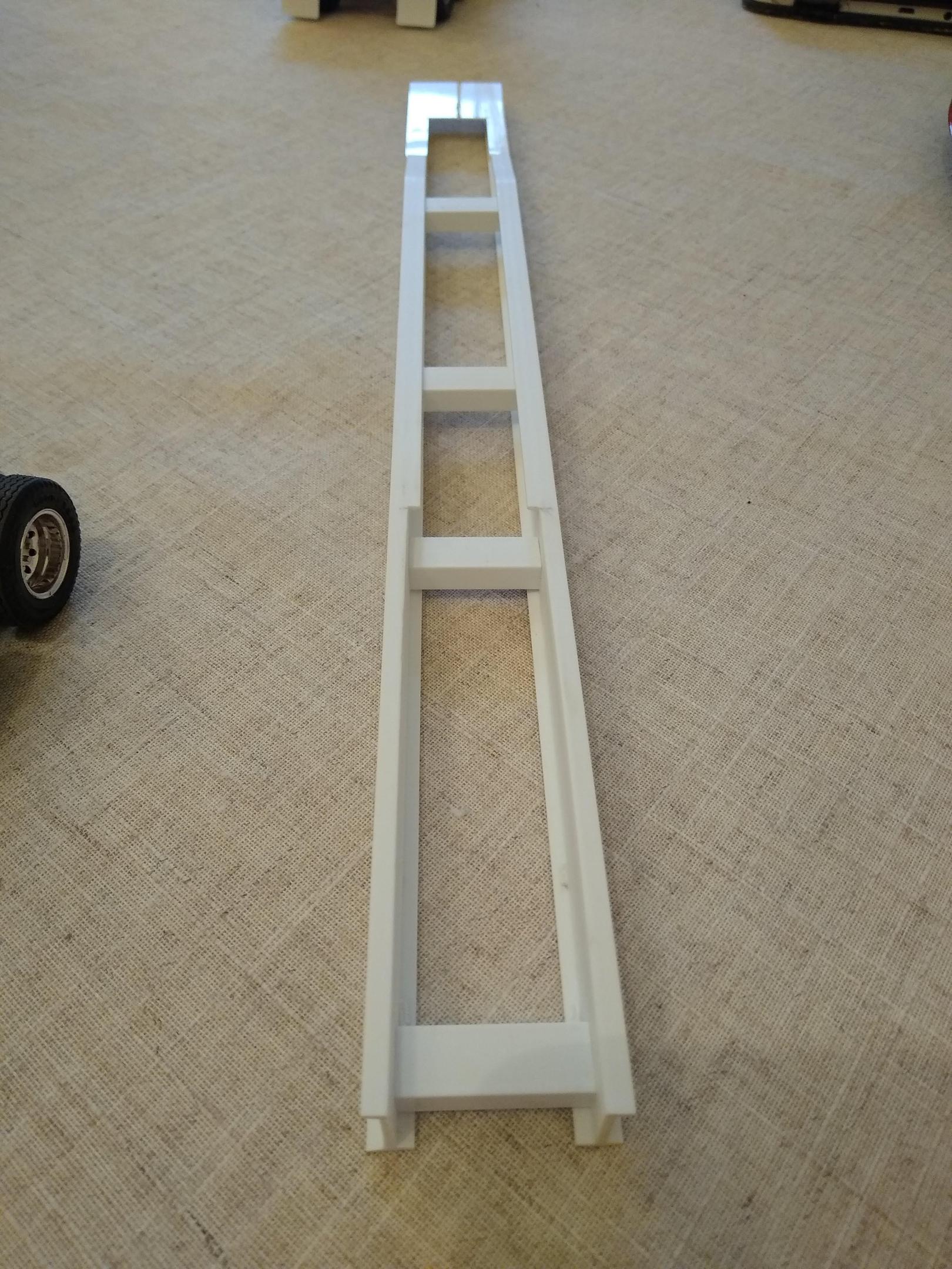 I've wanted a flatbed for my 1/32 fleet for a long time but the only trailers available are vans, reefers and the tanker. I suppose I could look for a diecast I could modify but I couldn't see anything suitable so, after seeing the work done on here I decided to build my own. I really shouldn't, I've got four jobs on the go already. I bought various channels and profiles along with two 14mm I-beams for the main structure. I built a subframe for the steel suspension fashioned after a Trailmobile unit. I fabbed balance beams and spring mounts. Built two axles with brake chambers and slack adjusters. I'll use AMT wheels and tyres from a scrap K100 Aerodyne. I still have to build the track arms that locate the axles. I was going to taper the frame at either end but decided to go for just the neck at the front with the full depth running the rest of the length because I hope to be able to have the suspension sliding. A very rough mock up looks ok.