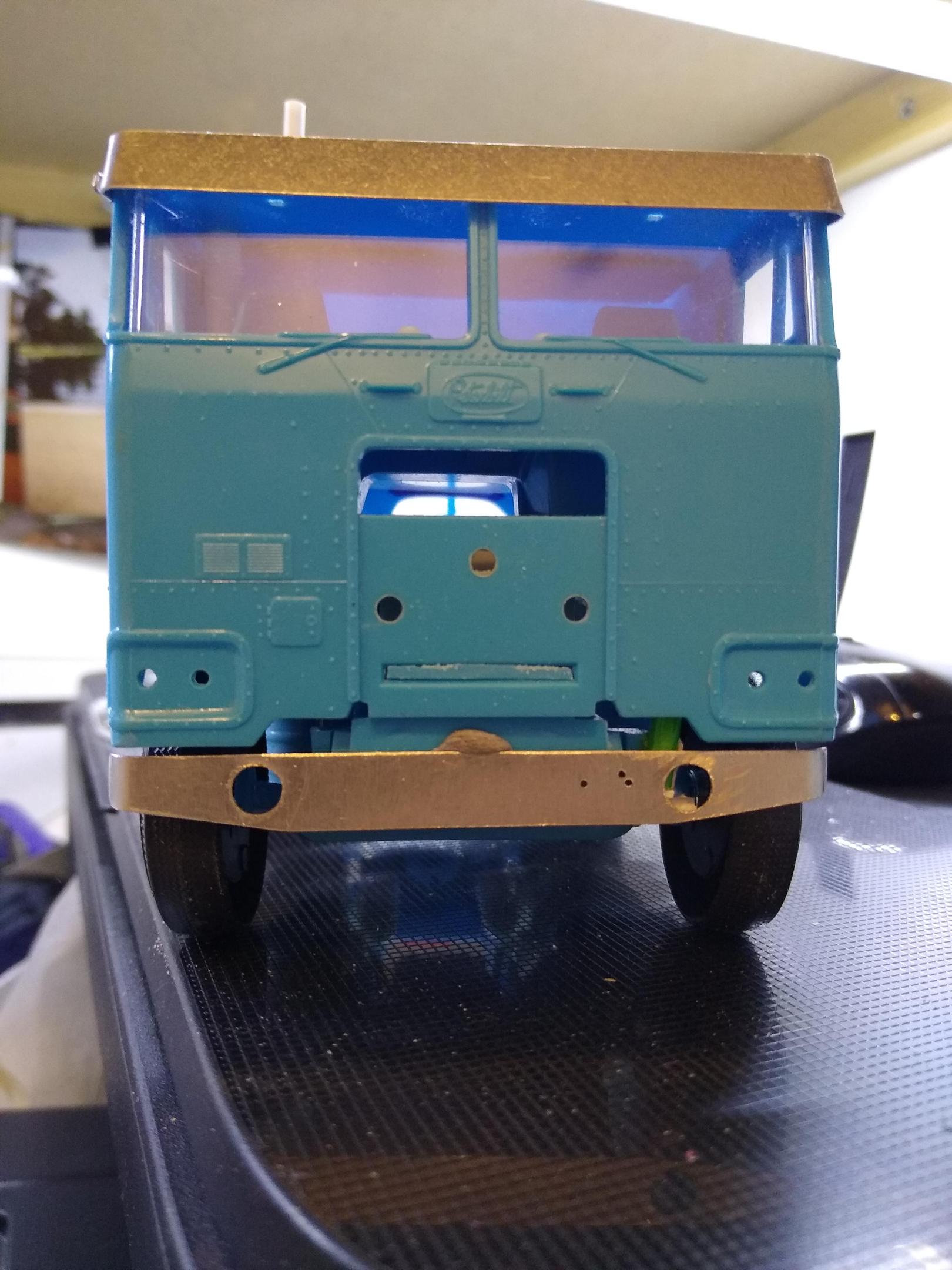 I got two bites at the cherry this week. Wanted to sort this bumper situation. I laminated three strips of plastic card together and let them set properly. Then I shaped the basic bumper but I was hesitant about drilling and shaping the tow lug cutouts because they're very close to the top of the bumper. So I made it 1mm smaller than required, filed two notches for the tow lug holes and then put strip of card across the top. Rounded all the corners off and it looks ok. Then I decided I wanted the spotlights too, so I took the kit bumper and cut to the top off, then let the tow lug holes in again and put a strip across the top. Rounded the edges again and I think this is the one I'll be using. It looks a lot better than the kit piece, but the kit piece looks ok on the double sleeper because that's a more showy truck I think. -