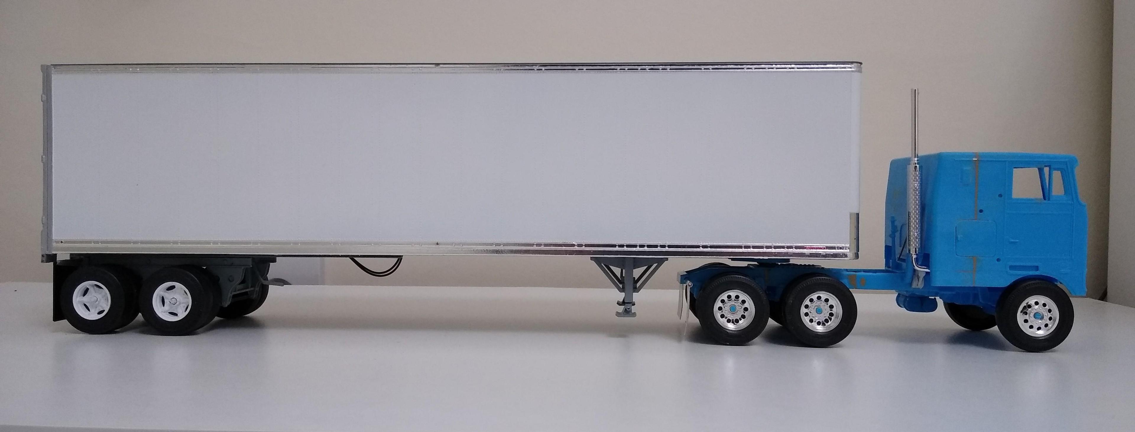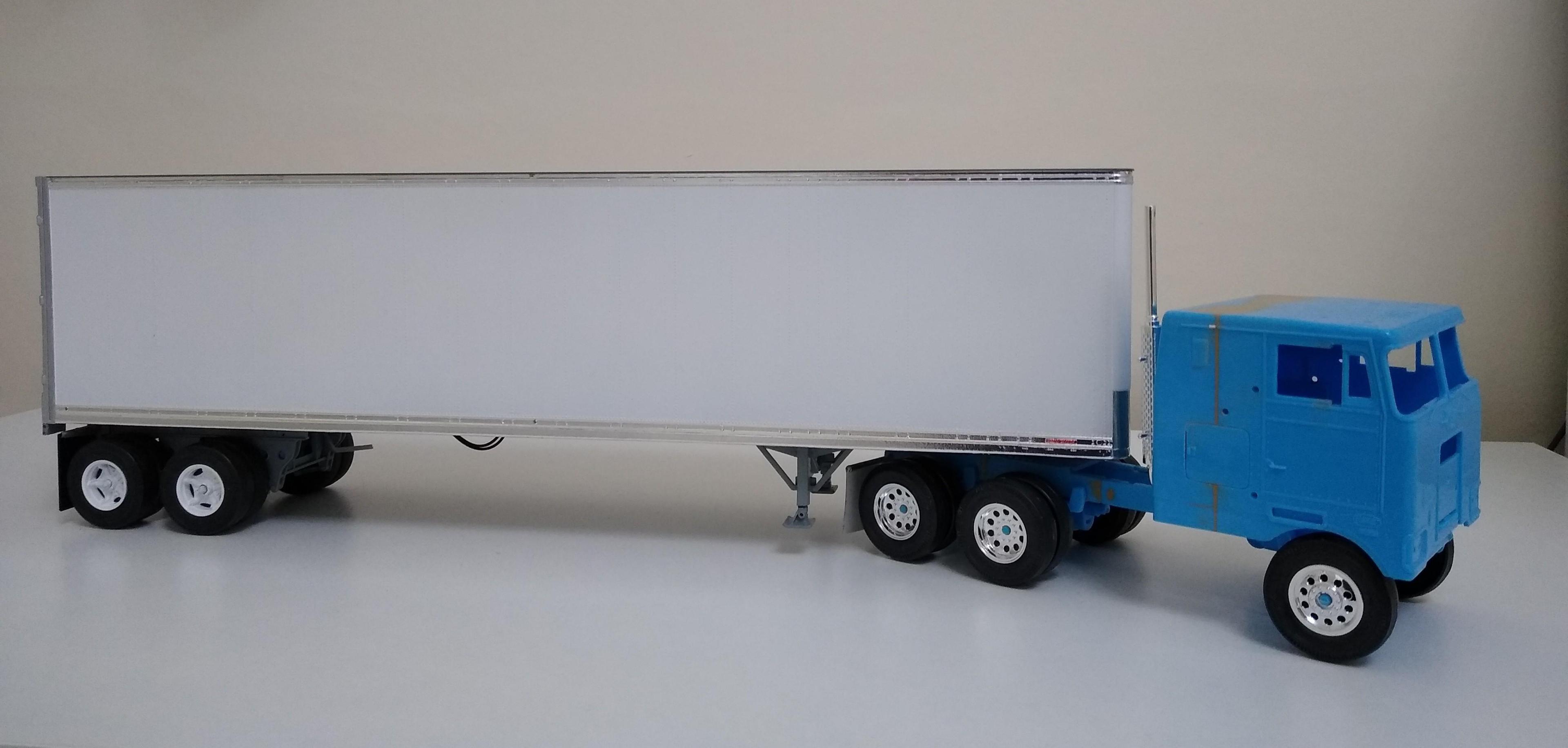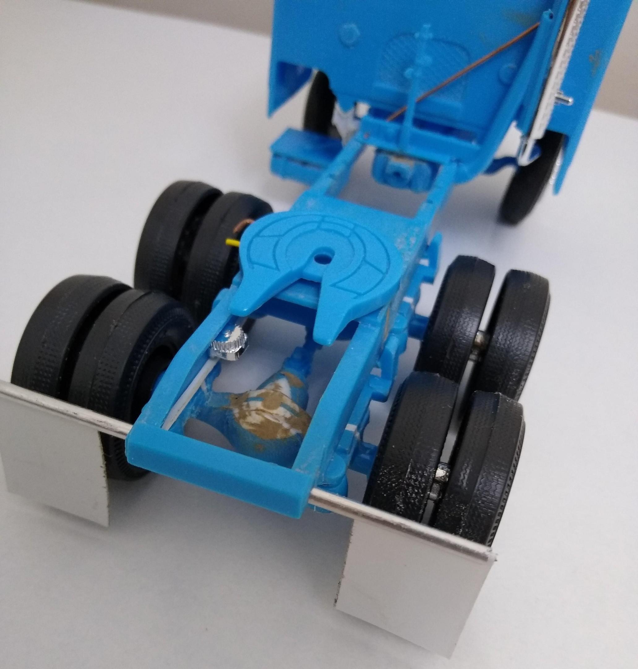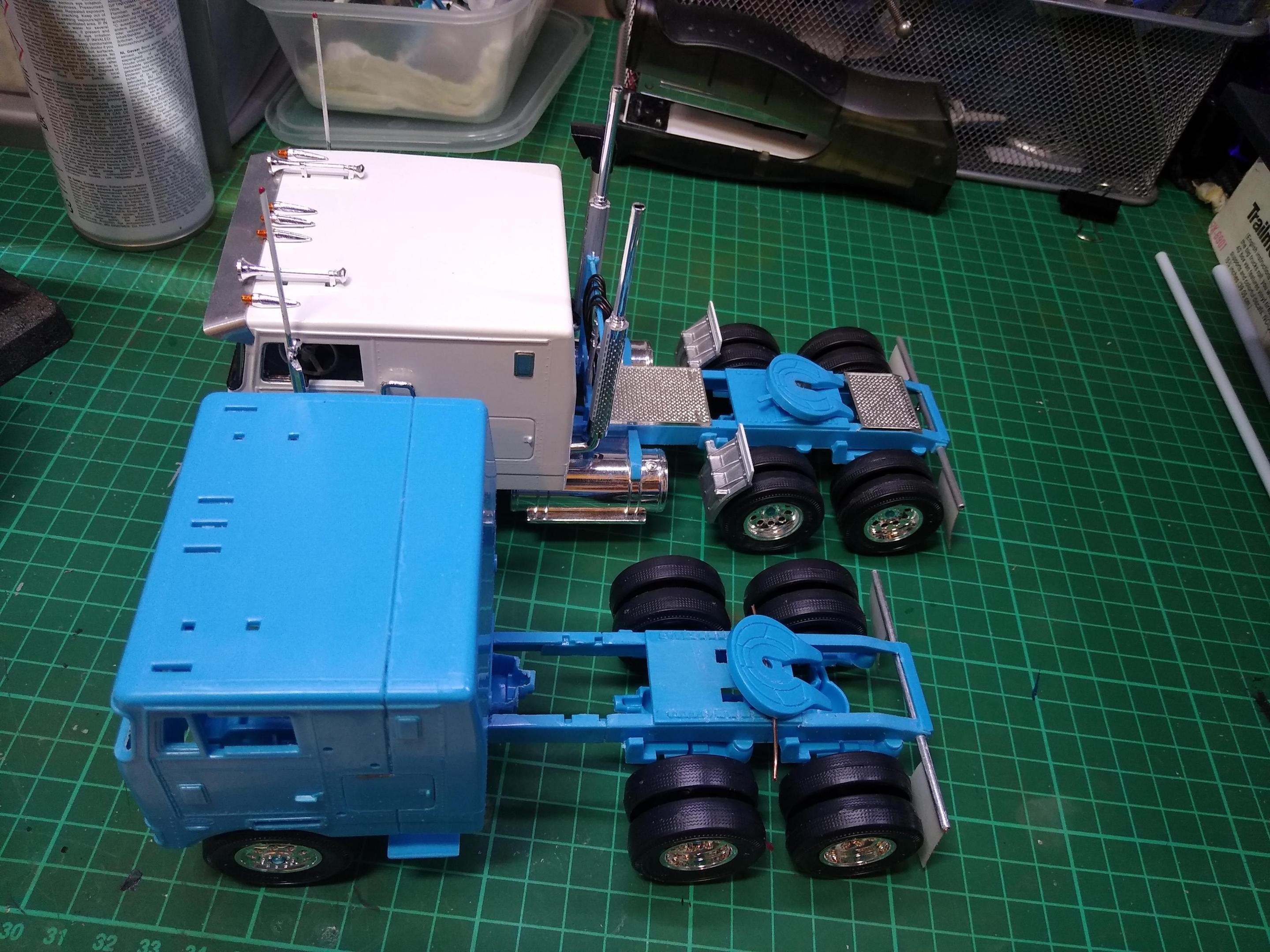 I can't resist a mock-up but I felt I had to this time to determine trailer clearance. I popped the axles and wheels on. Couldn't resist making my mudflaps too. Sat her next to her bigger sister for comparison. -