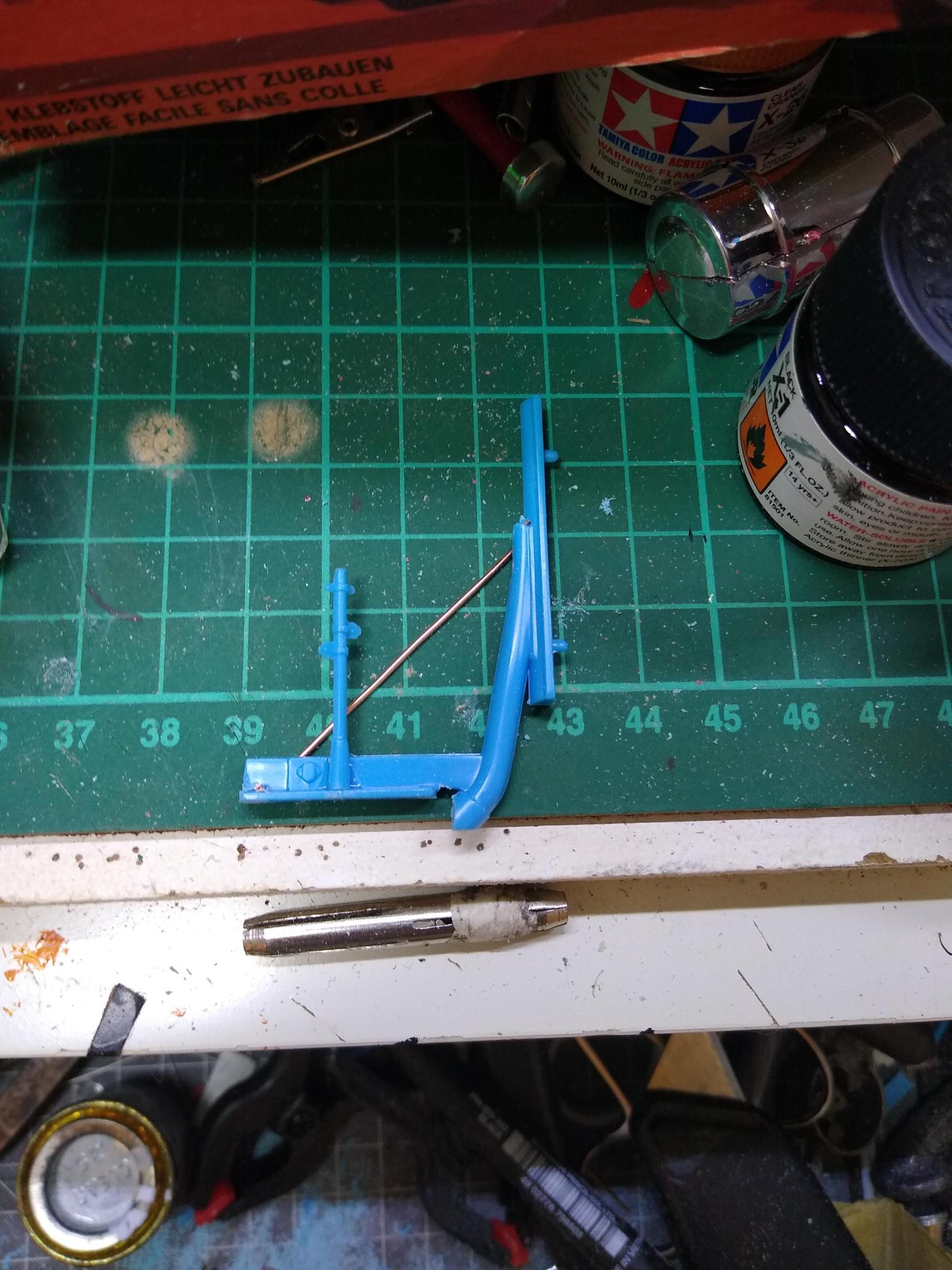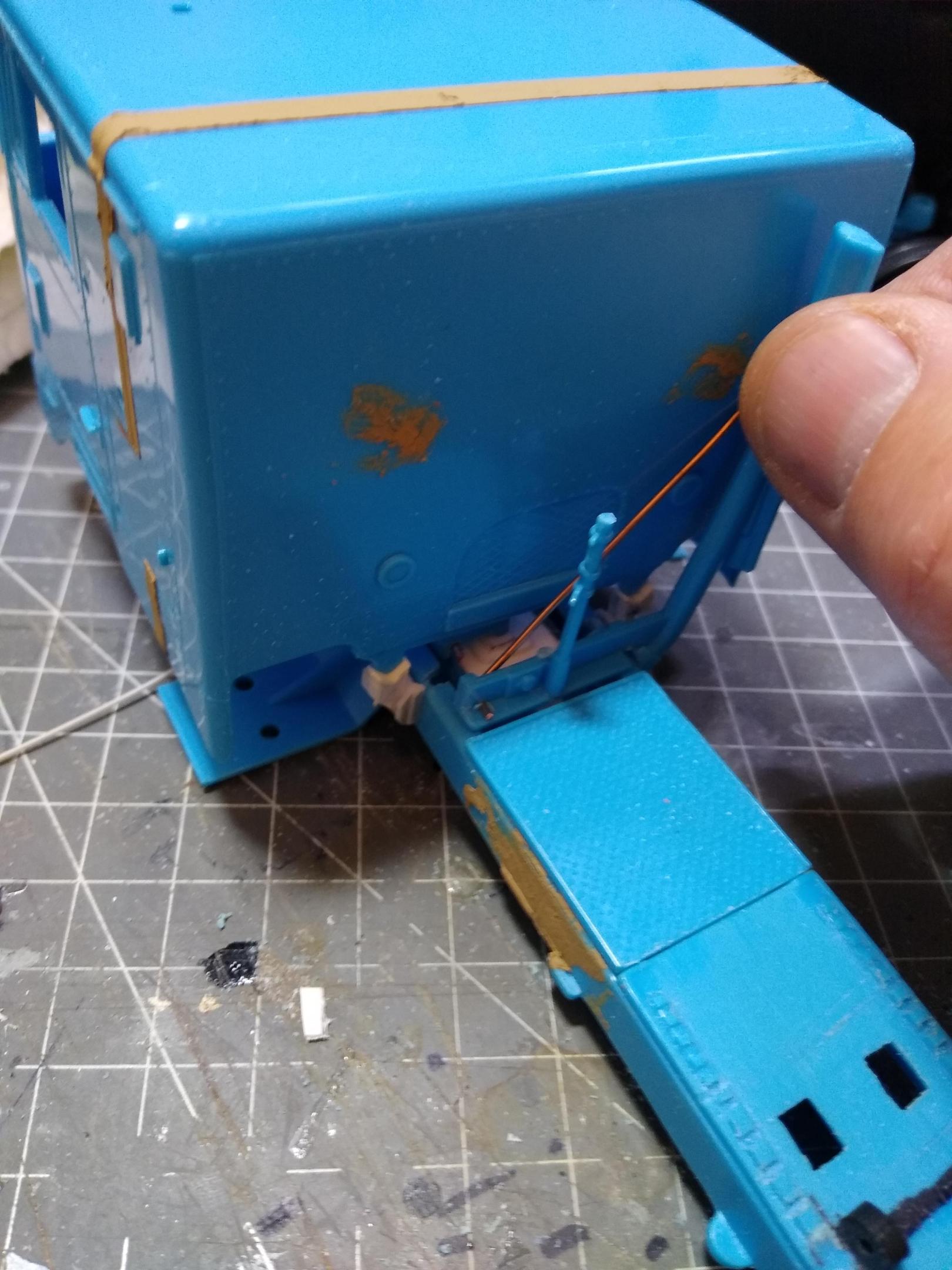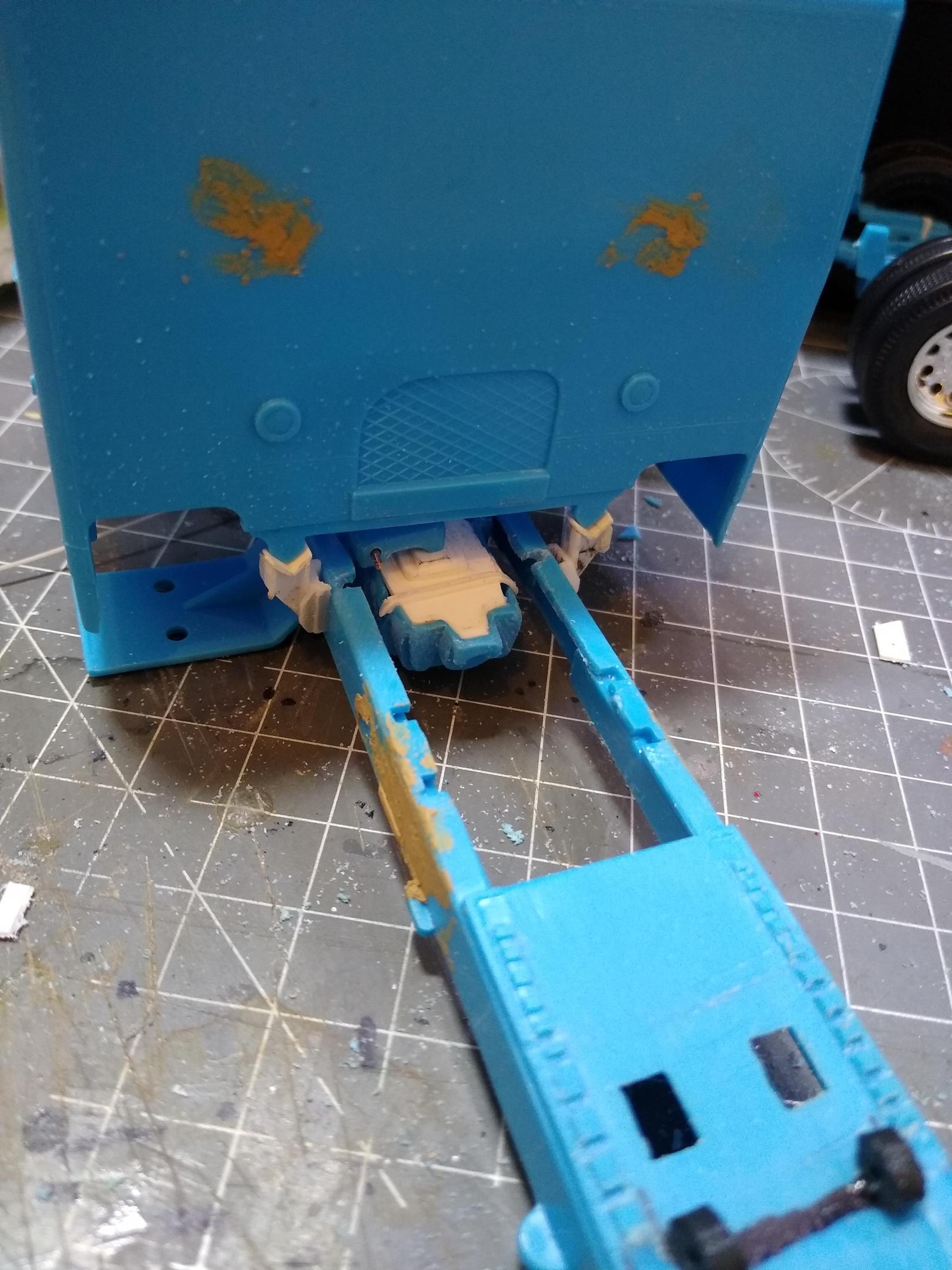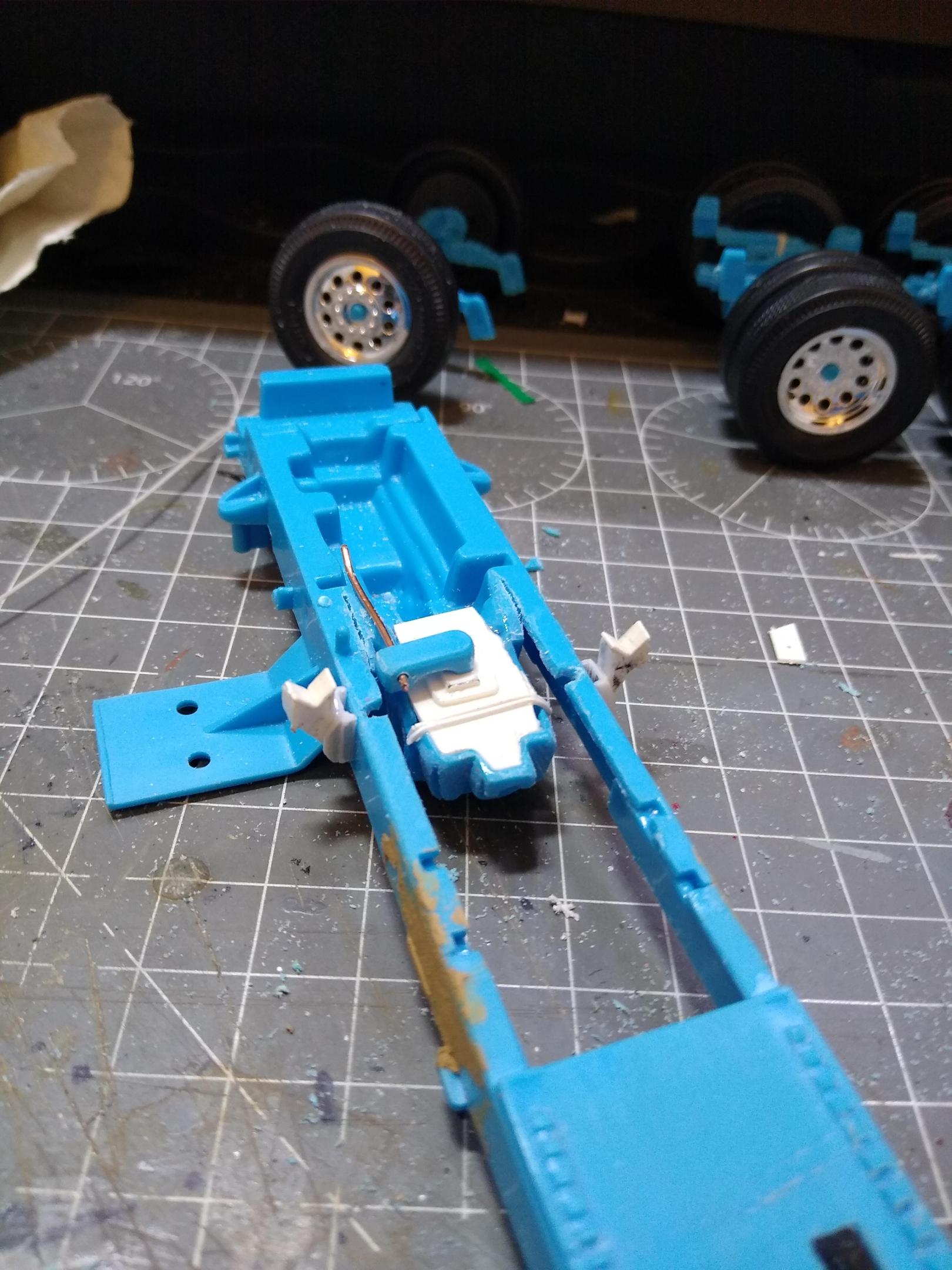 Glued the two chassis pieces together, always a worry making sure that the thing is straight. Took the saw to the driver's side exhaust mount and rigged a new diagonal brace out of copper wire. I've got about three weeks of filling and sanding on the cab and the chassis now. This is going to be a real chunky monkey. -