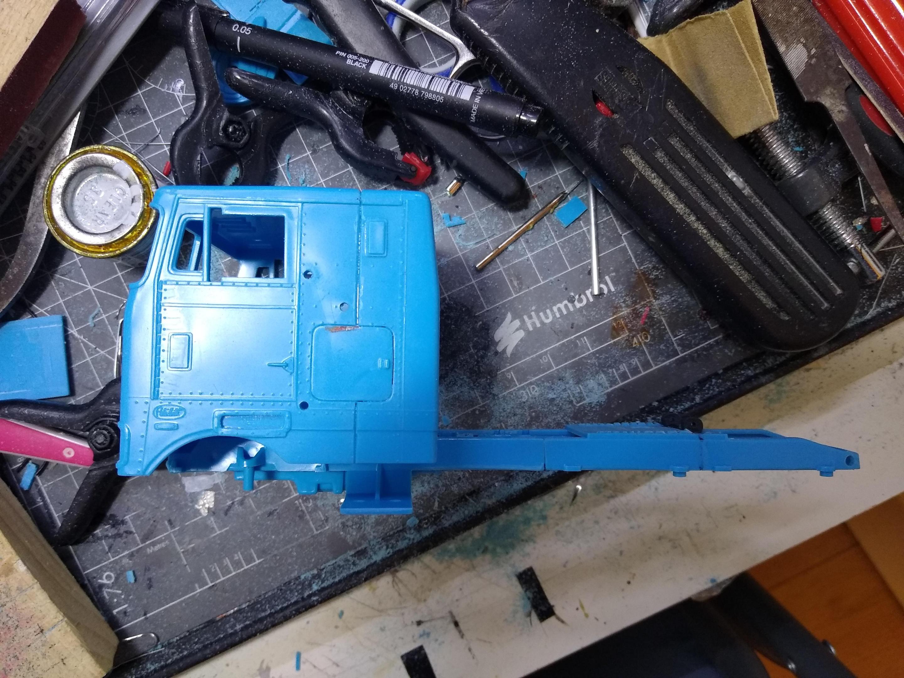 The snap fit design of these kits dictates that function stands over form. For instance, the cab has a hidden locating slot at the front but the rear has two tangs that clip into the chassis. Monogram hid this with the exhaust frame and pogo stick mount but with me just having one stack it's all exposed. So, I took some I beam I had from another kit and rigged up some better rear mounts for the cab, then cut the old locators off, but that exposes the hollow gearbox, so I removed the moulded in piece of frame surrounding the gearbox and formed a lid and selector box out of sprue and plastic card. Looks ok. I also did my first pass with the stopper on the cab seam. I put masking tape either side of the cut so I didn't end up with stopper all over the cab. Not sure whether that was a good move yet. I'll see when I start rubbing down. -