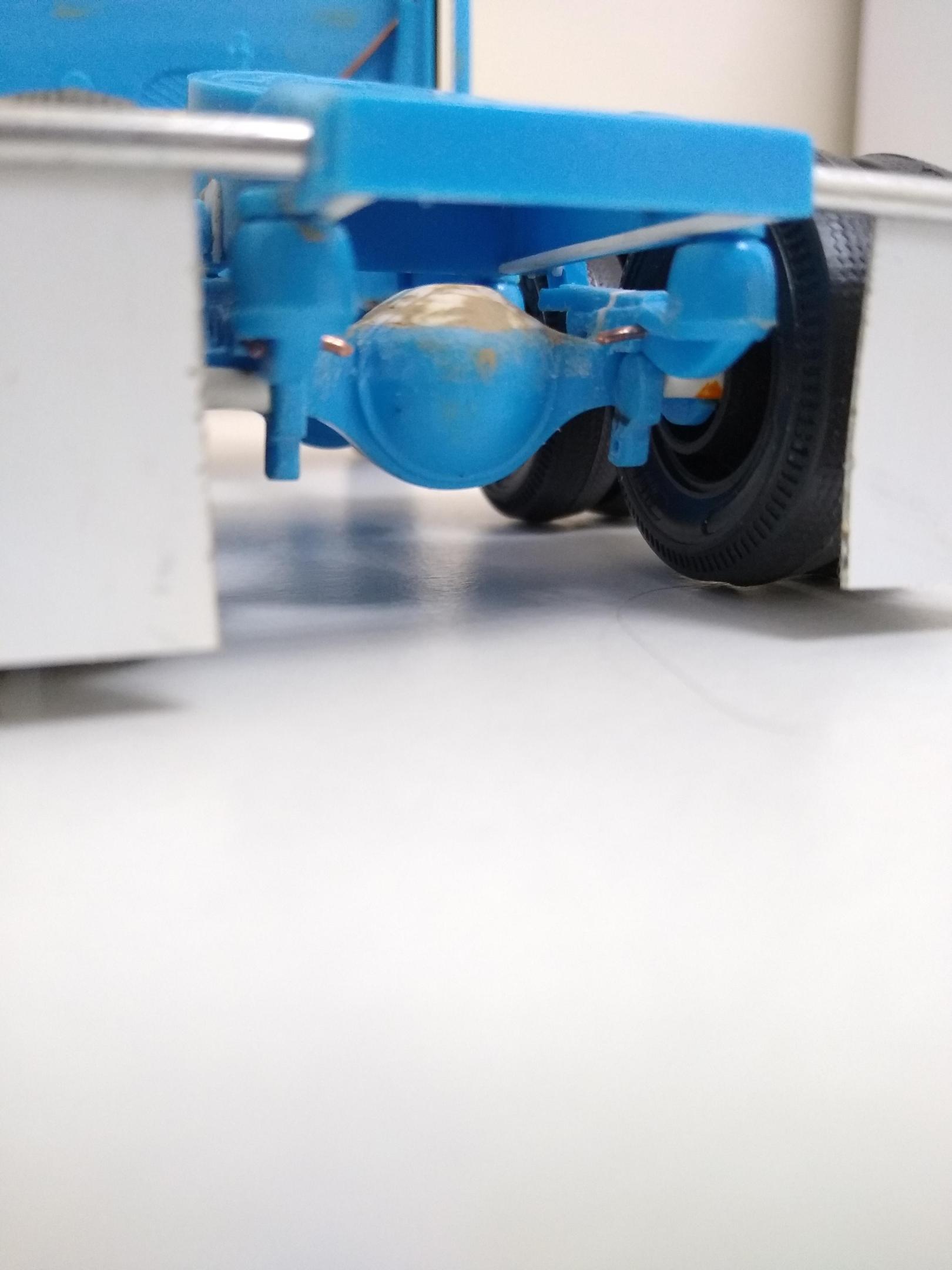 Got a bit more done to the Pacemaker. Added a lower flange to the chassis, used a Camaro alternator for a brake relay valve, filled and profiled the rear axle and suspension arms and installed the exhaust bracket and pogo stick. Mocked up a stack to see how it looks. Still got my usual brake chambers and piping to add, also rear hubs on the drive axles. I like the way the gearbox hangs separately in the frame as it would in the real thing. Also filled and sanded the joint in the cab about three times. Lot more of that to come I think but looks ok. Going to add the intake pipe through the cab on this one. Thinking about fuel tanks now. Don't think I can use anything from this kit or anything else, I'd have to do so much cutting they'd be destroyed. I'm thinking of 20mm electrical conduit but not sure if that would work with any adhesive. ? -