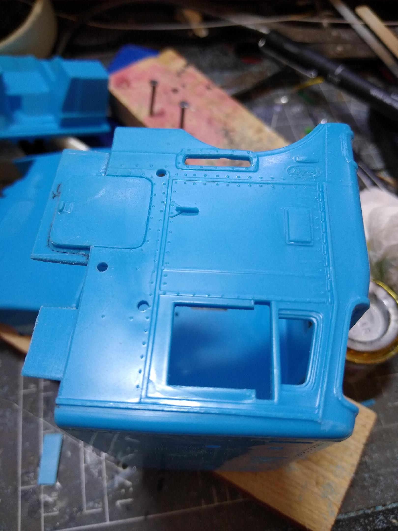 I've always loved the look of the AMT Peterbilt 352 Pacemaker cabover. It's very compact and beefy looking. However, the prices are nuts and I've quite a fleet of 1/32 trucks now so I'd like to stay in that scale. I fell on the Snaptite double sleeper 352 for a good price so I'll have to cut it down and shorten the chassis too. First to reduce the cab to a single sleeper. I decided to cut around the locker door so I don't have a line going through it. It also keeps the air vent and the holes for the grab handles. Quite terrifying but taking care with my marking out and cutting it seems to have gone ok.