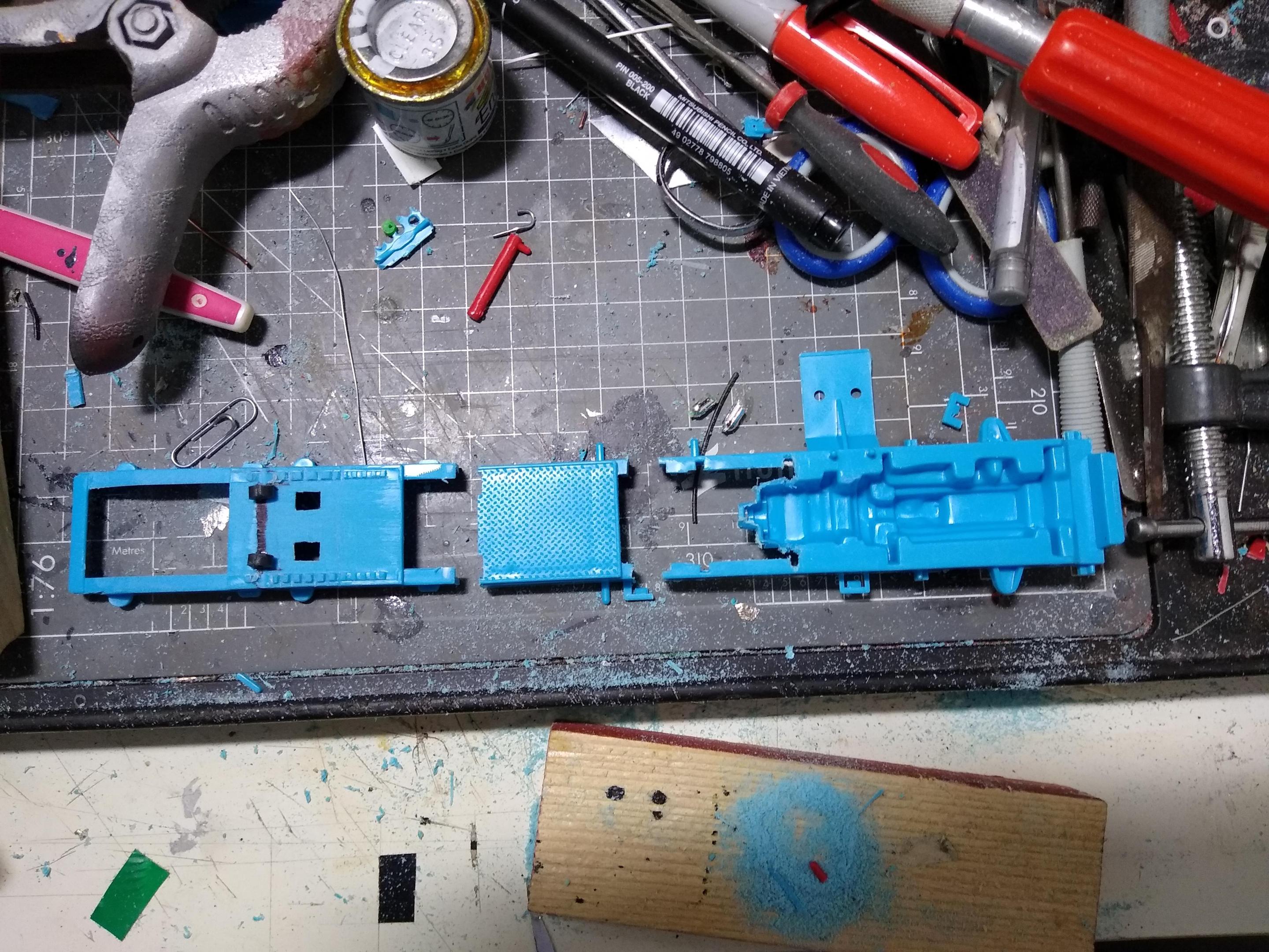 Did a little bit more yesterday. The first time I built this kit was in full lockdown in the first wave so I could only work with what I had, and that was one rattle can of white about 10 years old. Tried improving things over that build. The steps are shallow depressions so I opened them up and put a piece of offcut behind them, just to add depth. Looks a bit better. Moved the fifth wheel back a little. Then I removed the deck plating from behind the fifth wheel and cut 33mm out of the frame. My brain was screaming WHAT ARE YOU DOING!? but it was right according to the sums I did so hopefully it will work out. -